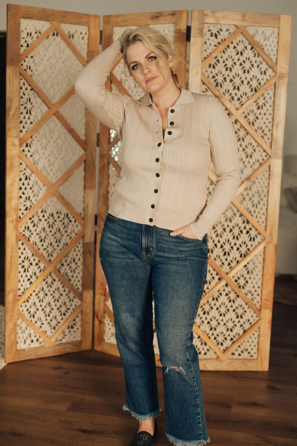 Hello, fitted cardigan. A super soft and stretchy ribbed long sleeve. Great layered or worn as is. A staple.