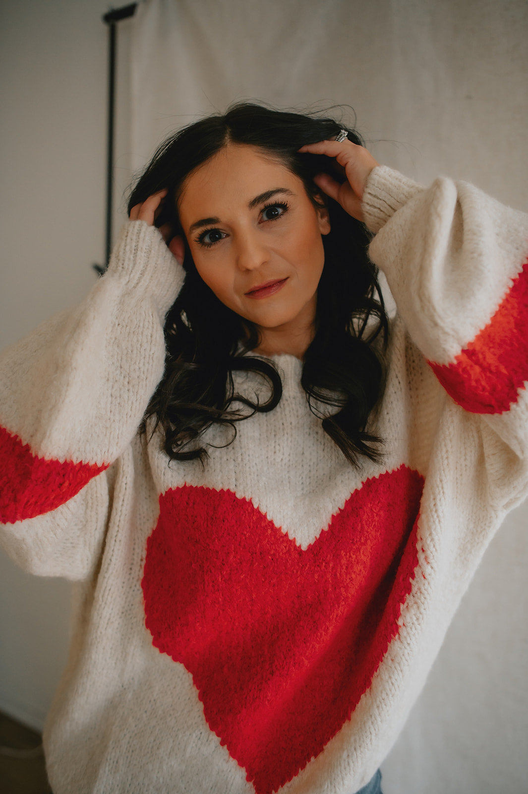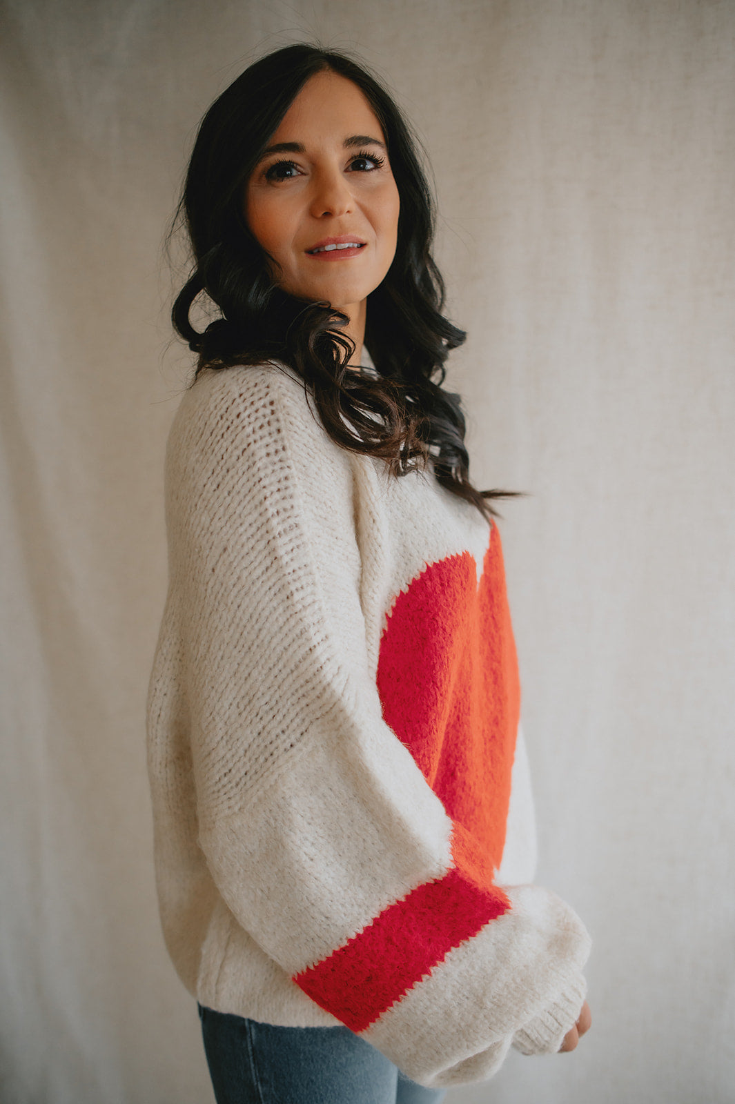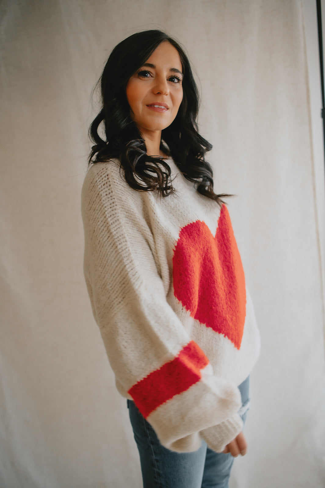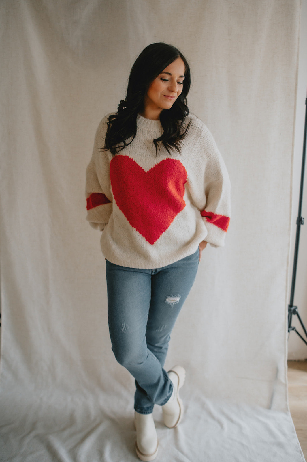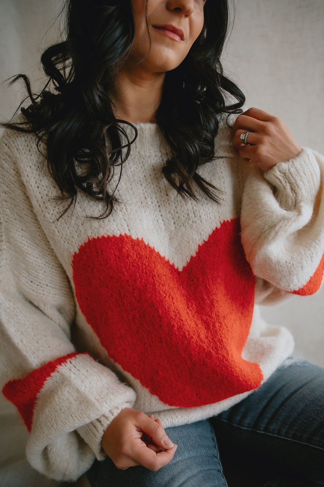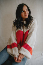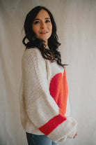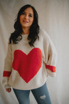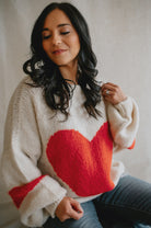 Wrap yourself in warmth and charm with this soft, chunky knit sweater in a classic cream hue. The standout feature? A bold, oversized red heart stitched front and center — playful, warm, and full of personality.