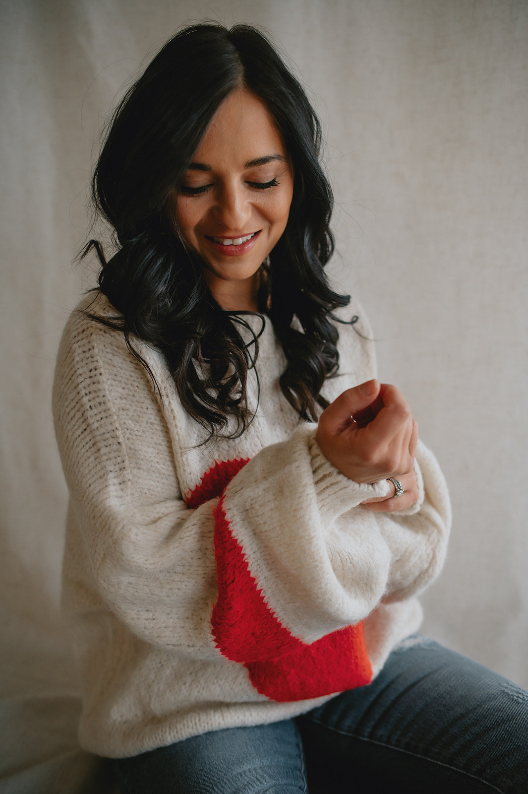 Slouchy balloon sleeves add effortless volume and comfort, while a single horizontal red stripe across each arm lends a sporty, vintage-inspired touch reminiscent of a jockey sweater.