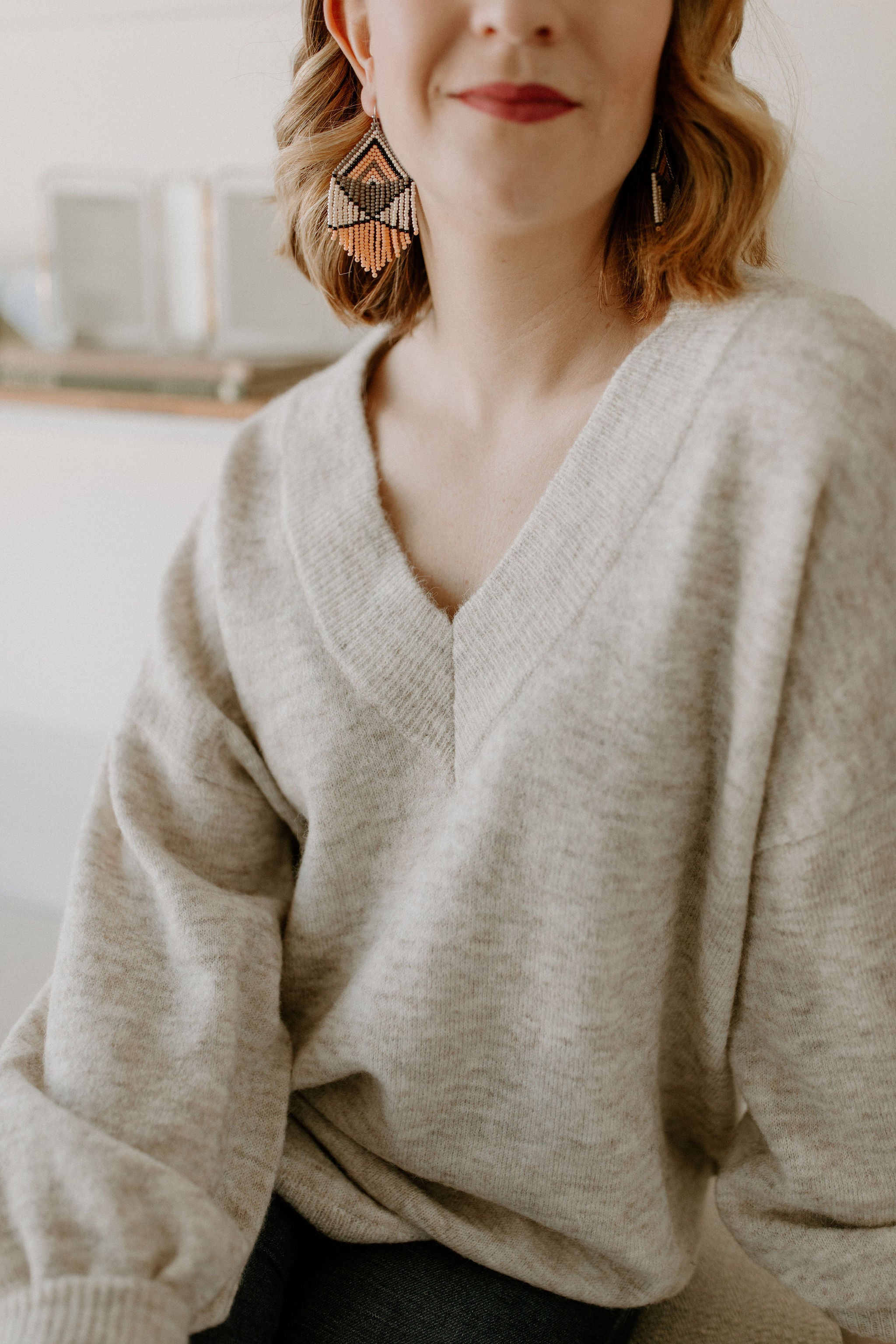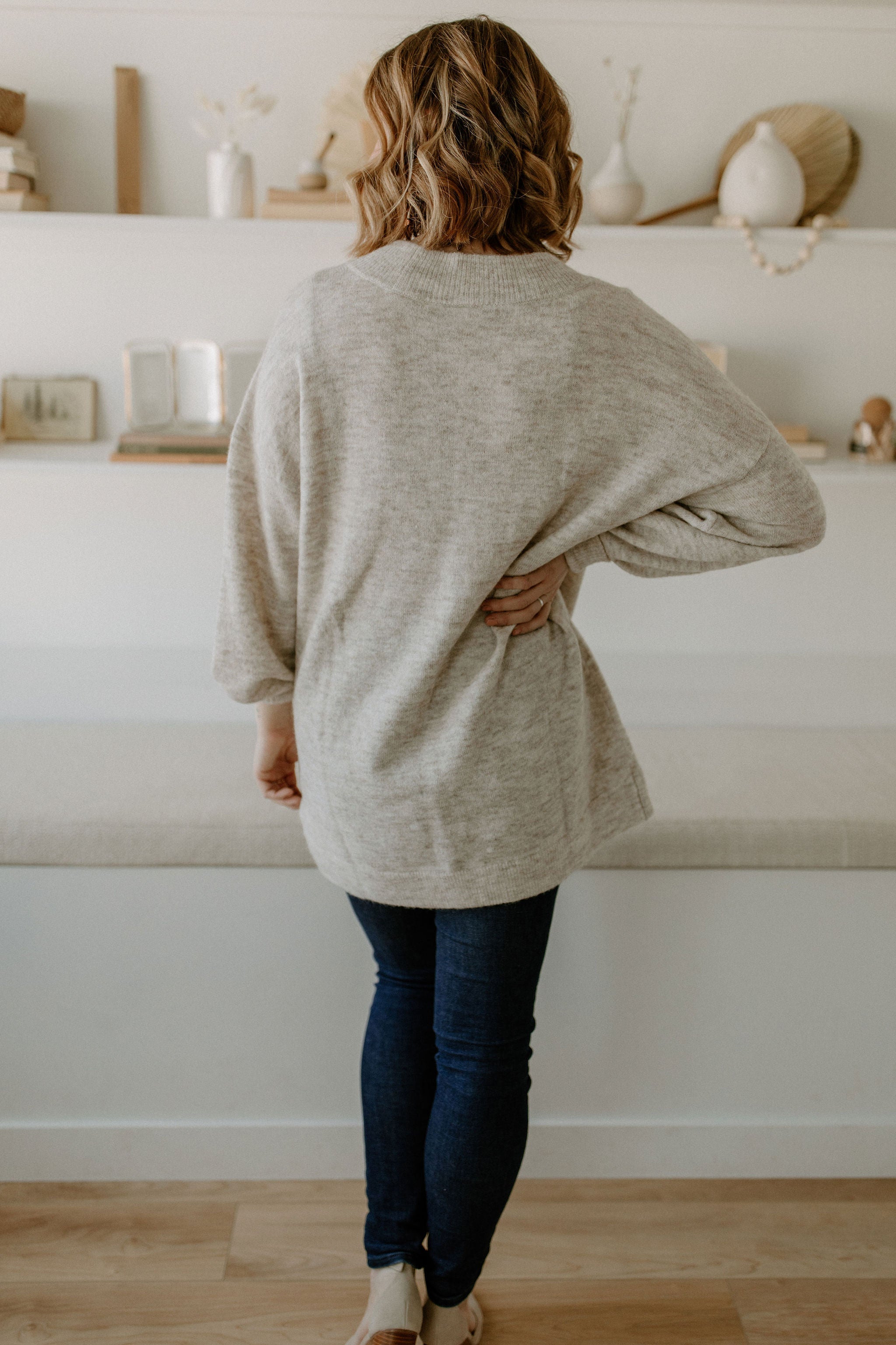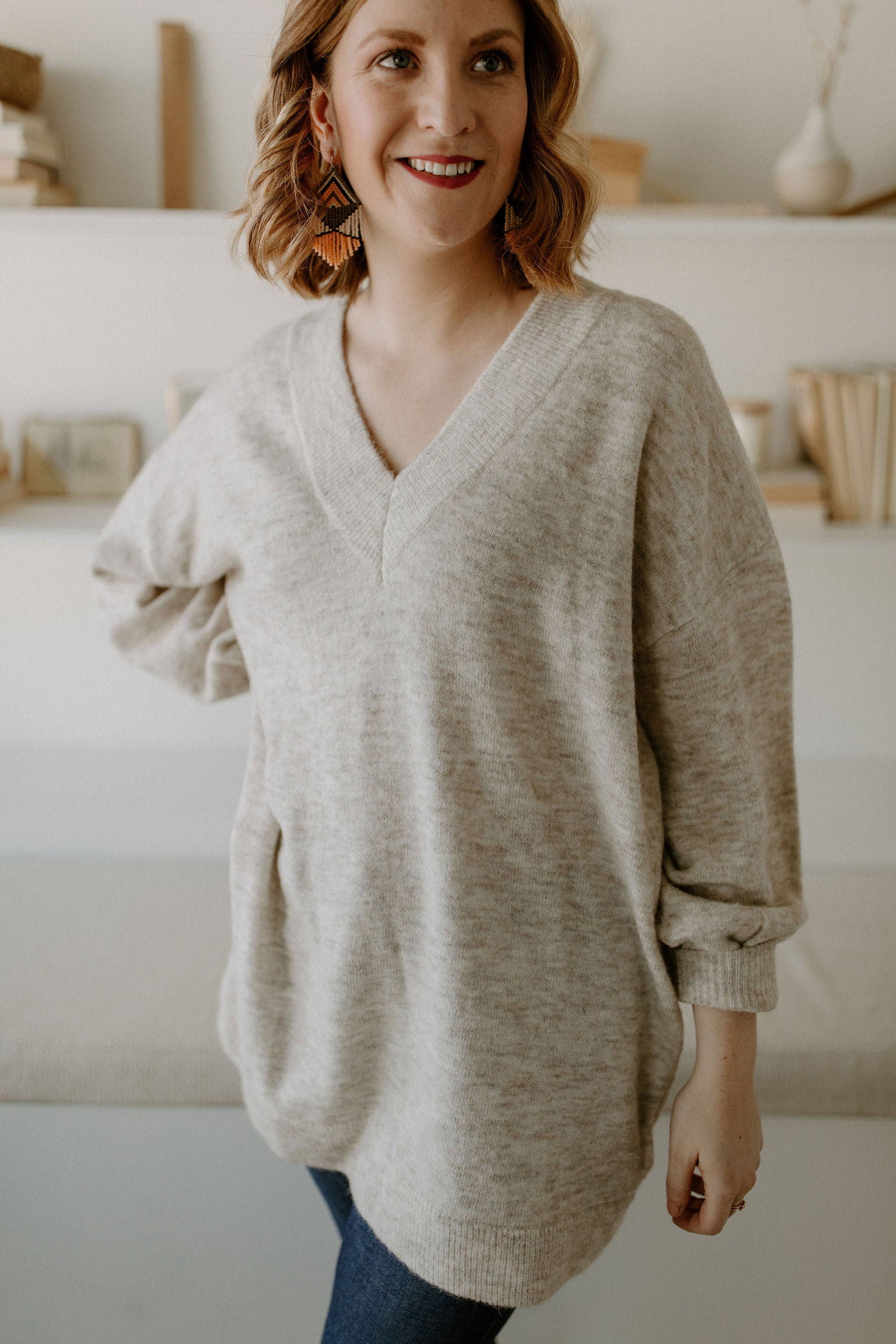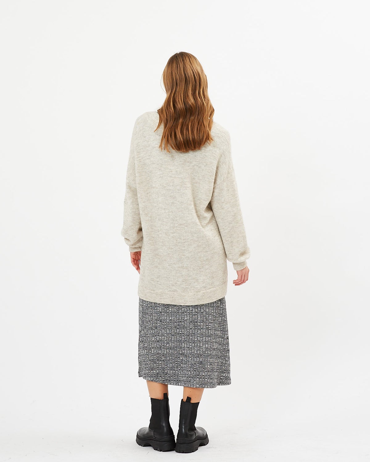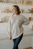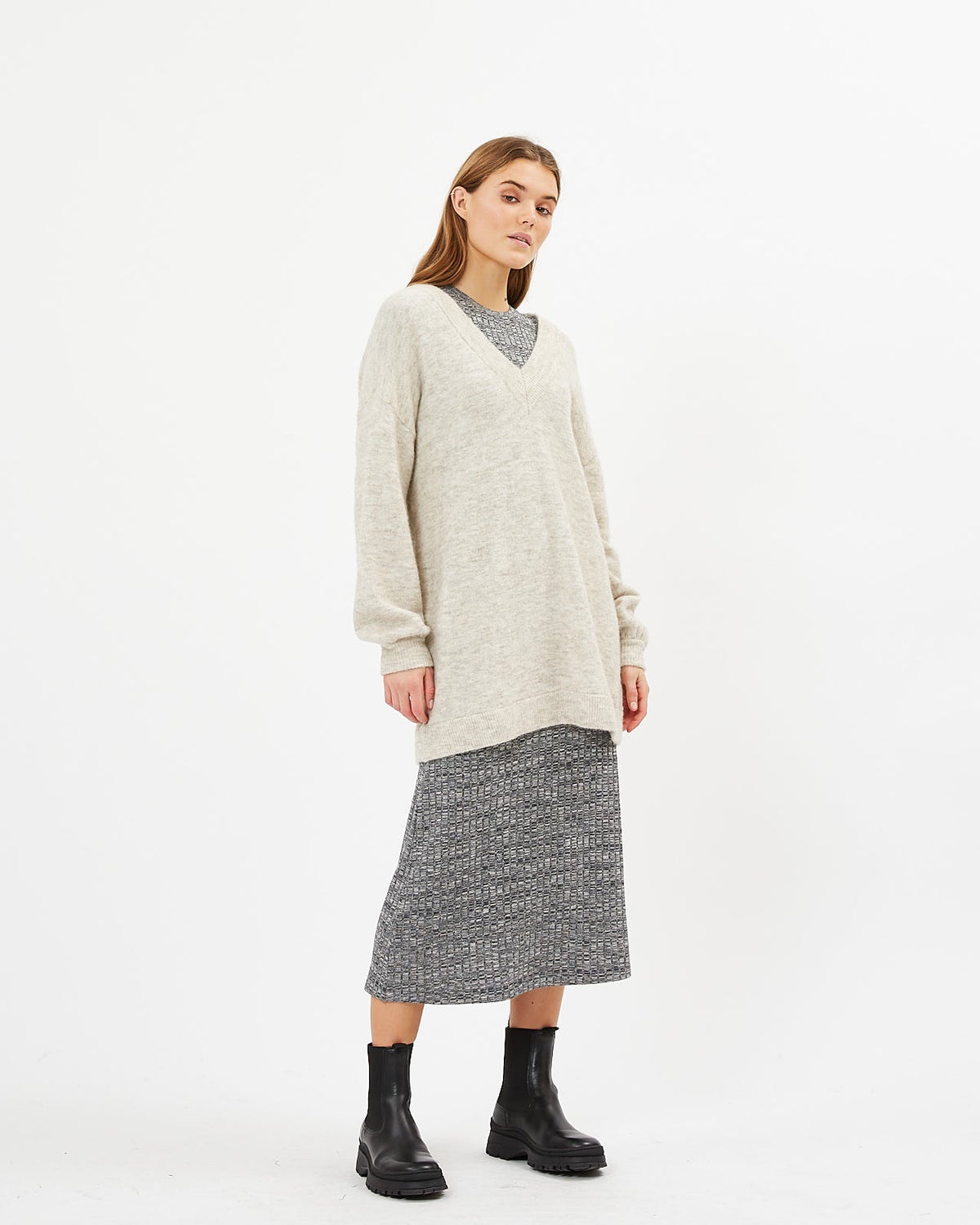 The Necka Jumper is a melange knit jumper crafted from a warm but thin wool blend with alpaca and merino wool. It has an oversize fit and drop shoulders for a casual look. Allowing you to wear this with tights as a tunic as well! The jumper features v-neck and voluminous sleeves with elastic cuffs.