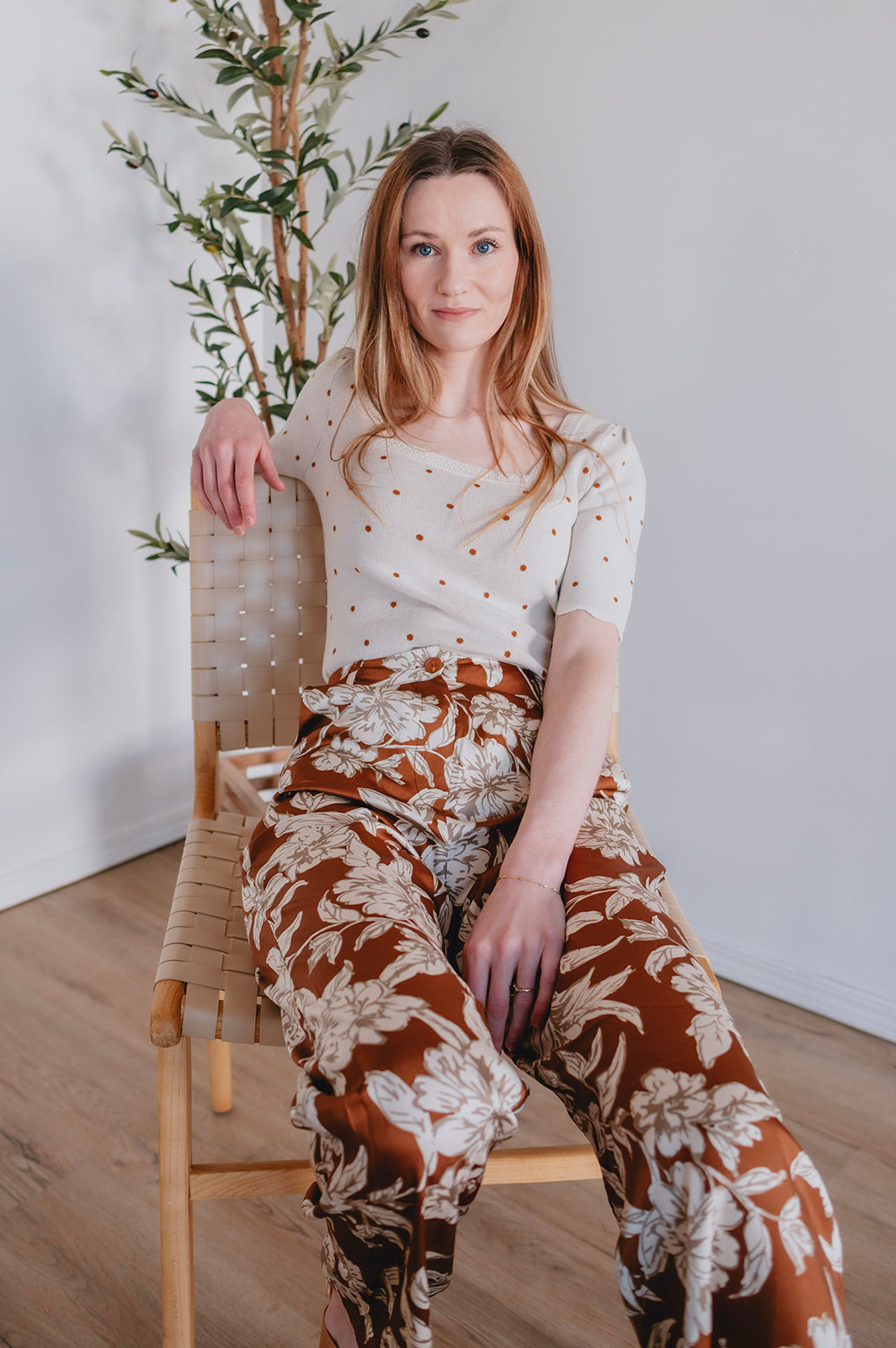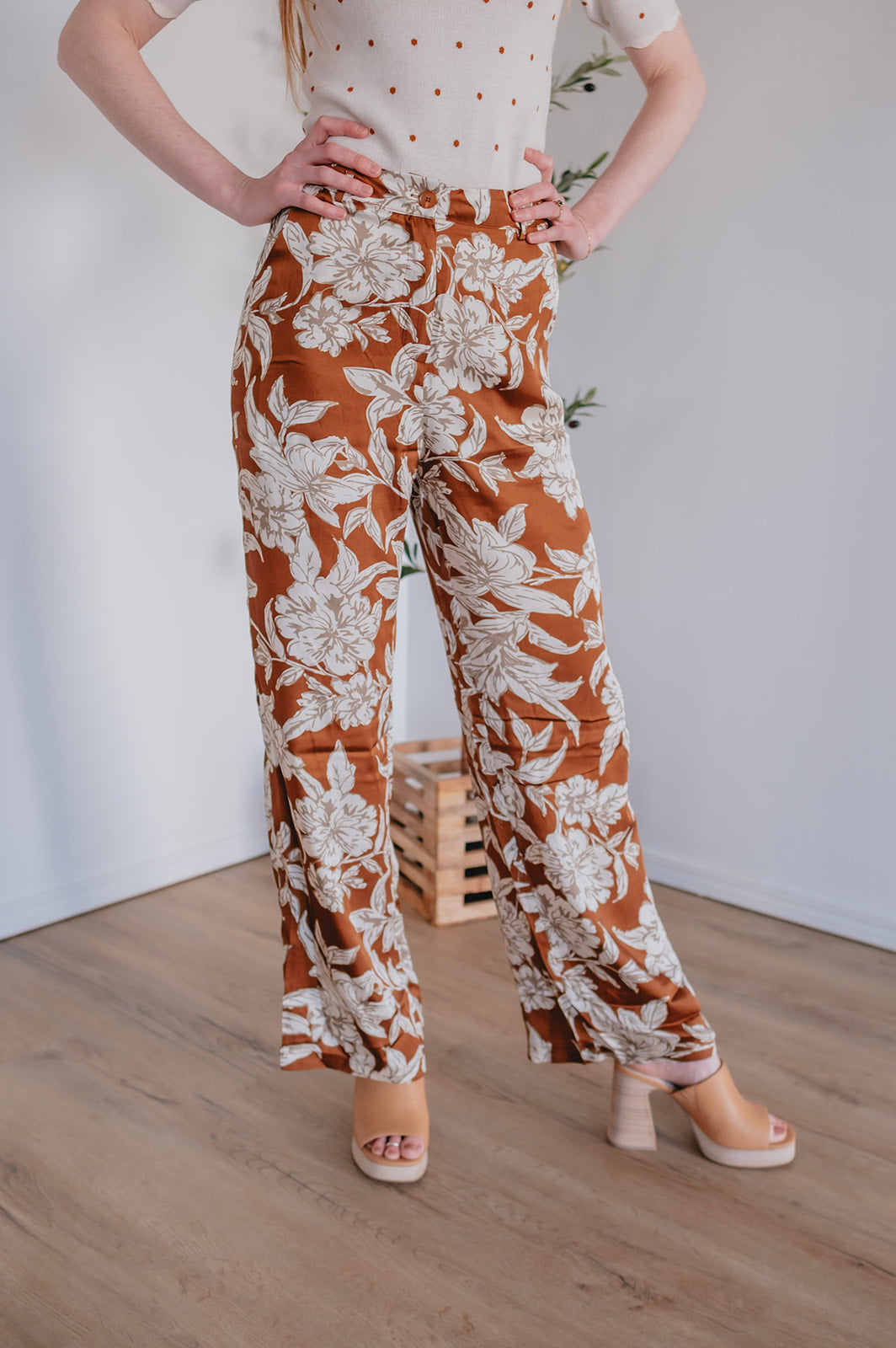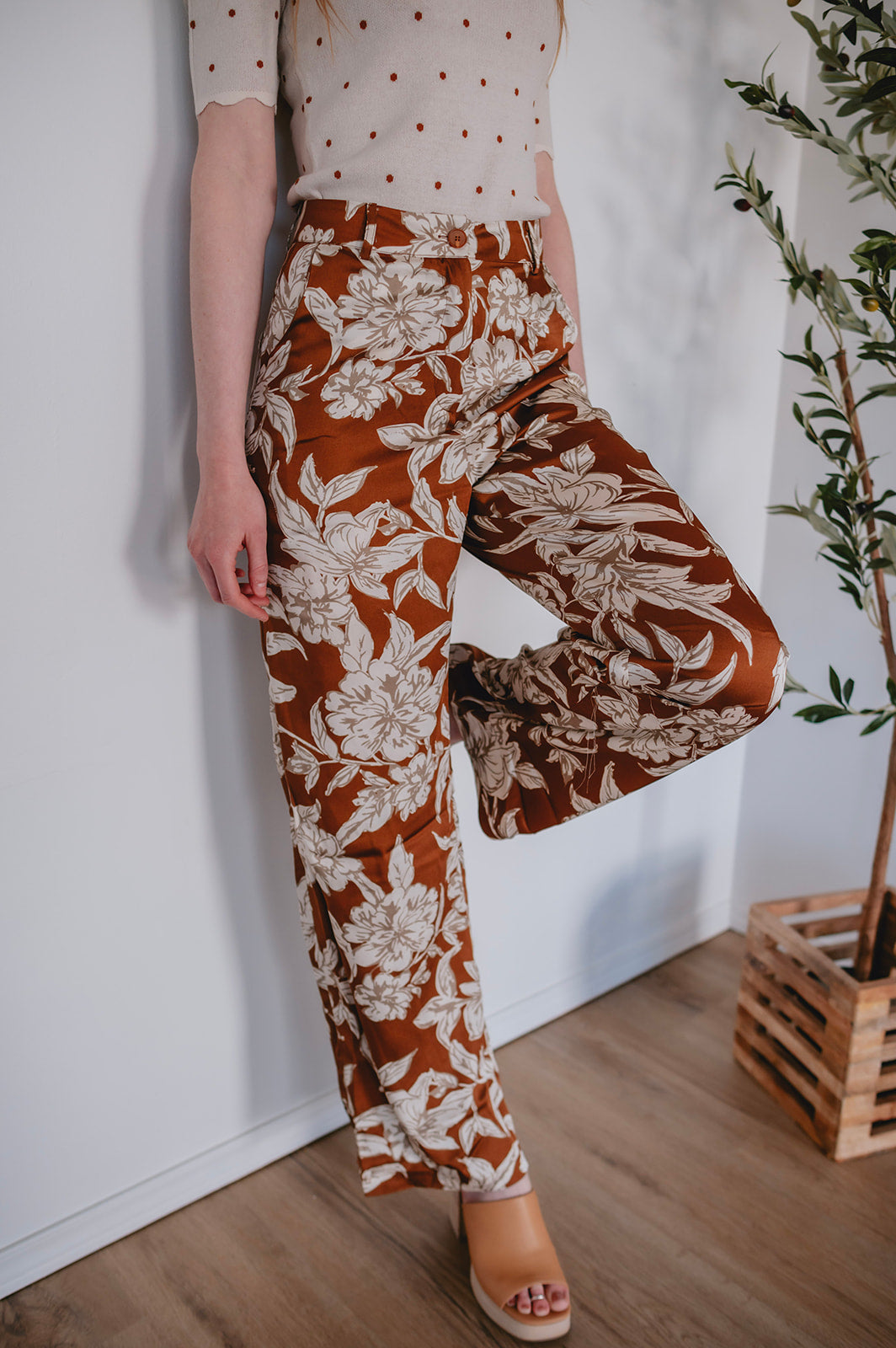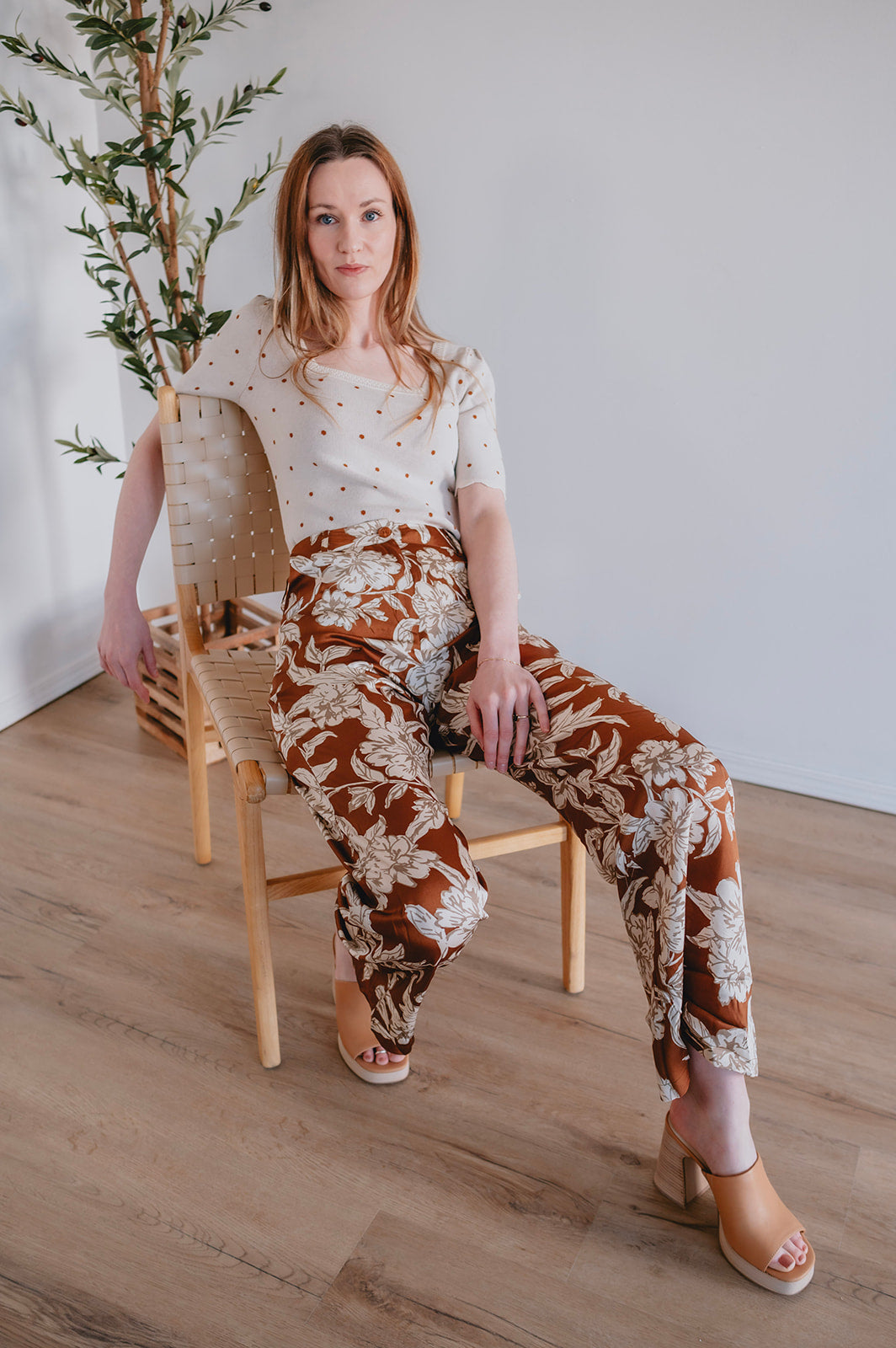 A perfect pair of floral pants. Not too dressy, yet not too basic. Wear it dressed up or down, the Angelia Trousers will be in rotation again and again. A soft + slinky satin material.