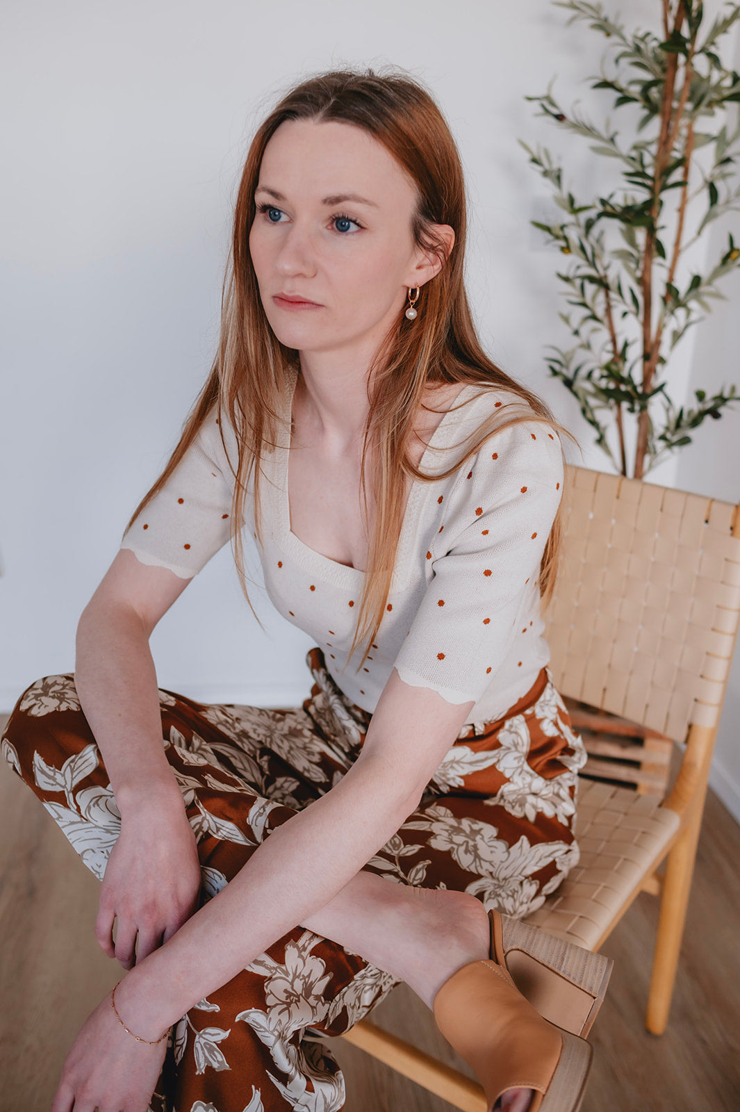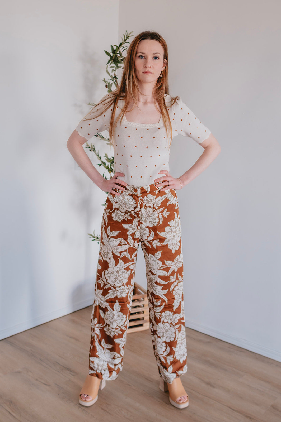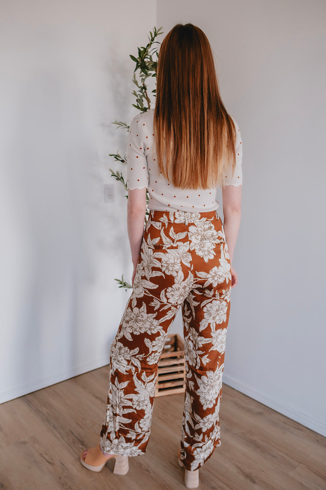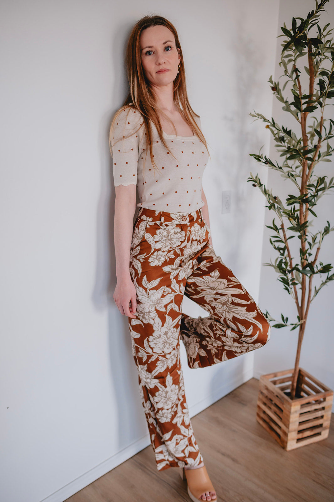 A perfect pair of floral pants. Not too dressy, yet not too basic. Wear it dressed up or down, the Angelia Trousers will be in rotation again and again. A soft + slinky satin material.
