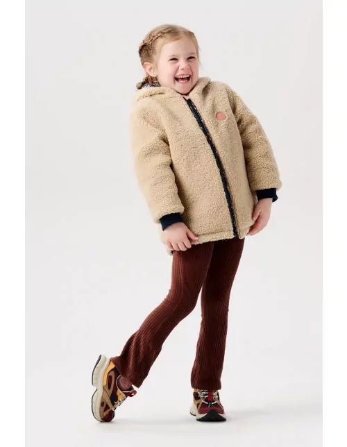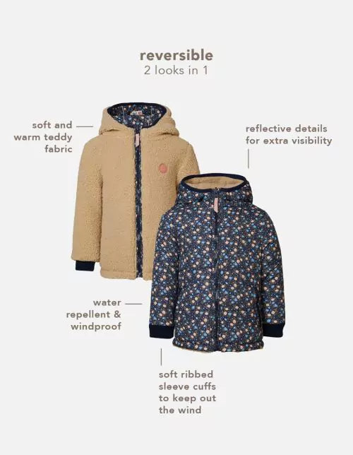 The coat also boasts a super soft teddy side. The printed side is water-repellent. Definitely very handy during a downpour! Both sides are windproof, making sure your little one will always be lovely and warm. The ribbed sleeve cuffs have also resulted in extra warmth and comfort. The coat features a hood, pockets and a zip stopper which will protect your little one’s skin. The hood includes reflective stripes, which make sure your child is more visible once darkness falls.