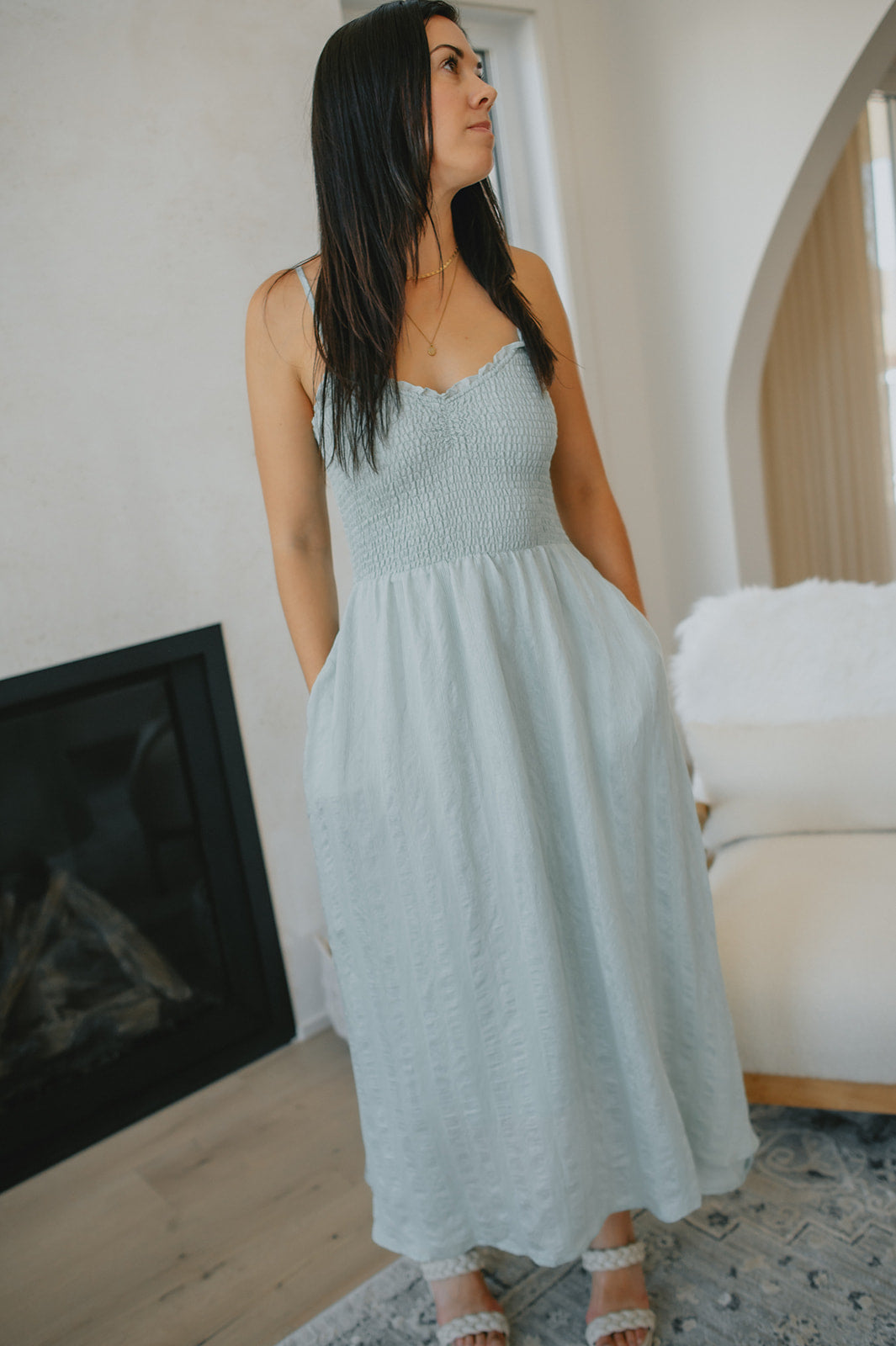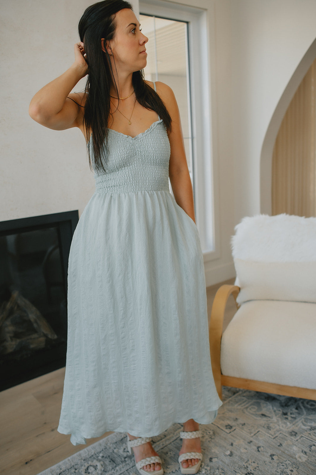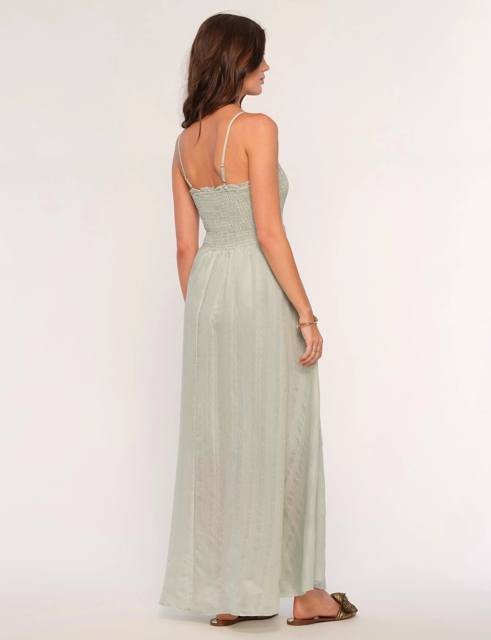 The Anya Dress is made from a soft, striped voile fabric and has a fully smocked bodice. It features a slight ruffle around the edges and adjustable straps