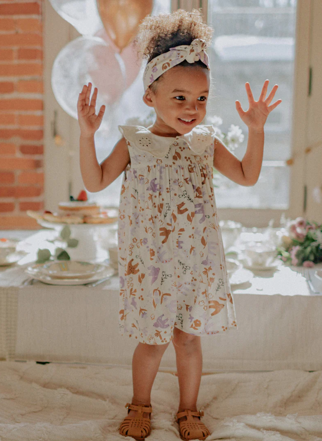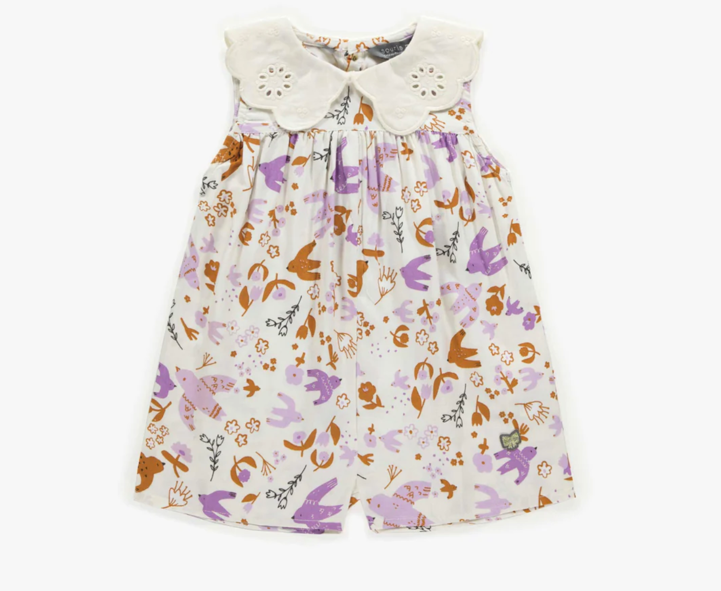 Cream sleeveless one-piece with the cutest purple and brown birds pattern. Styled with a vintage inspired, large cream collar and fastens with buttons in front. Wide cut fit through the leg but cinched at the waist. Perfect for Easter Brunch, parties, and picnics! Also available in Child sizes.