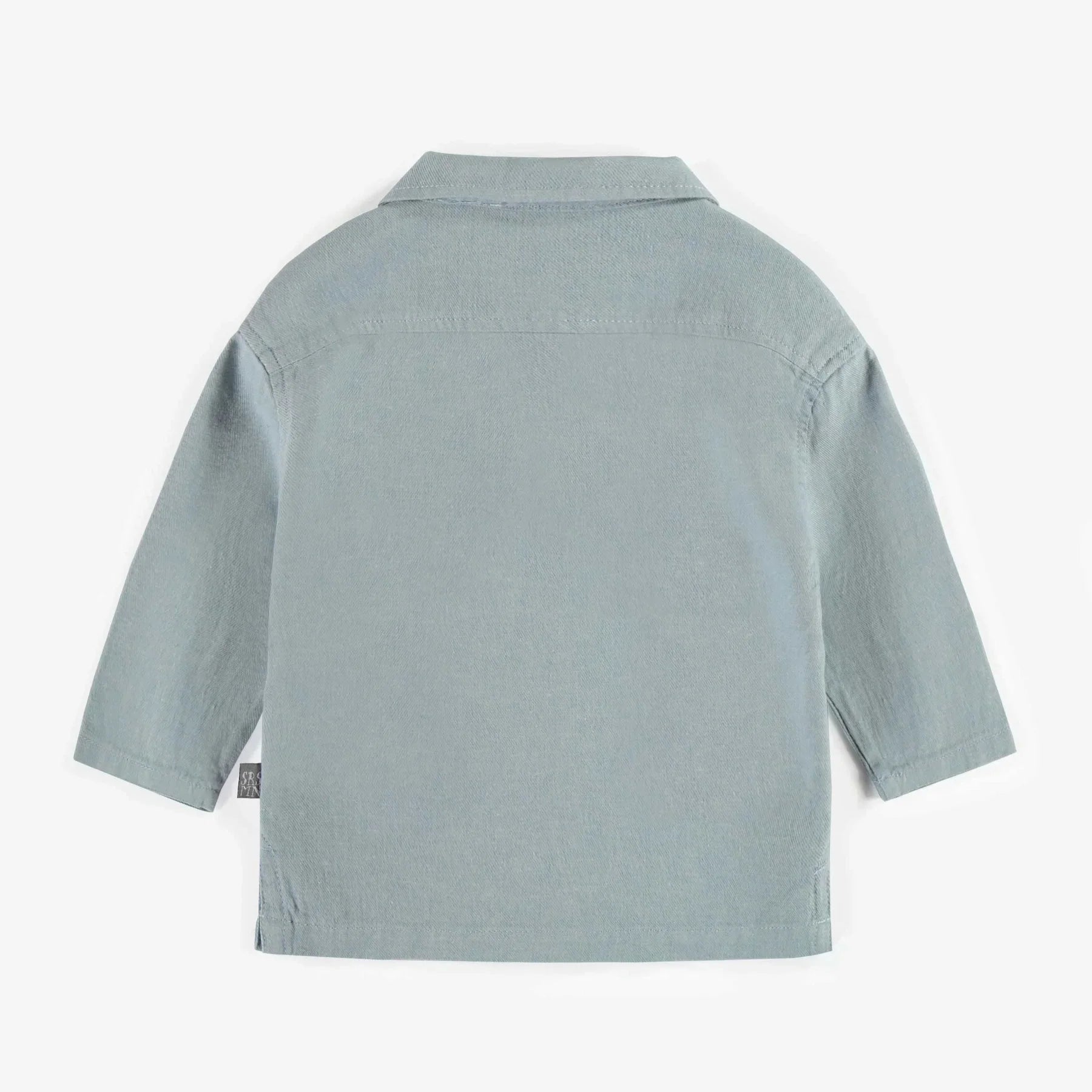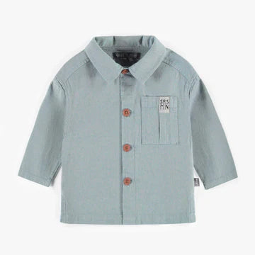 A classic blue shirt with a large applied pocket in front and have buttons to close it. Made in a woven of linen and cotton. Can be folded to make short sleeves shirt. Convenient for overlay.