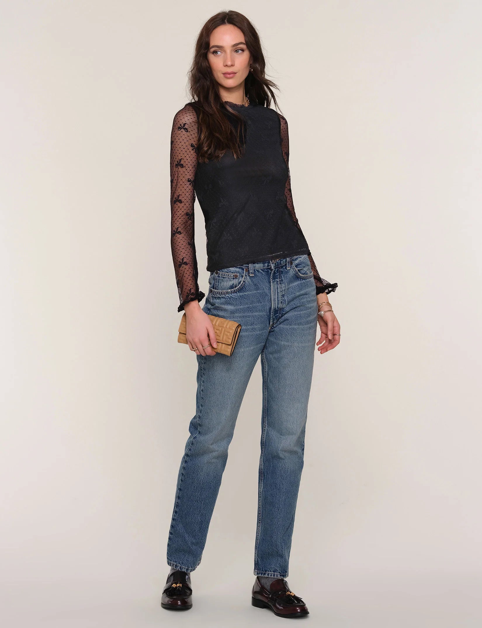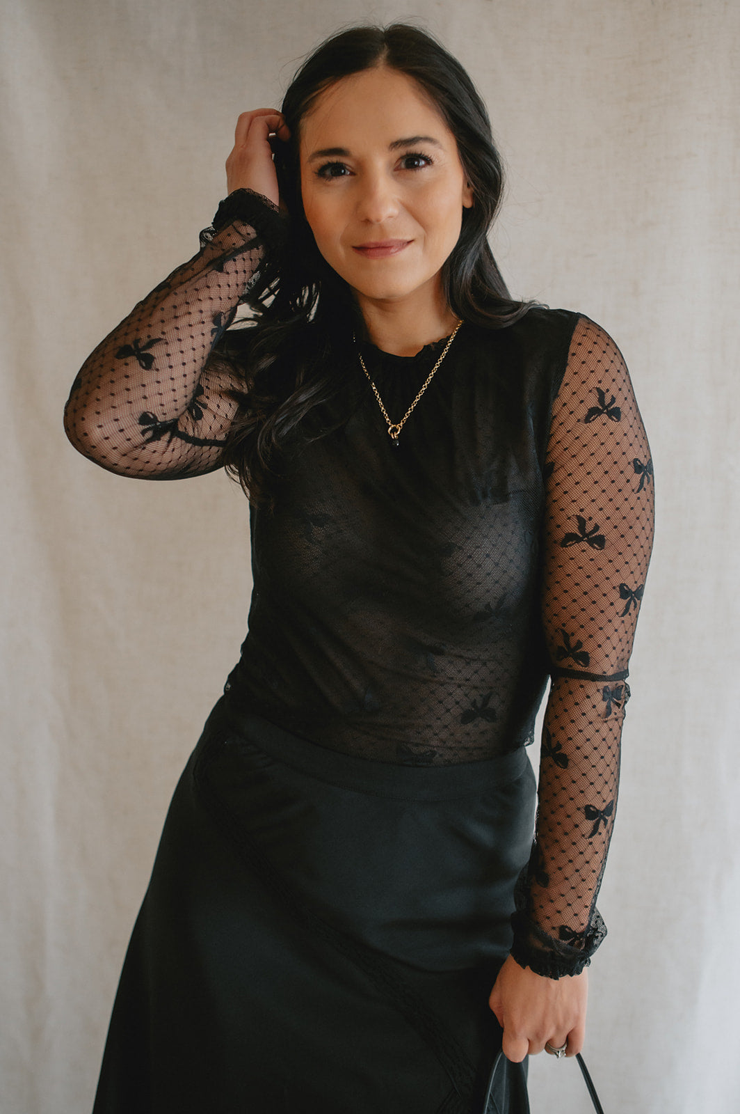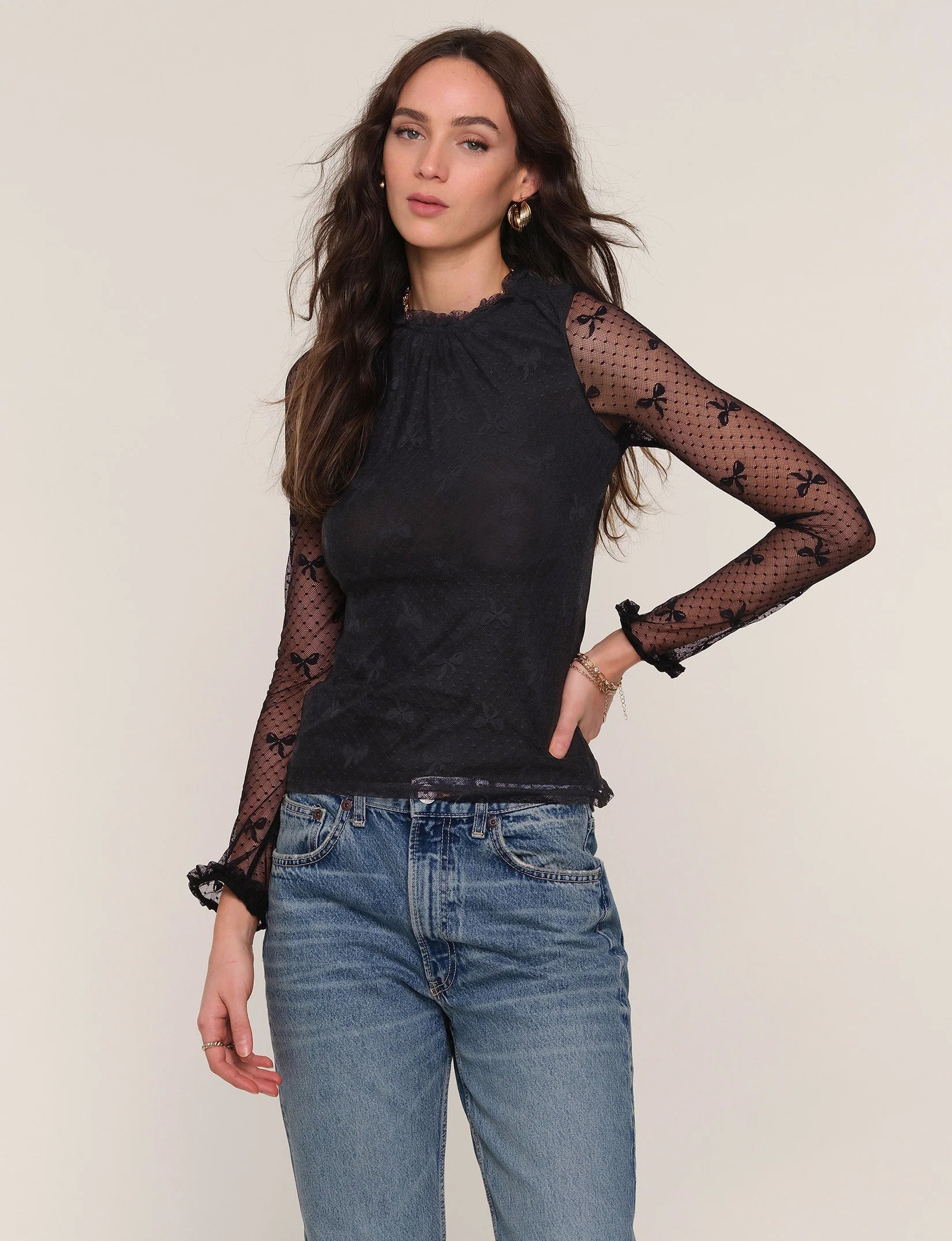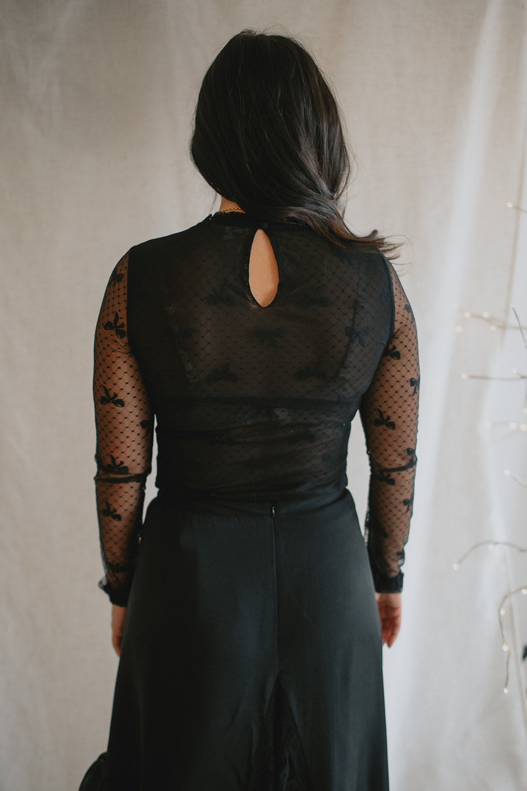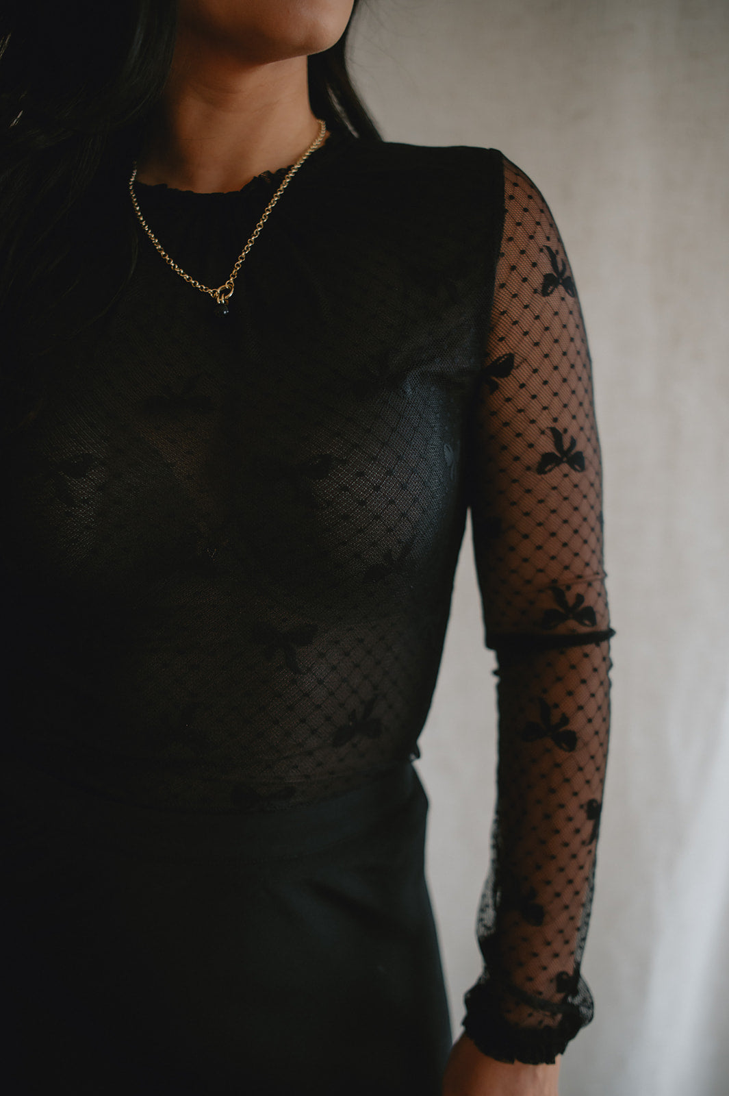 The Bows Blouse is made from a pretty, stretch mesh. It has a crew neck, slim fit and delicate ruffles at the neck and cuffs. The body is fully lined.