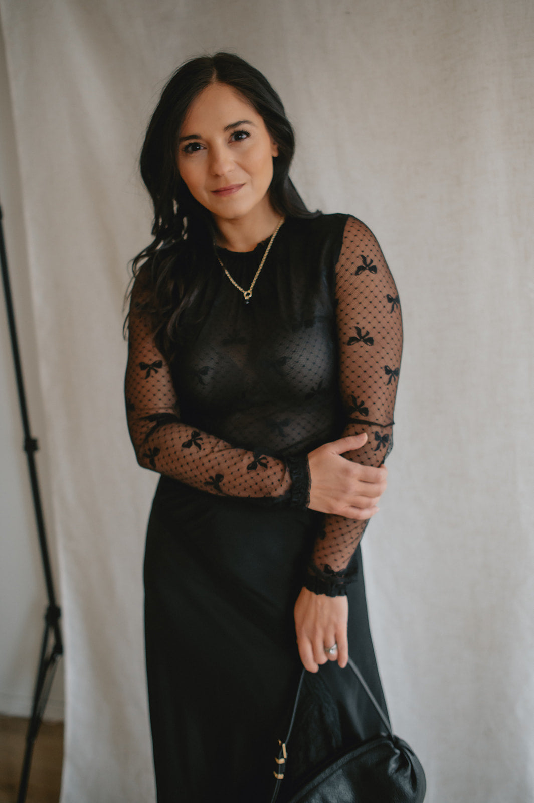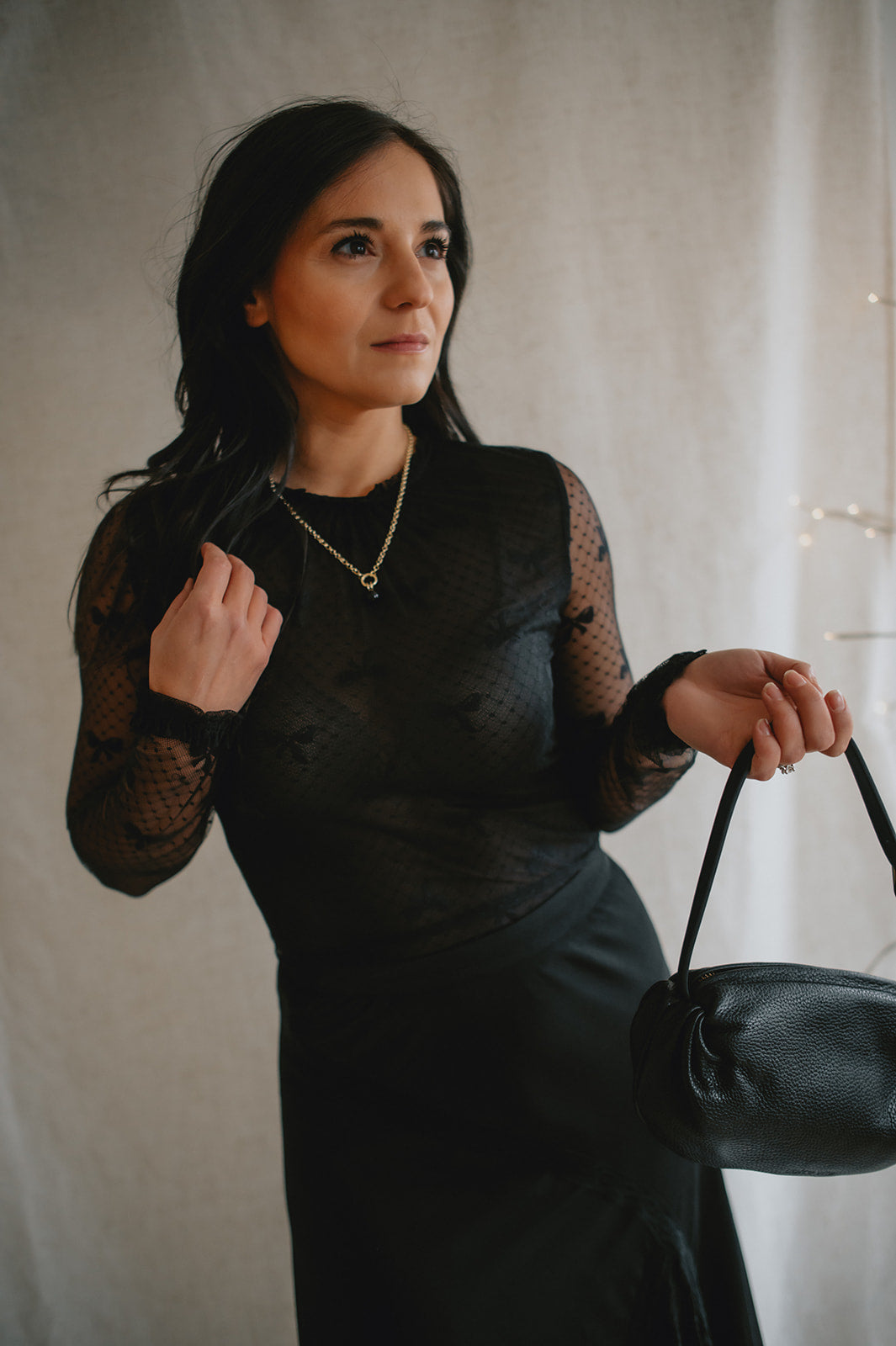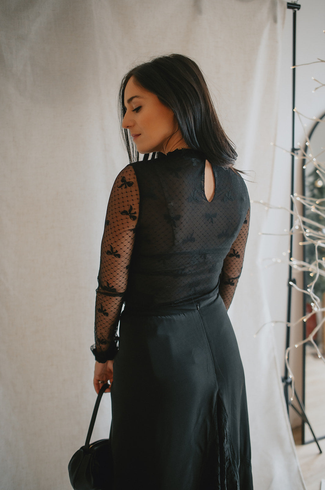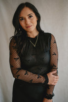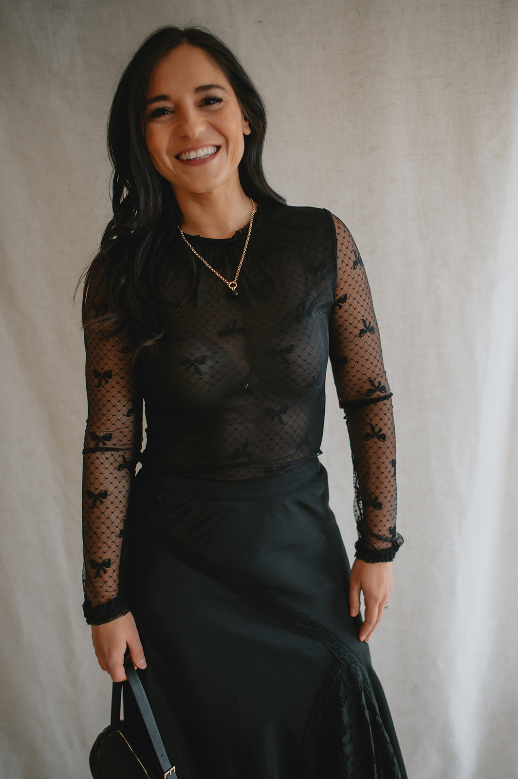 The Bows Blouse is made from a pretty, stretch mesh. It has a crew neck, slim fit and delicate ruffles at the neck and cuffs. The body is fully lined.