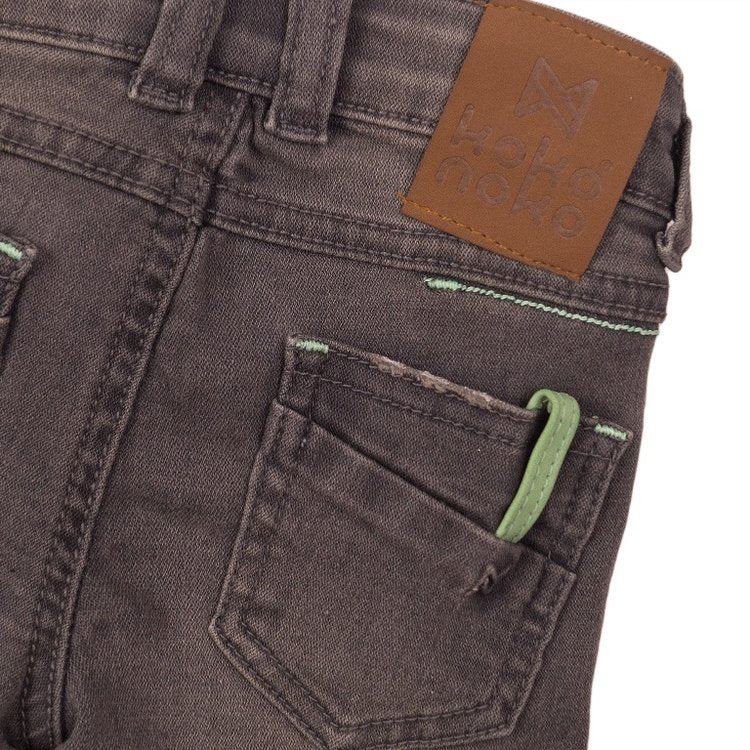 These tough shorts are grey in colour stretchy and comfy. The short is finished with a button and zipper closure and 5-pockets and has a distressed detail look on the edges of the pockets. With a fun leather loop on the back pocket it makes these shorts perfect for adventuring.