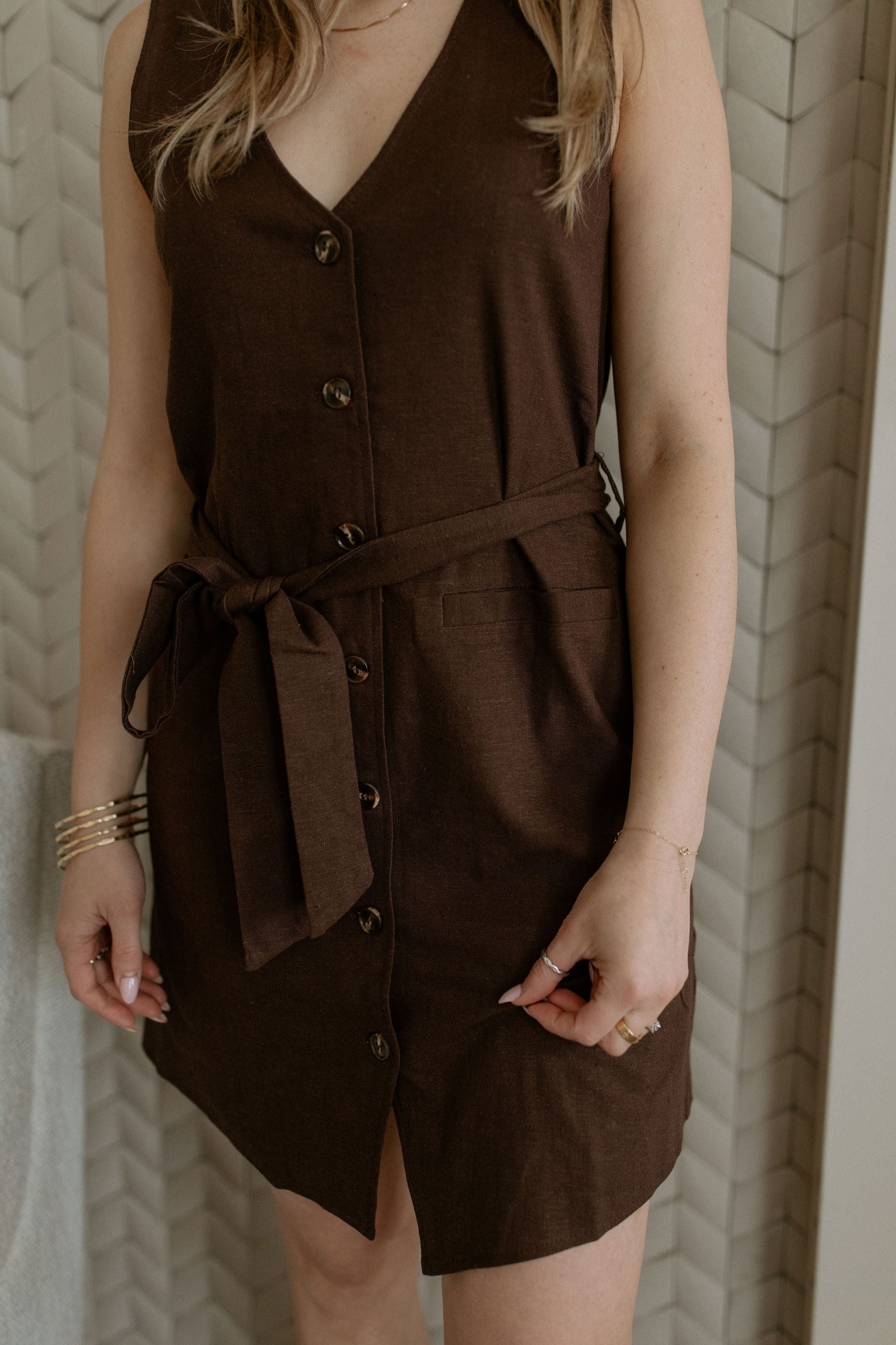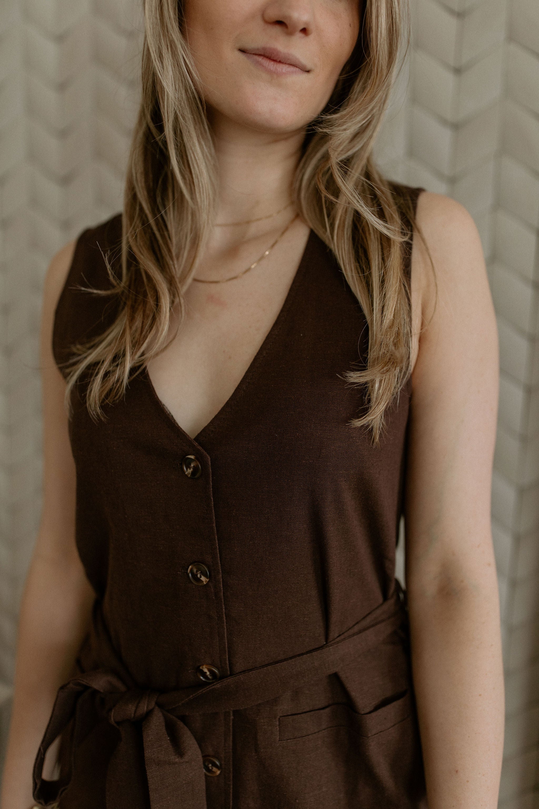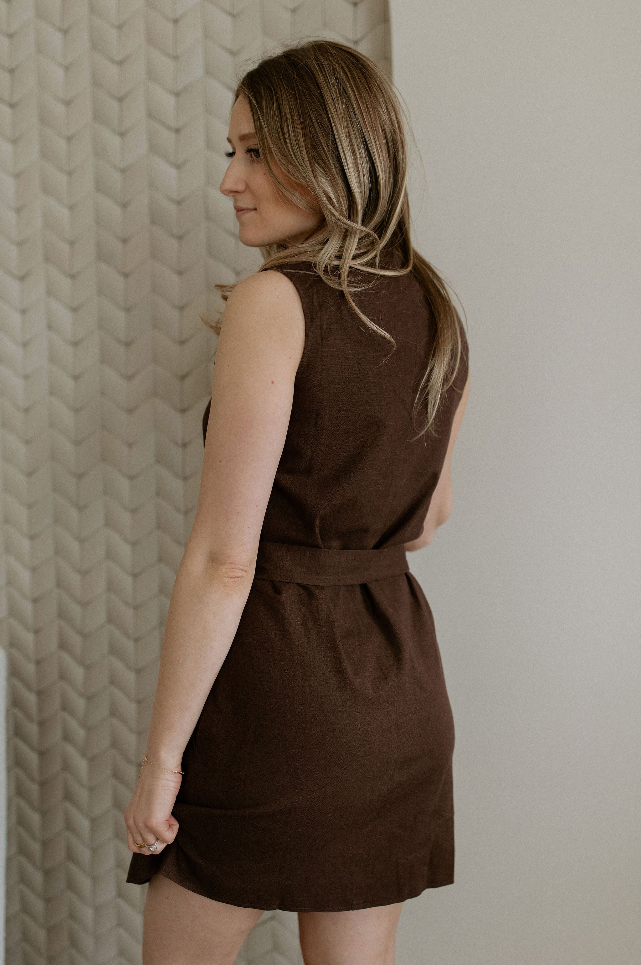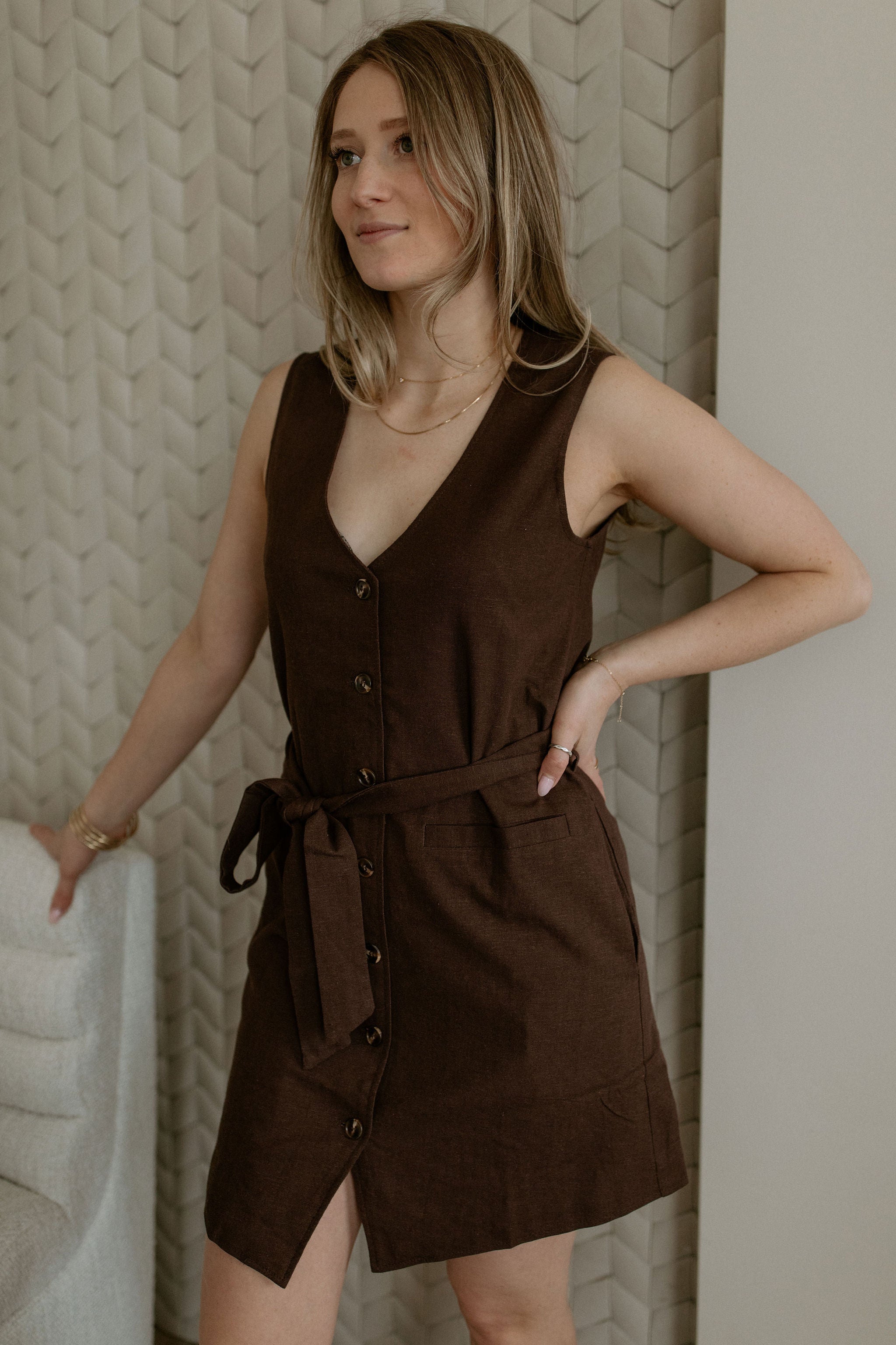 This vest style mini dress is the perfect item for year-round dressing! We love her on her own with slingback loafers or sandals in the summer and over trousers or denim for the cooler times. Chocolate brown is a hot colour right now so make sure to snag this while they're here!