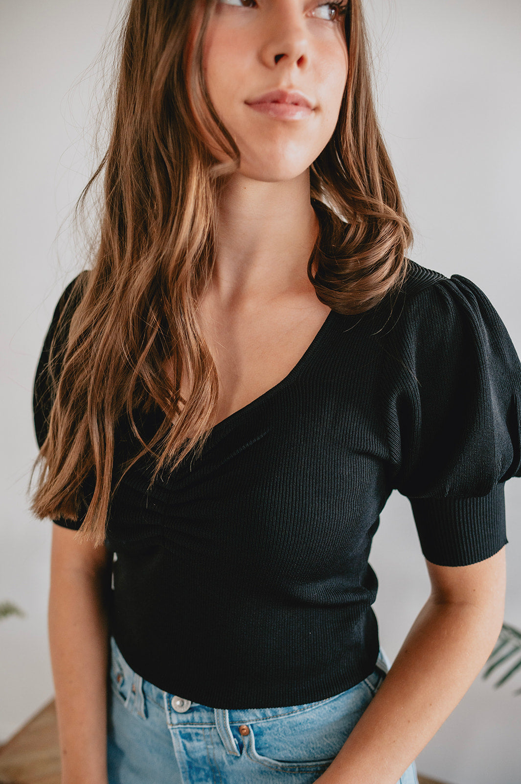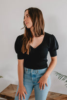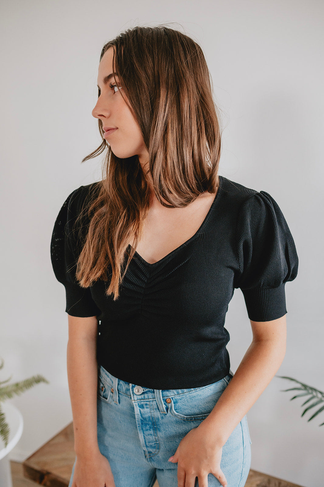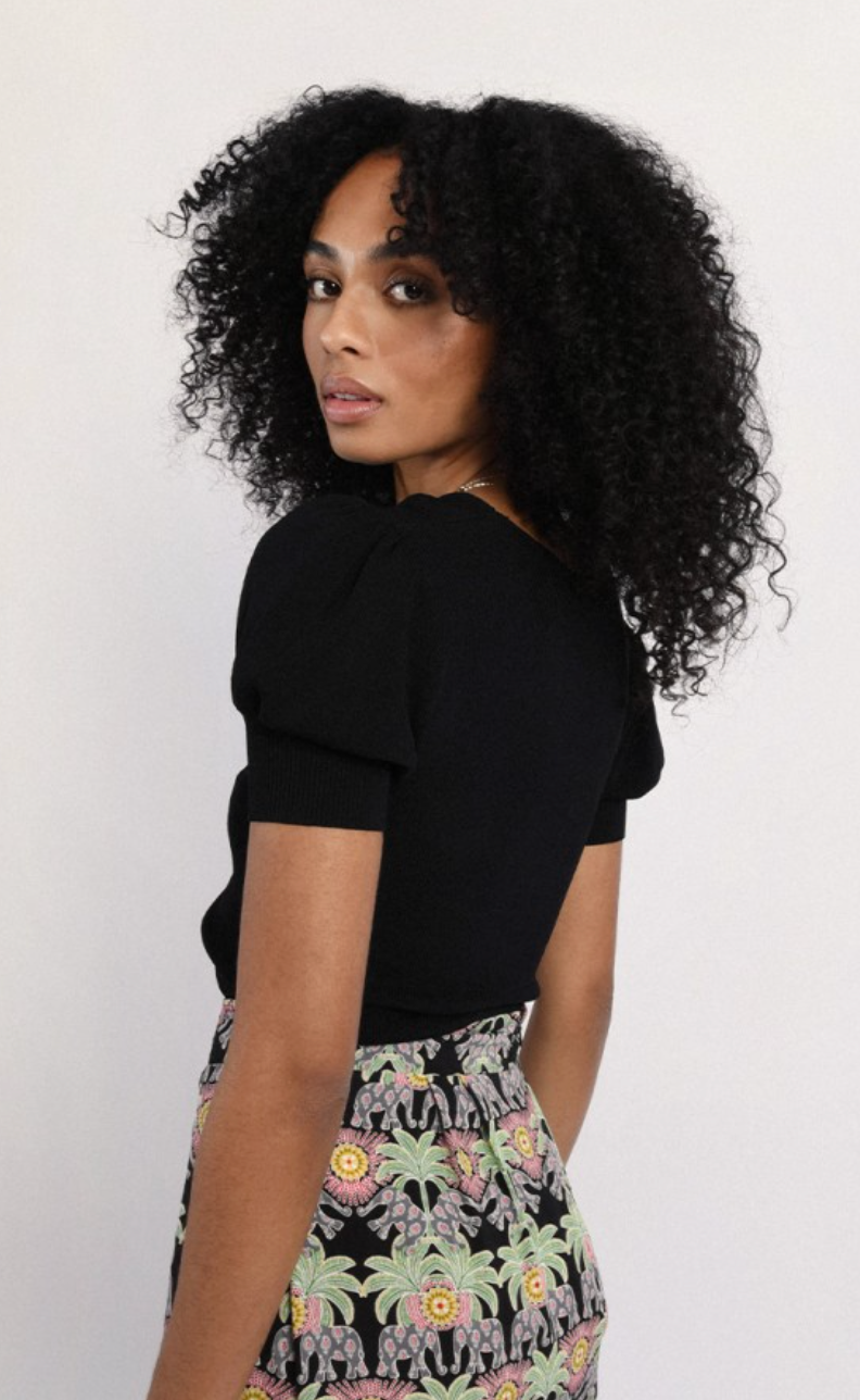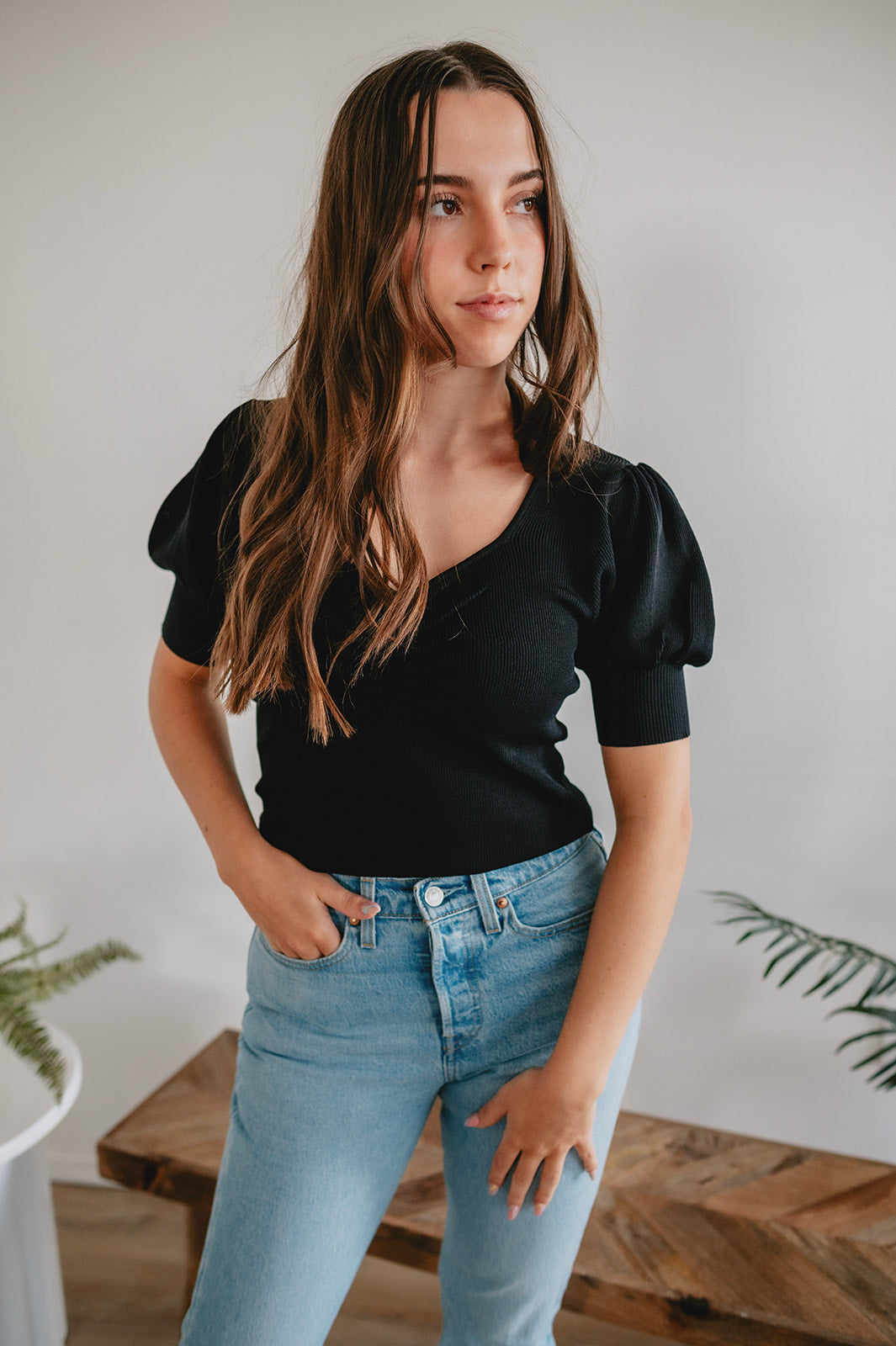 ropped, made of a fine ribbed knit, and has short balloon sleeves and heart necklin. She's super stretchy too which is always a bonus!