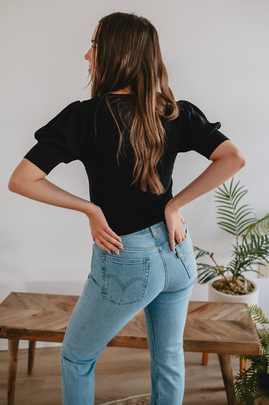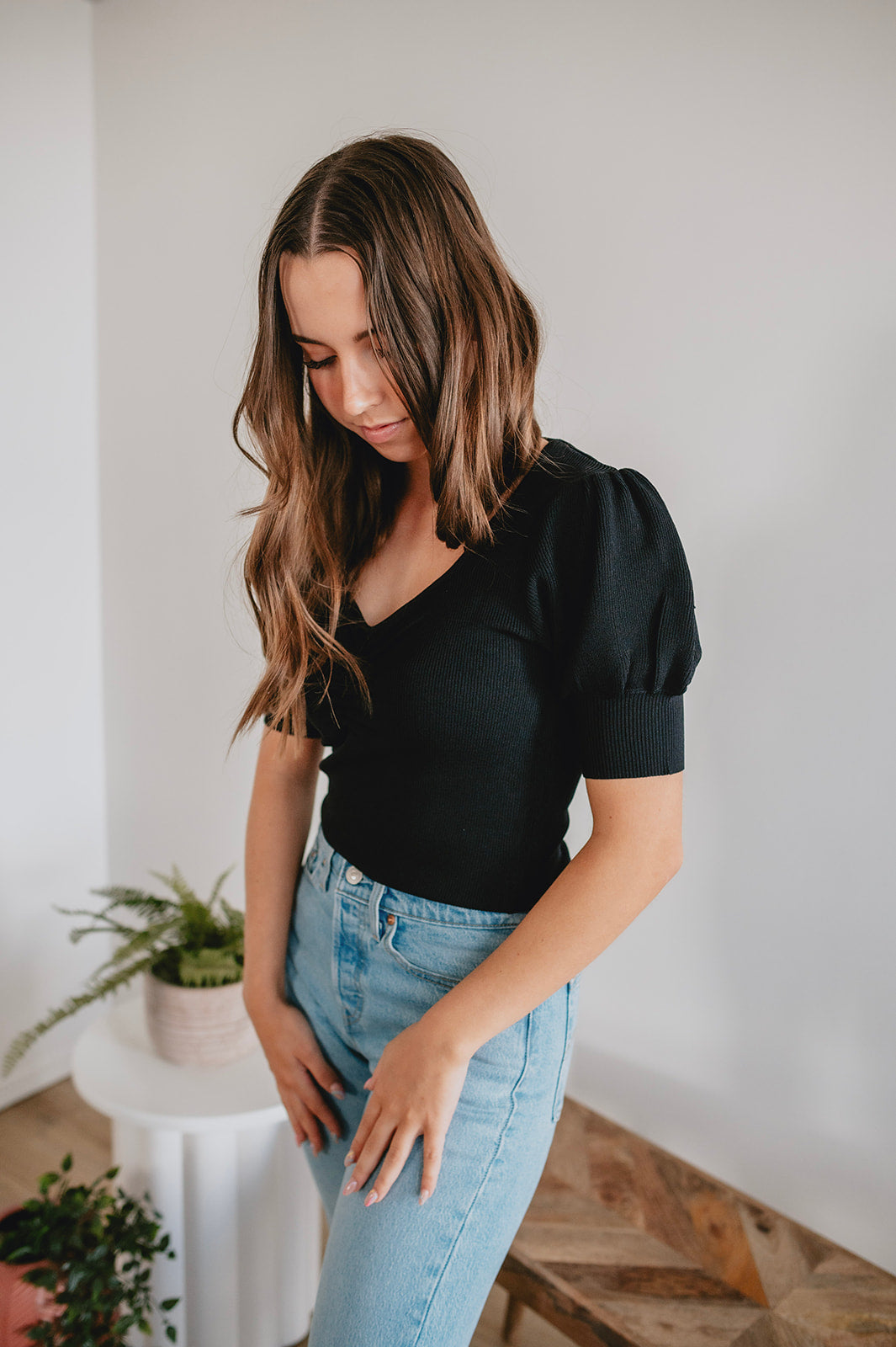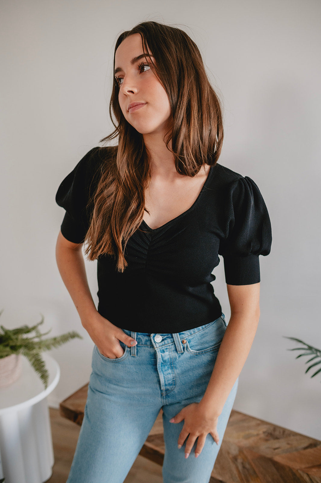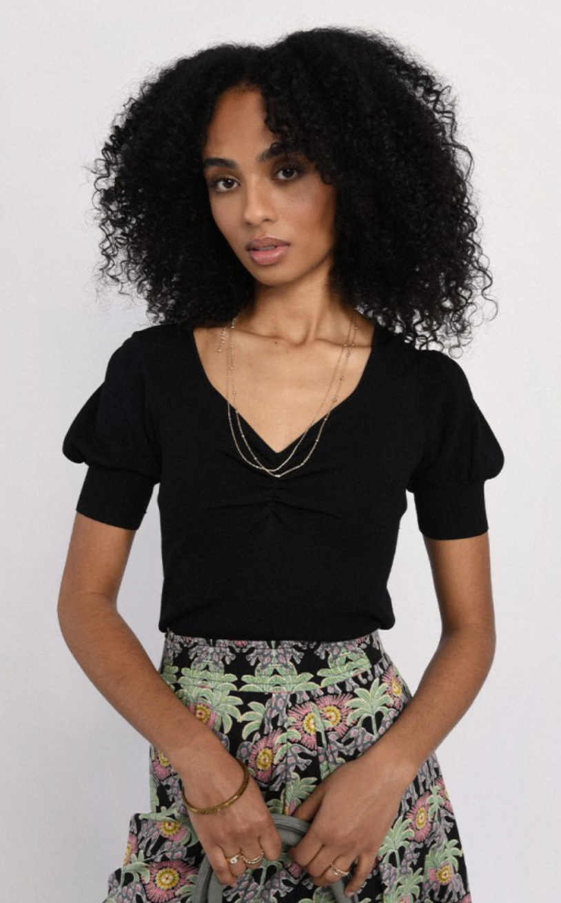 ropped, made of a fine ribbed knit, and has short balloon sleeves and heart necklin. She's super stretchy too which is always a bonus!