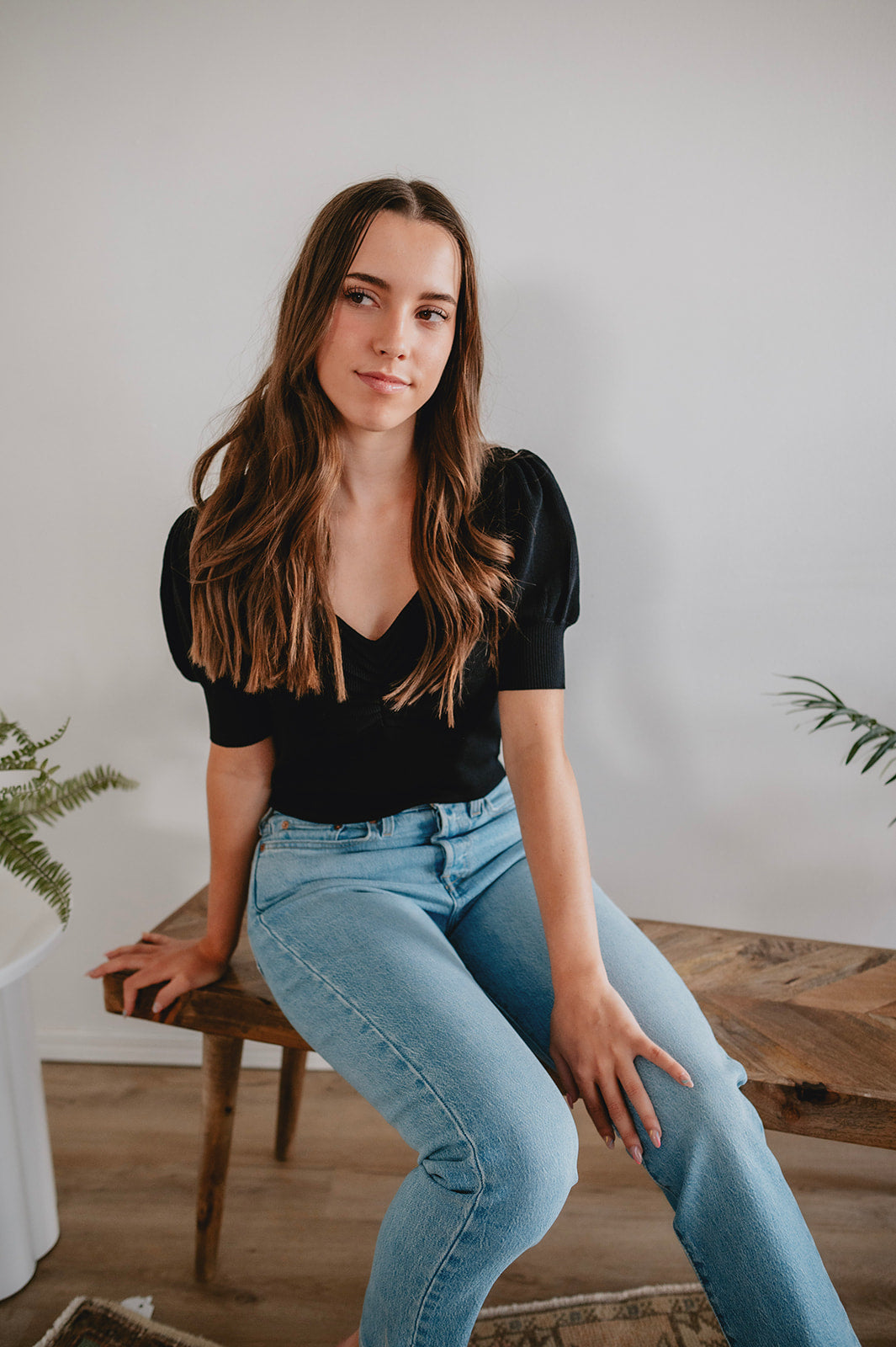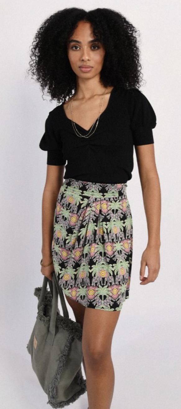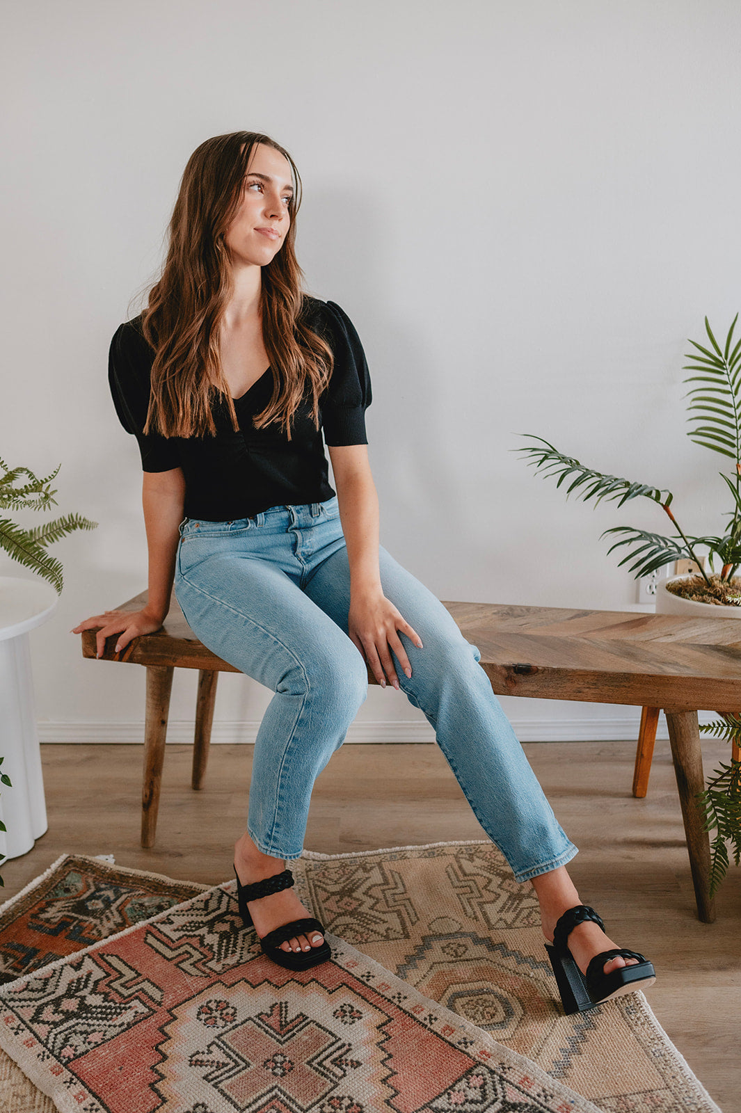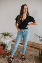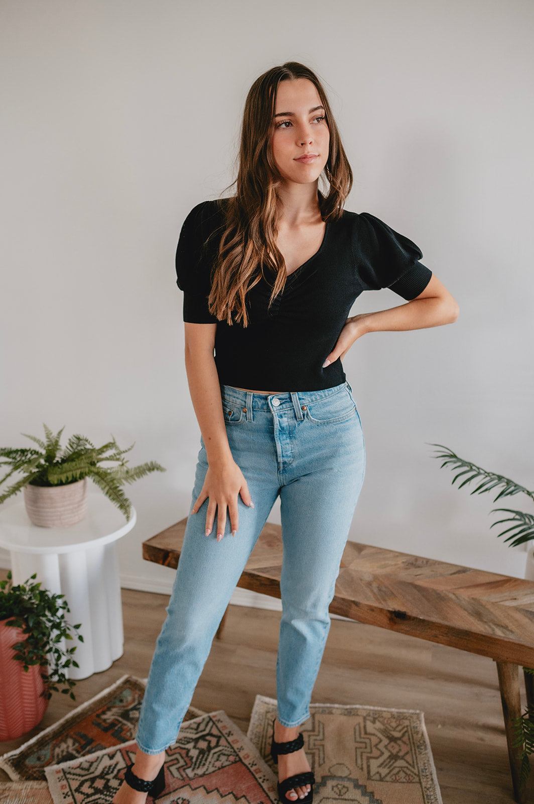 ropped, made of a fine ribbed knit, and has short balloon sleeves and heart necklin. She's super stretchy too which is always a bonus!