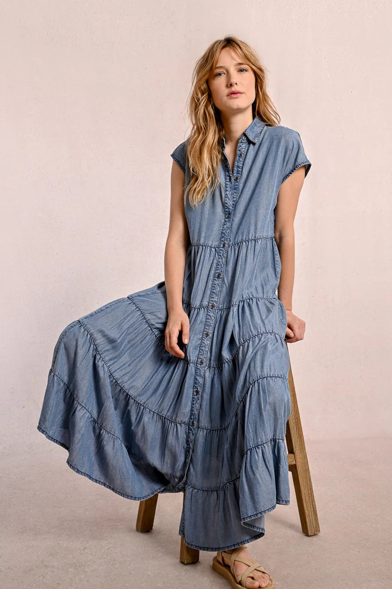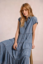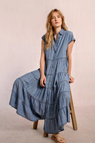 A feminine twist on a timeless classic. The Dakota Denim Dress features short sleeves, a blouse collar, and a full-length button front for effortless styling. Designed with multi-tiered ruffles below the waist, it adds soft movement and a flattering silhouette to your everyday look. Dress it up with heels or keep it casual with sandals.