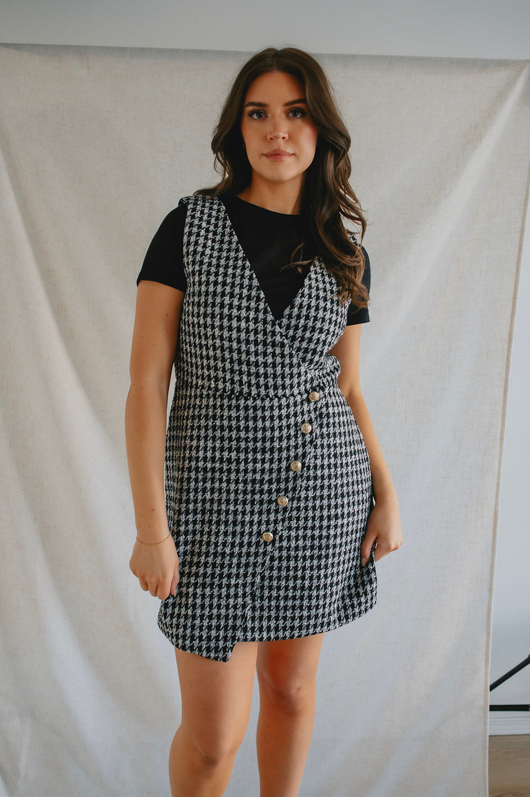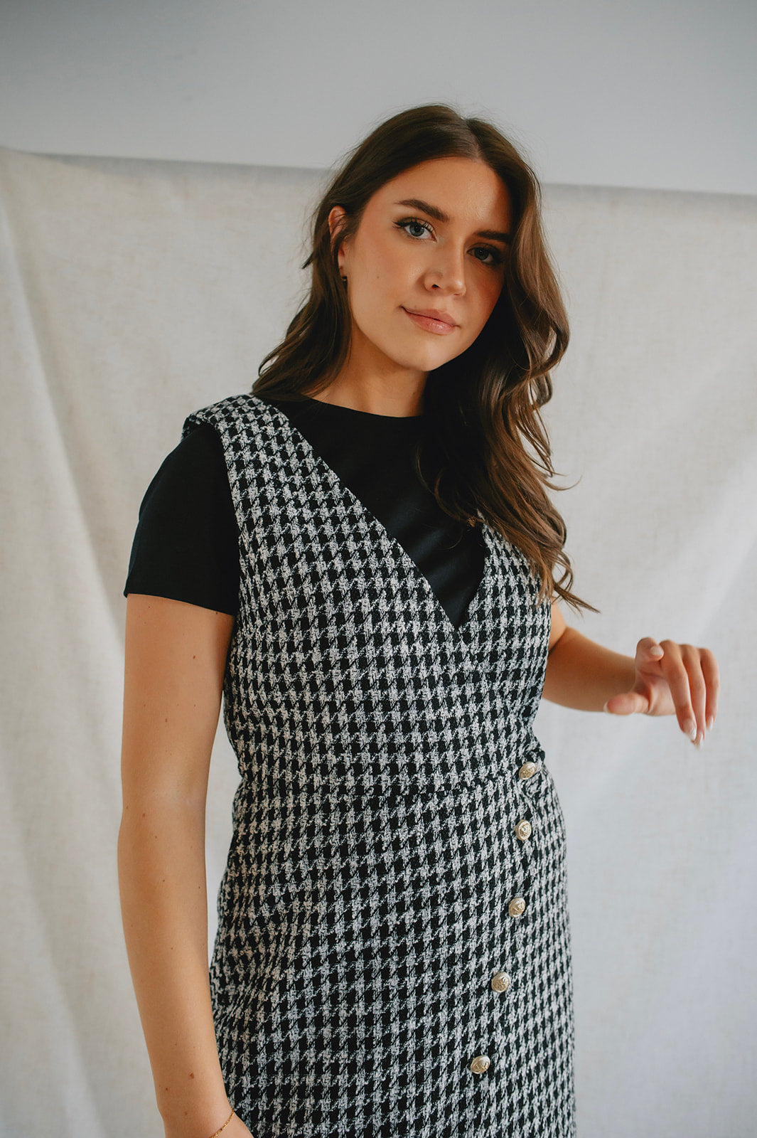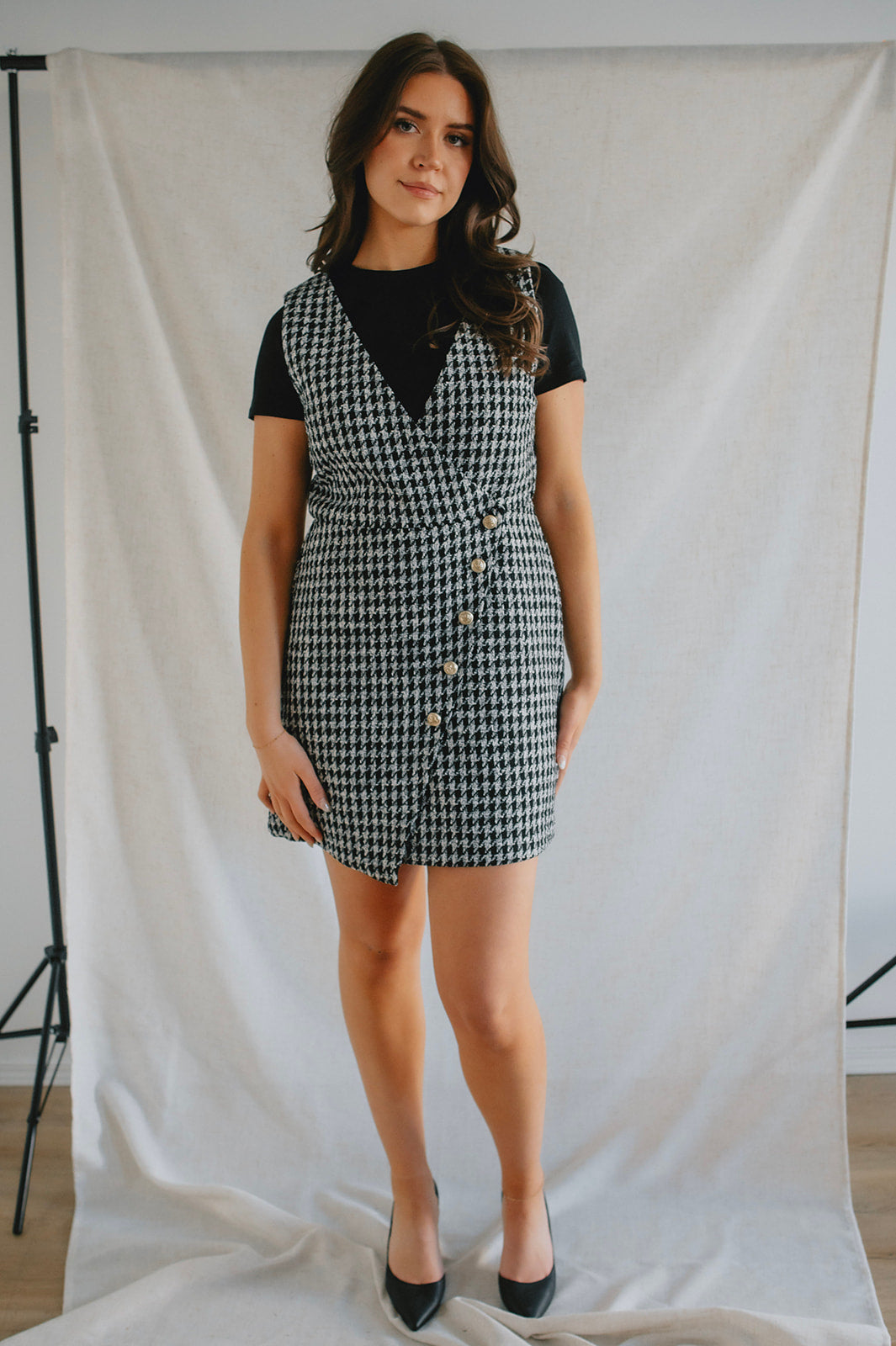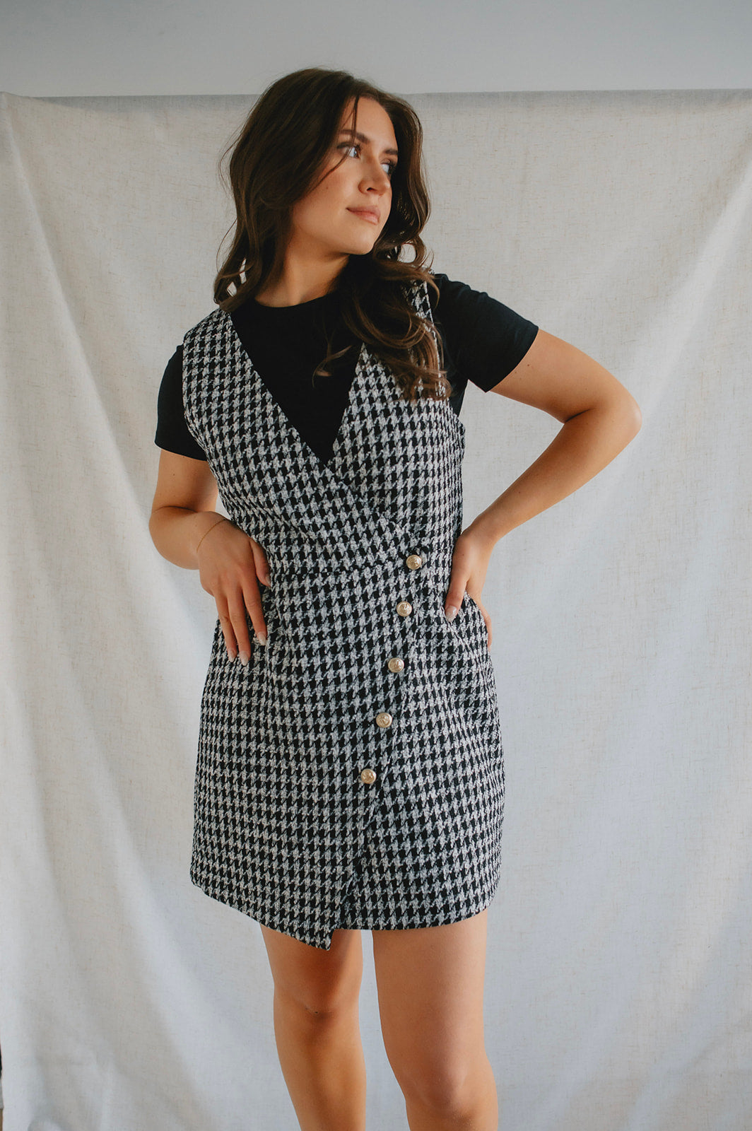 A v-neck tweed pinafore dress in a black and white houndstooth print with gold decorative buttons. This mini dress is perfect for layering with turtlenecks, button-up shirts, and tees!