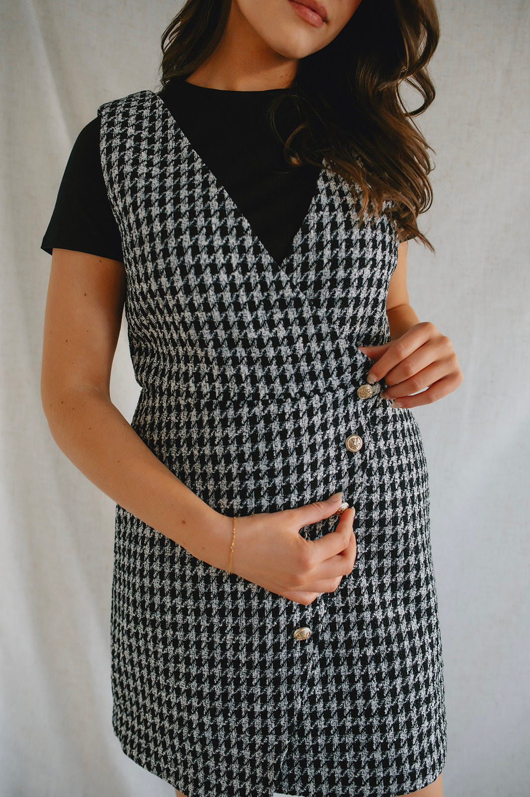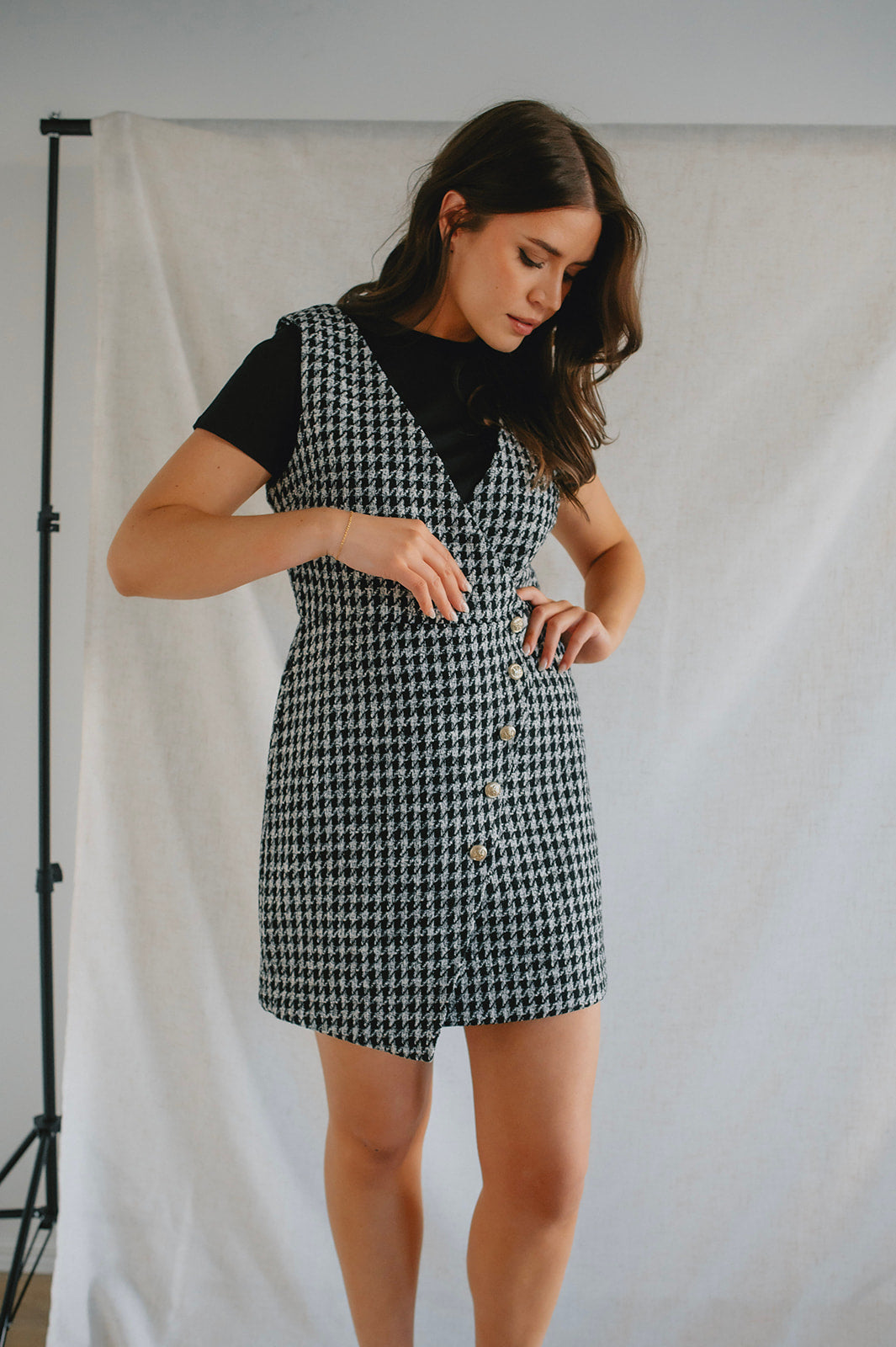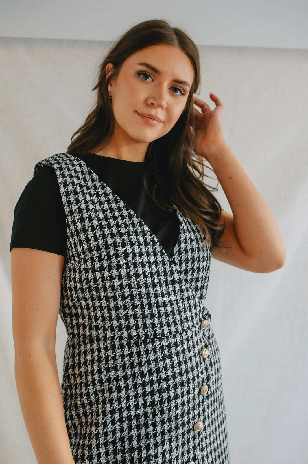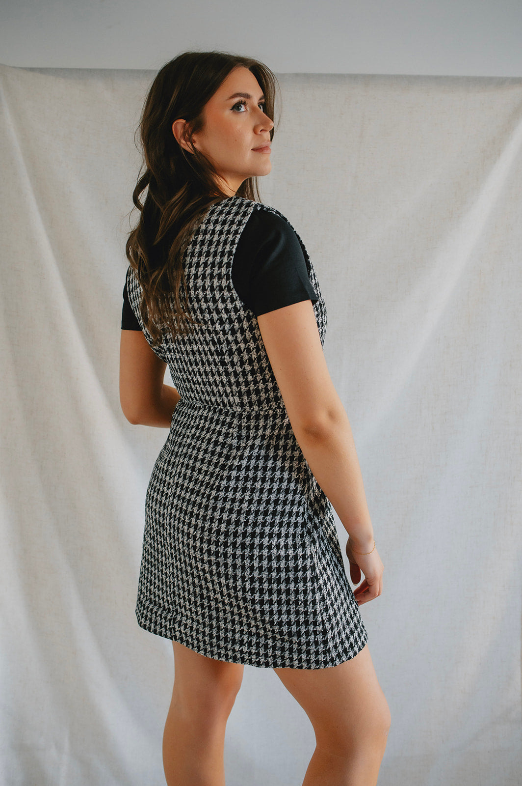 A v-neck tweed pinafore dress in a black and white houndstooth print with gold decorative buttons. This mini dress is perfect for layering with turtlenecks, button-up shirts, and tees!