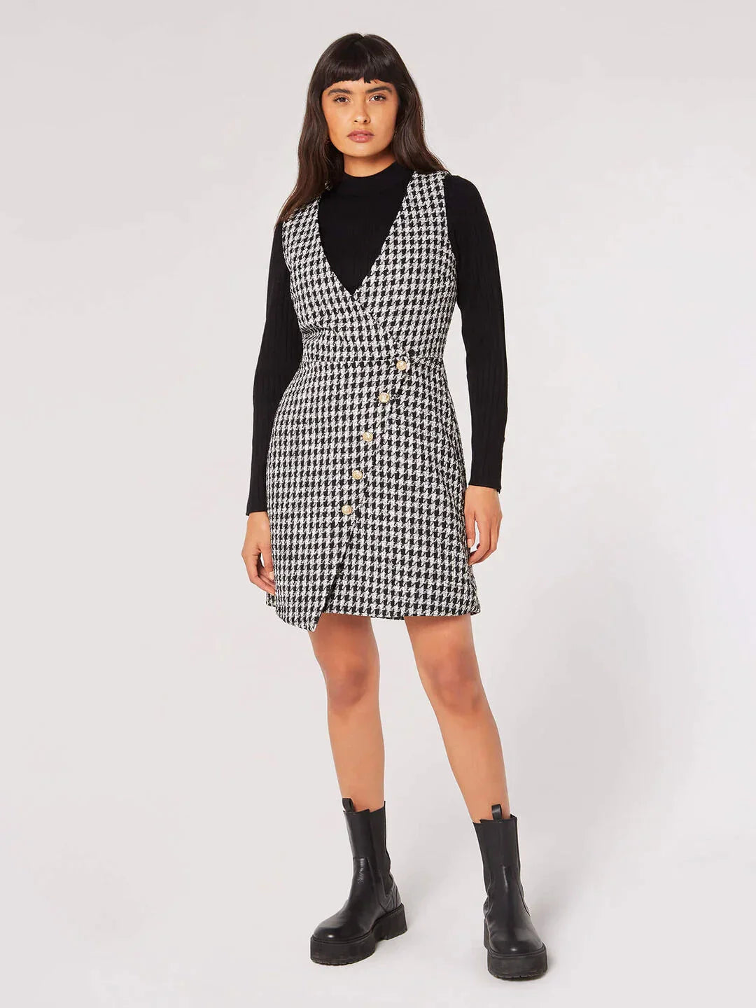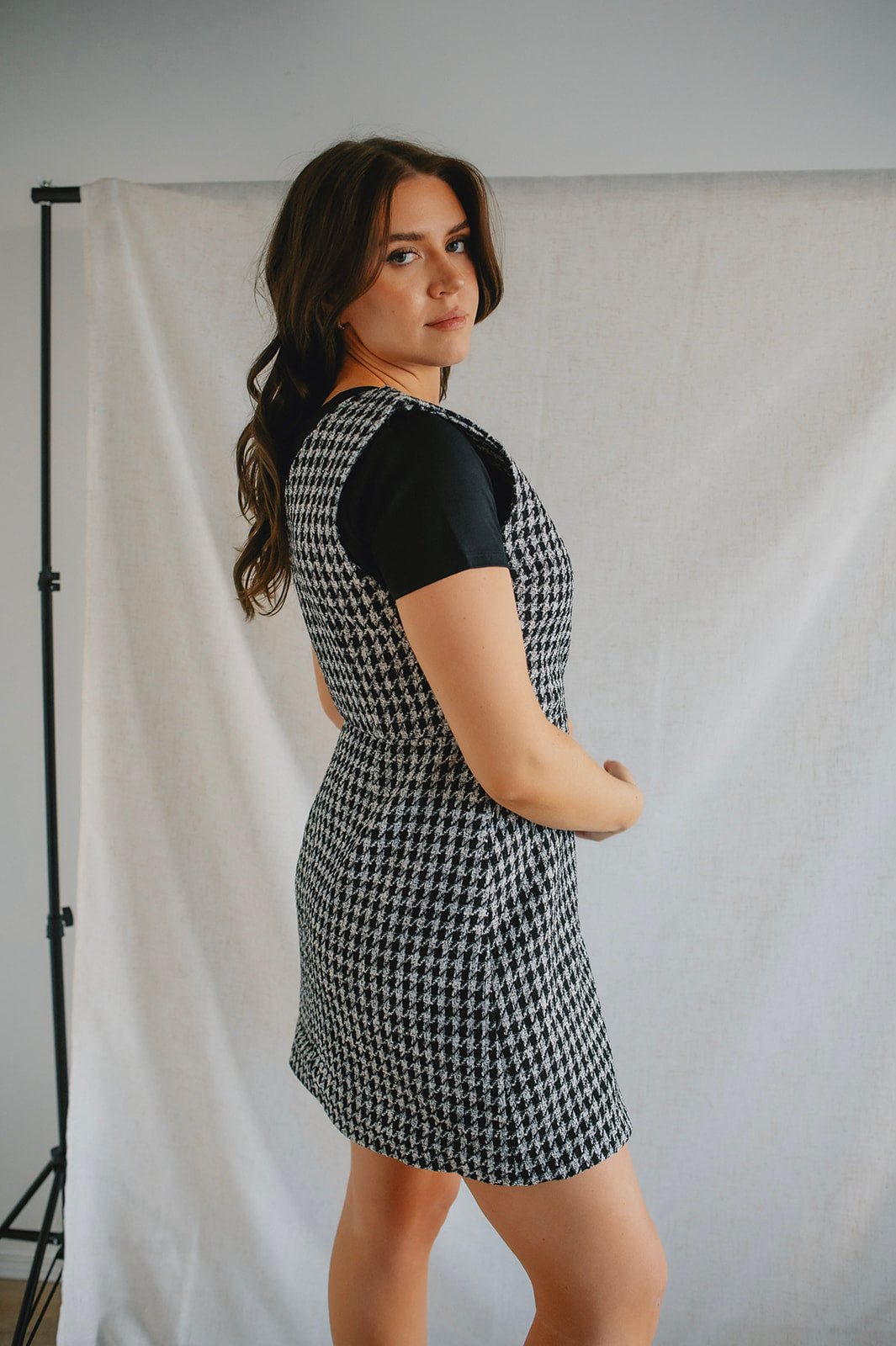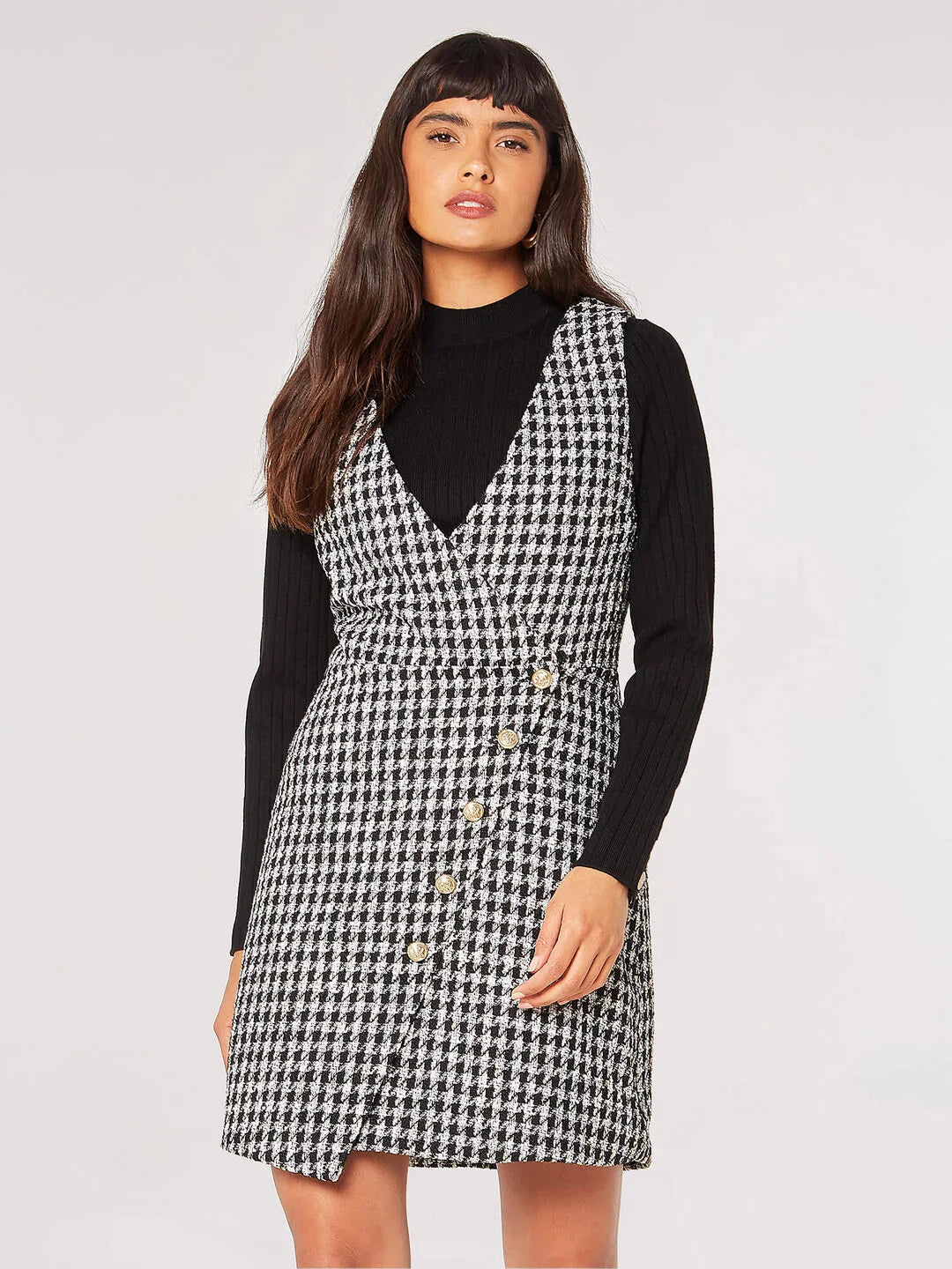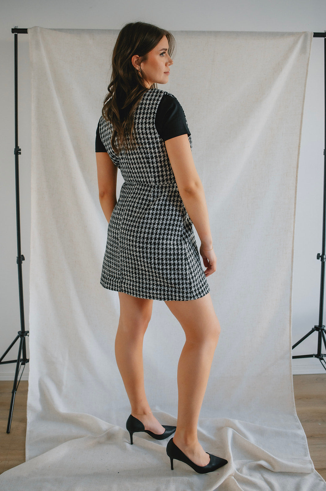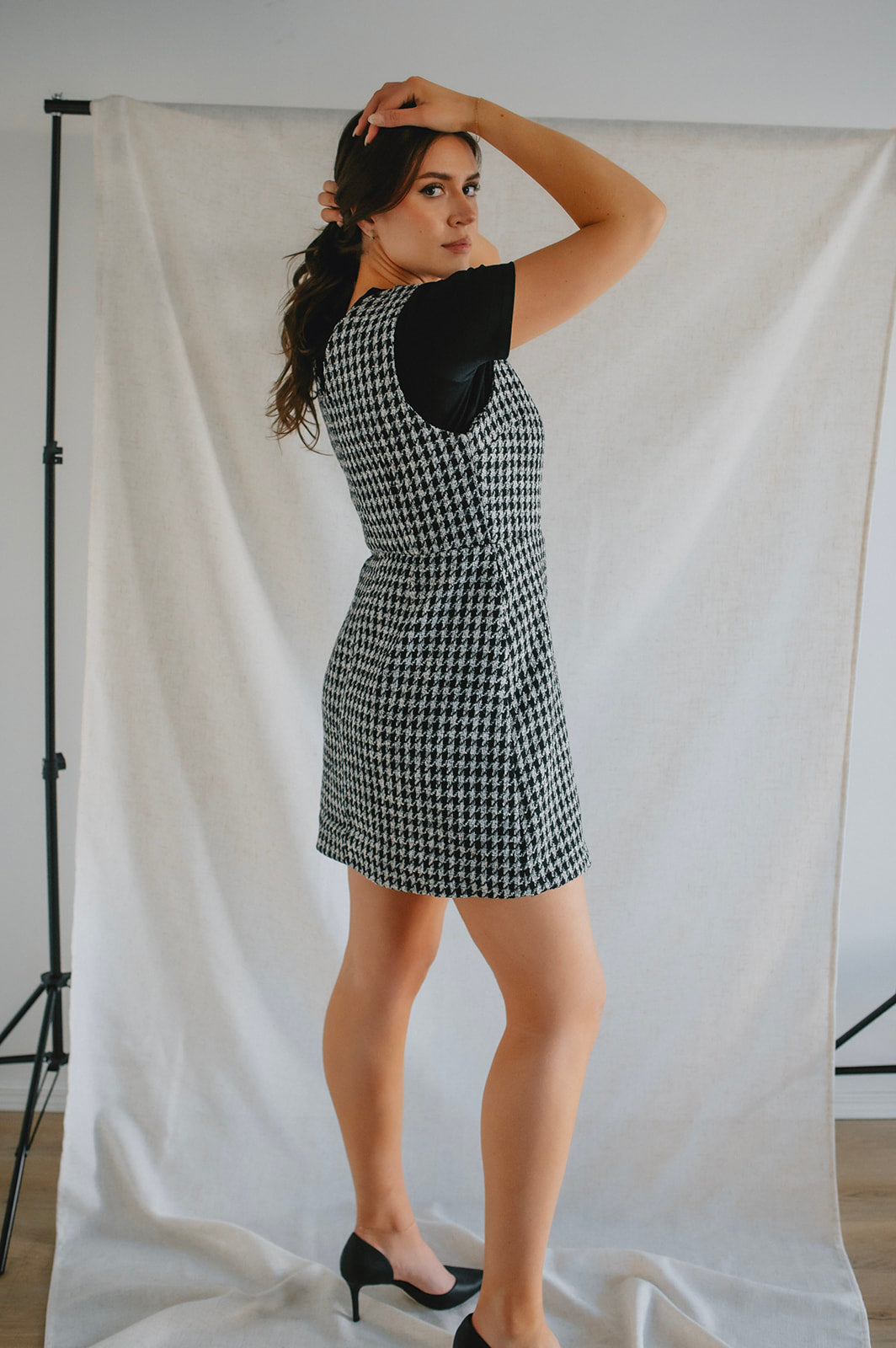 A v-neck tweed pinafore dress in a black and white houndstooth print with gold decorative buttons. This mini dress is perfect for layering with turtlenecks, button-up shirts, and tees!