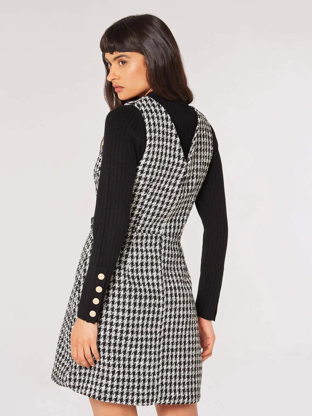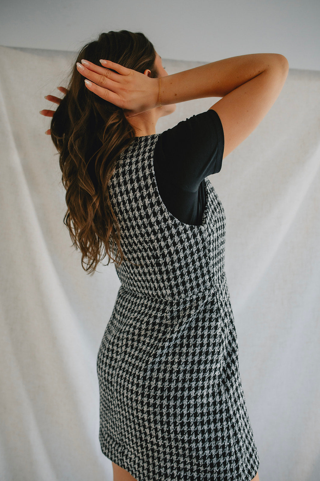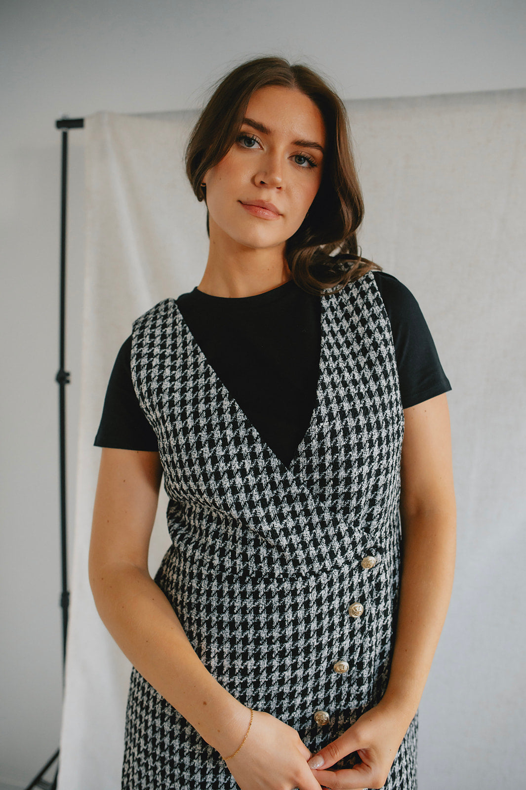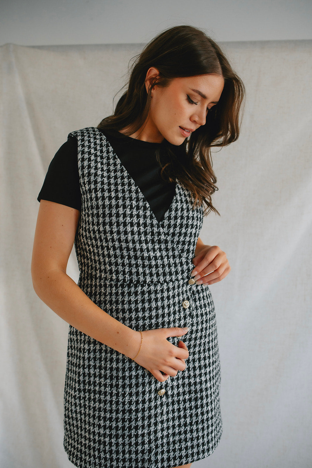 A v-neck tweed pinafore dress in a black and white houndstooth print with gold decorative buttons. This mini dress is perfect for layering with turtlenecks, button-up shirts, and tees!
