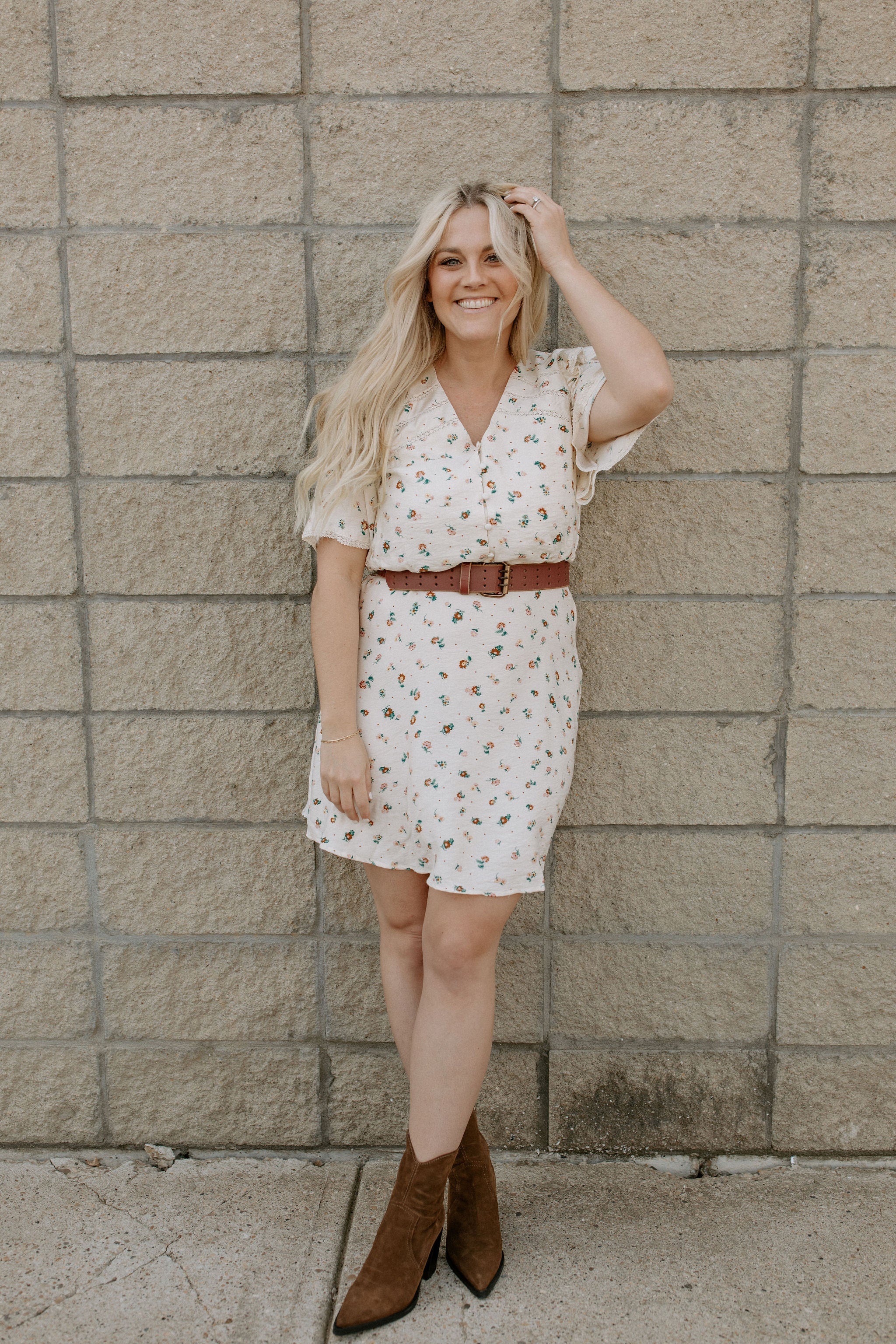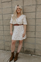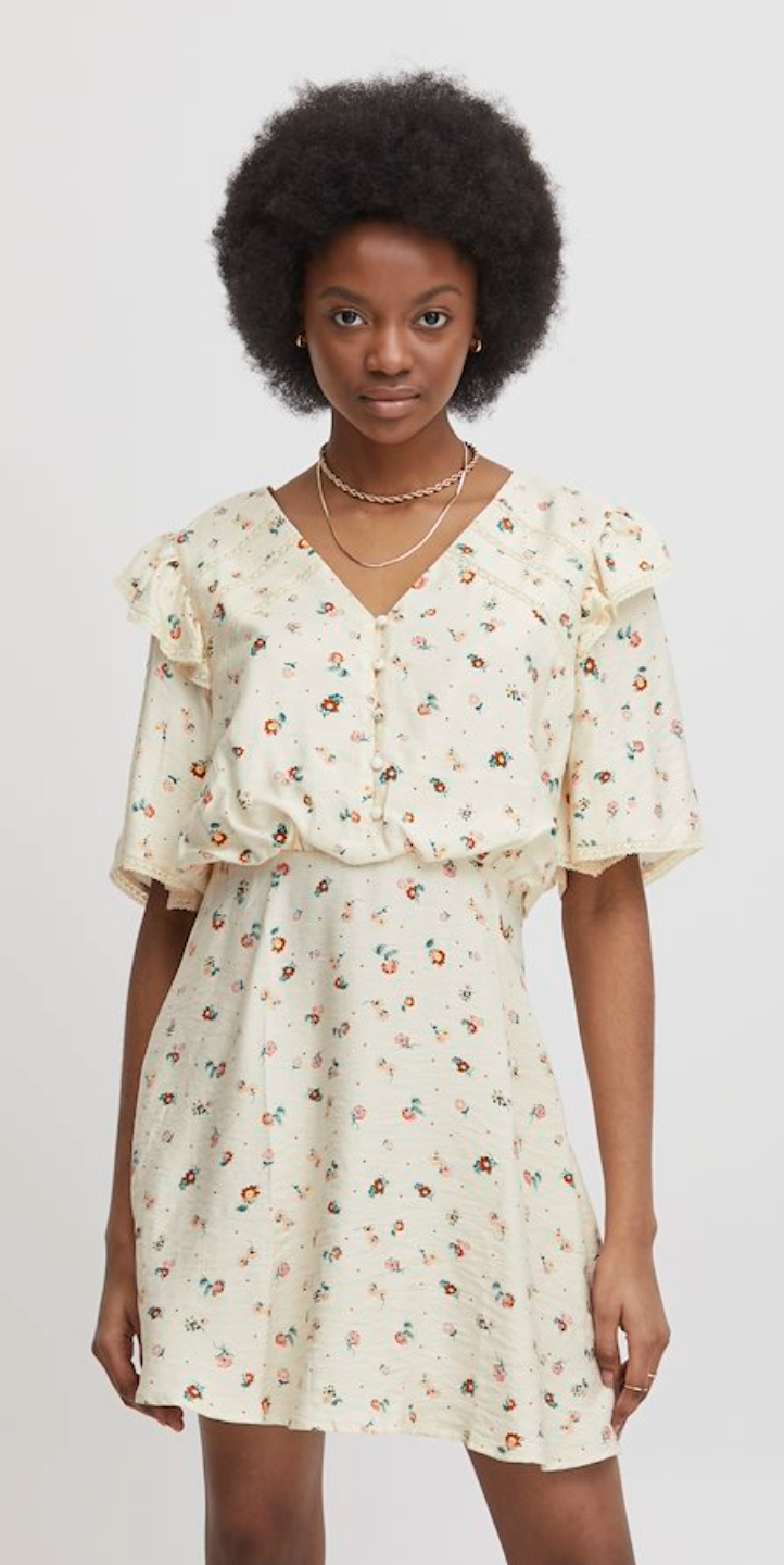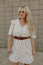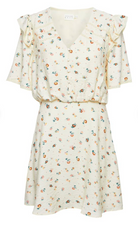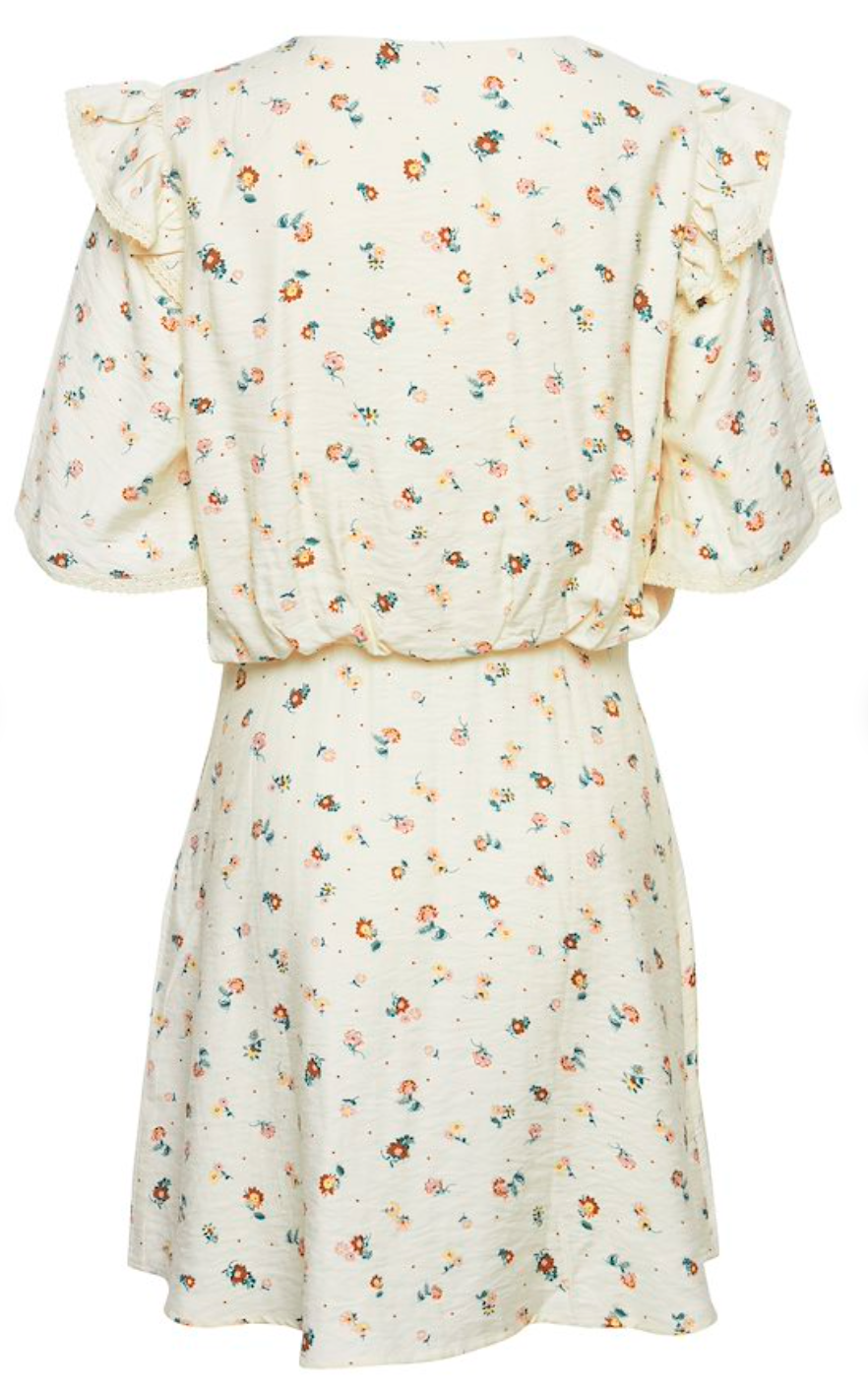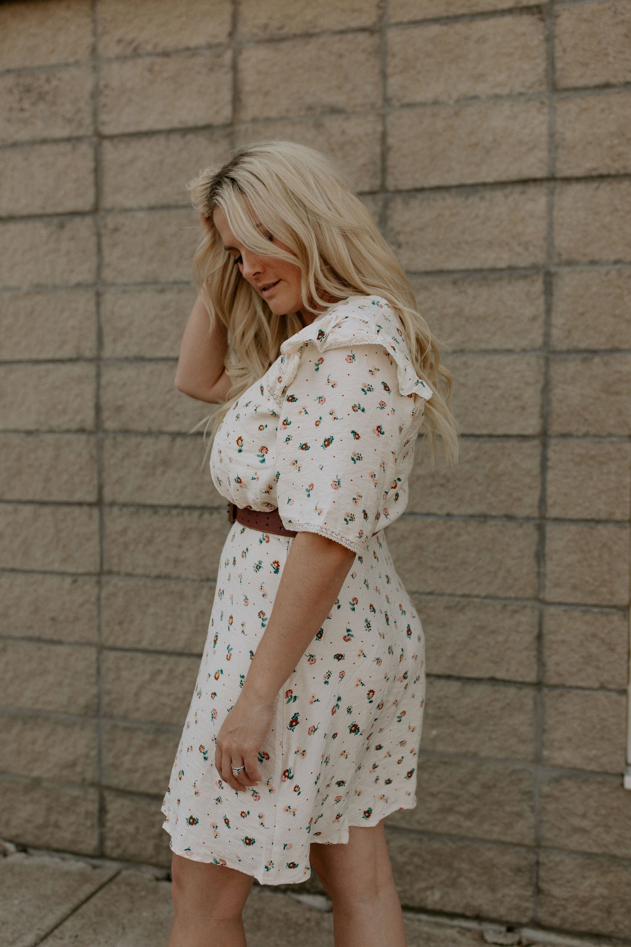 The mini version of the Donna Dress, in all it's stunning finery! The most gorgeous ivory floral pattern, with ruffle and lace details throughout. Comfortable elastic waistband and a flattering v-neck collar.