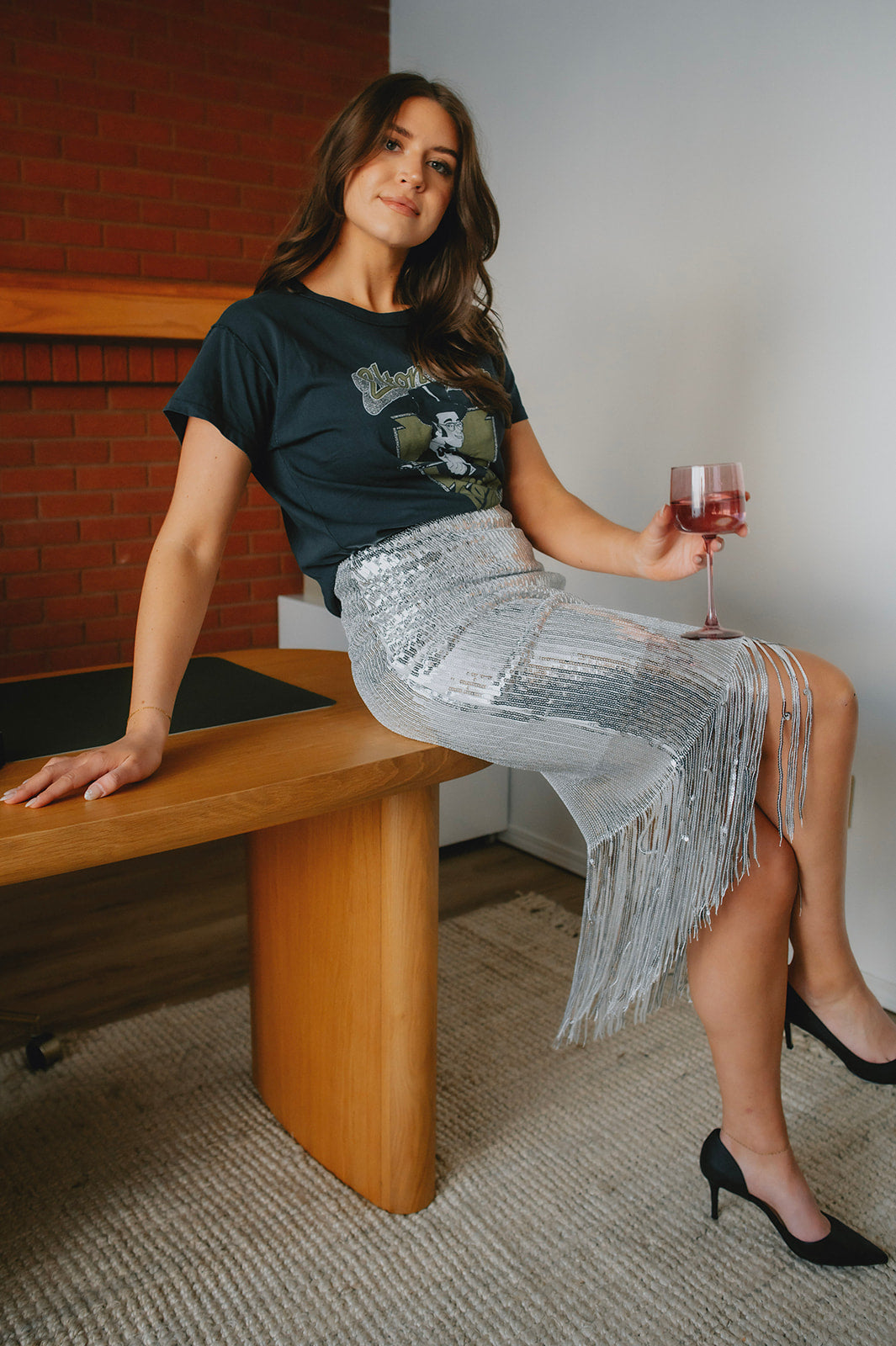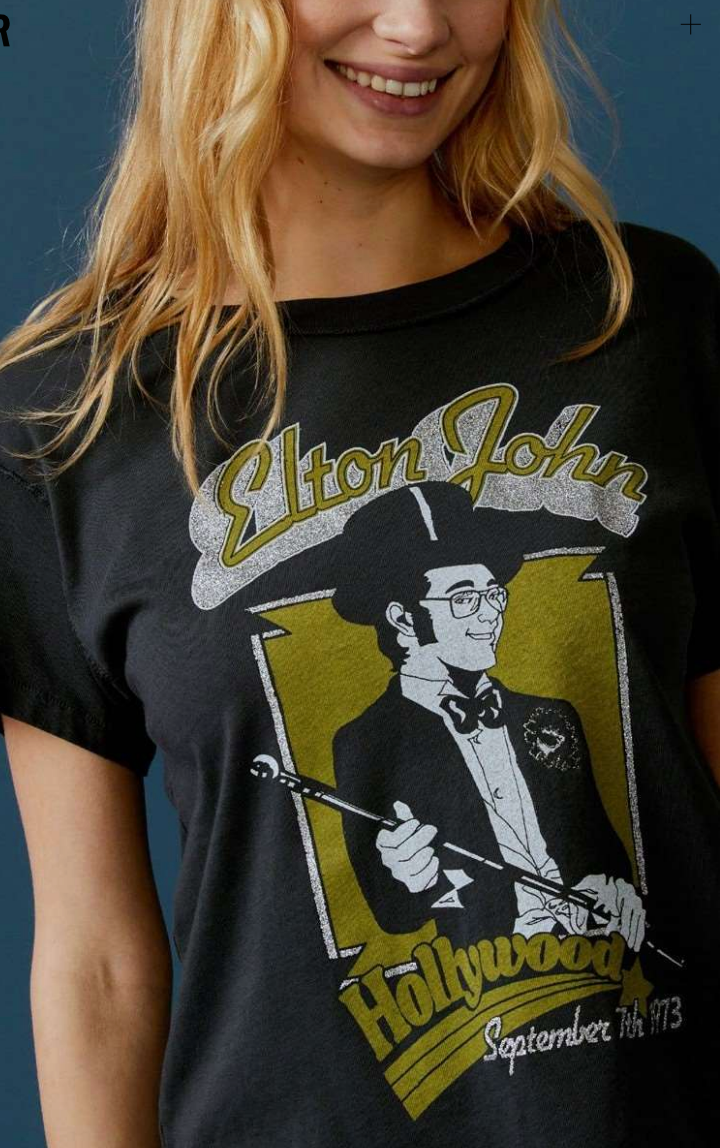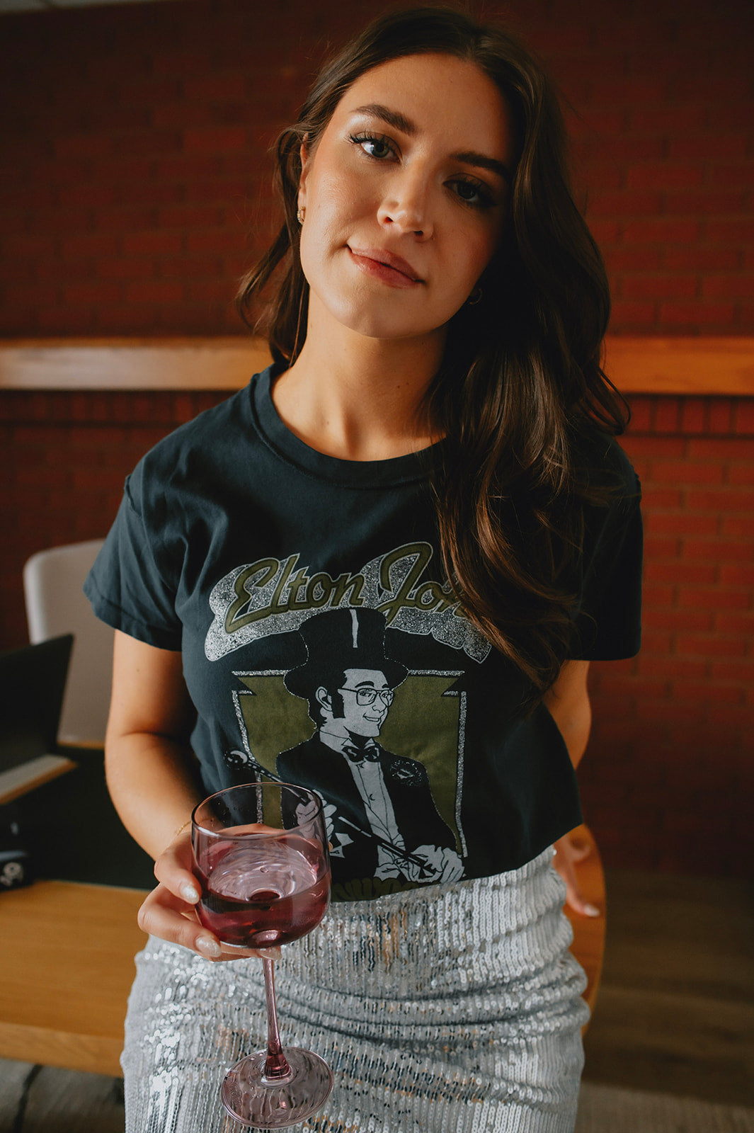 Another Elton John for your collection? A necessity. This reverse girlfriend tee is designed as a nod to Elton’s Hollywood Bowl show on September 7th, 1973 in support of his Goodbye Yellow Brick Road Tour. Featuring a caricature of the glam rock icon accented in glitter to appropriately represent Elton John’s extravagance in stage presence and visuals.