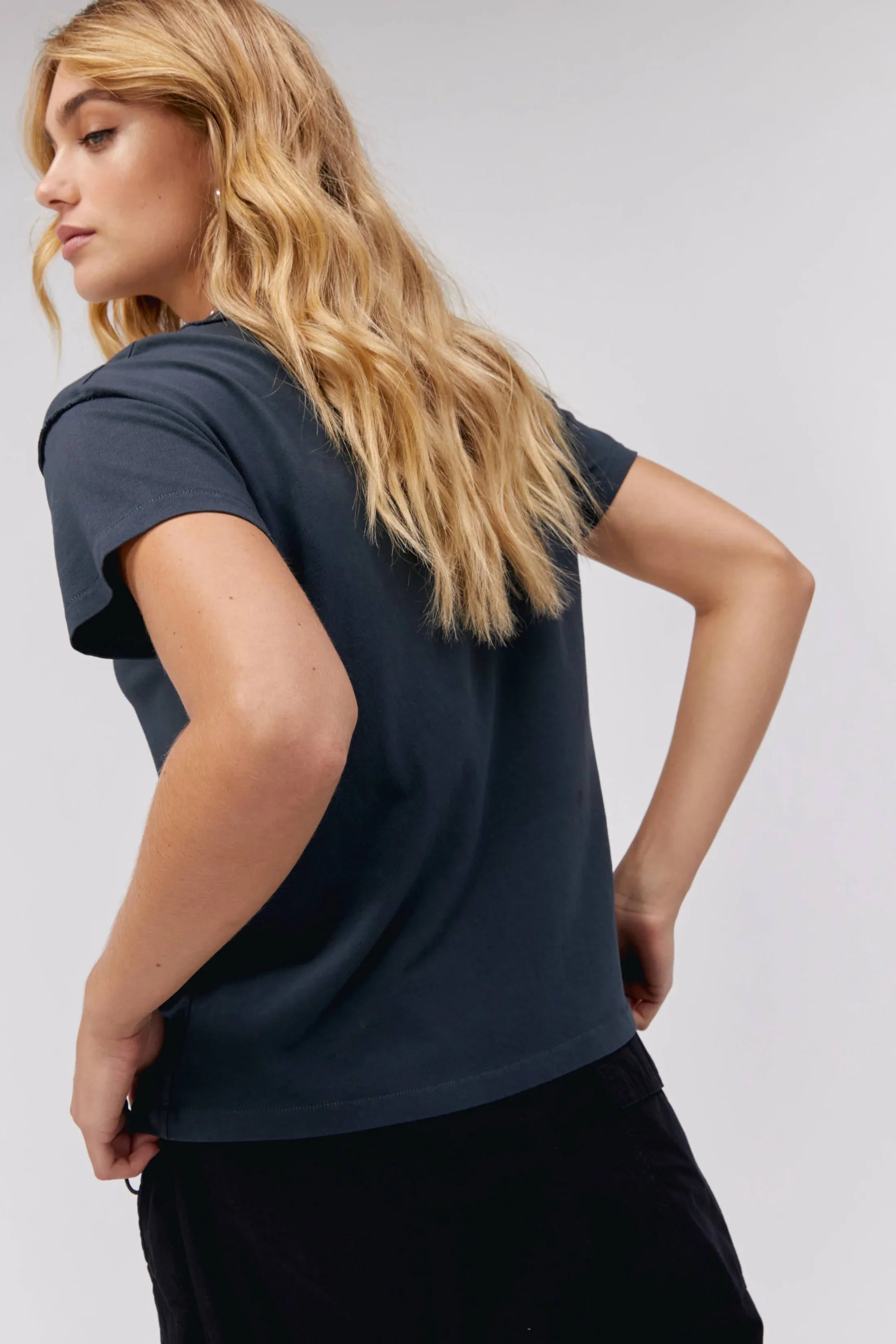 - This slightly shrunken classic tee was constructed to fit 'just right'. Featuring ladder stitch on all hems with shorter sleeves and a not-quite-cropped length, this piece is constructed from tubular fabric just like your favorite vintage tee.