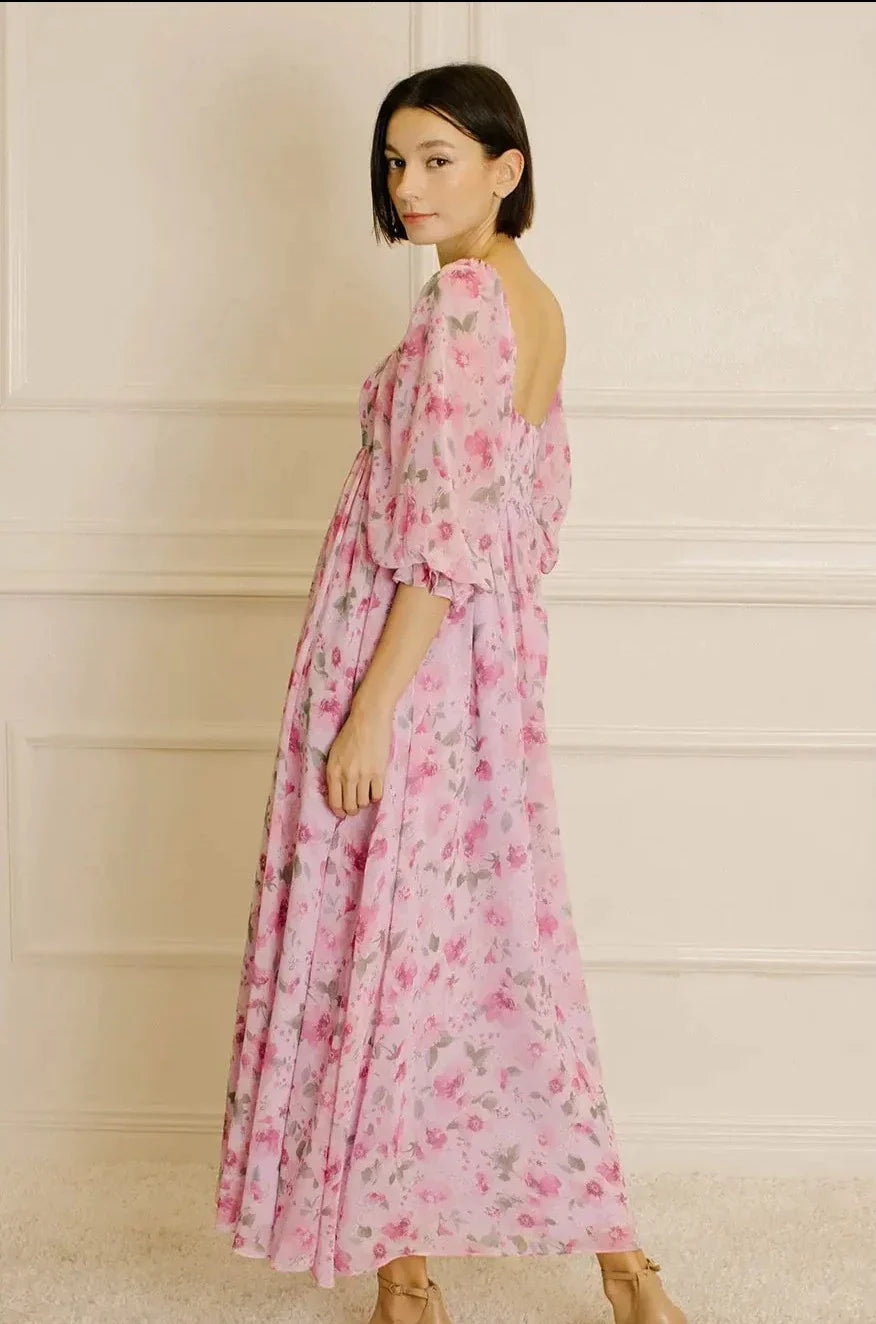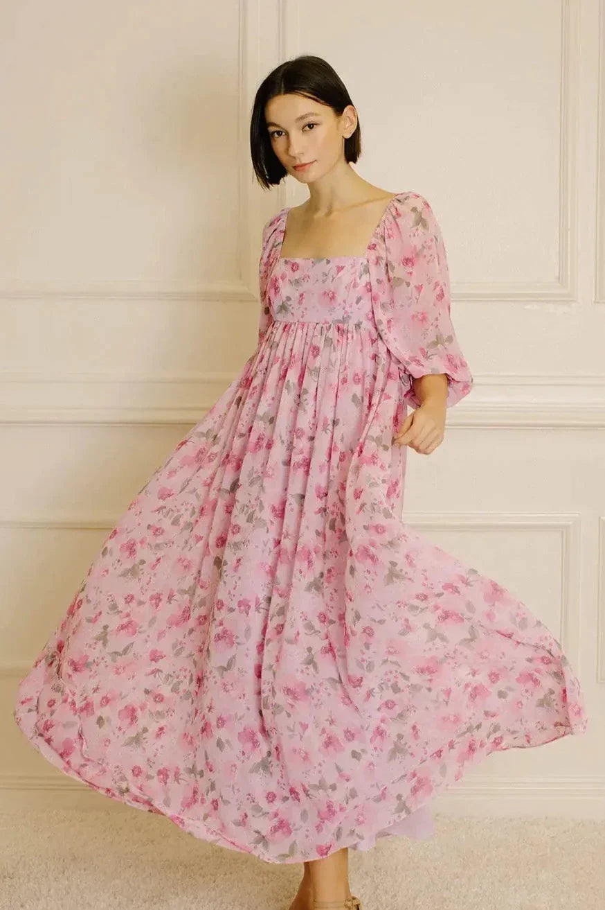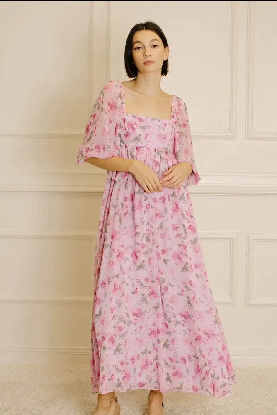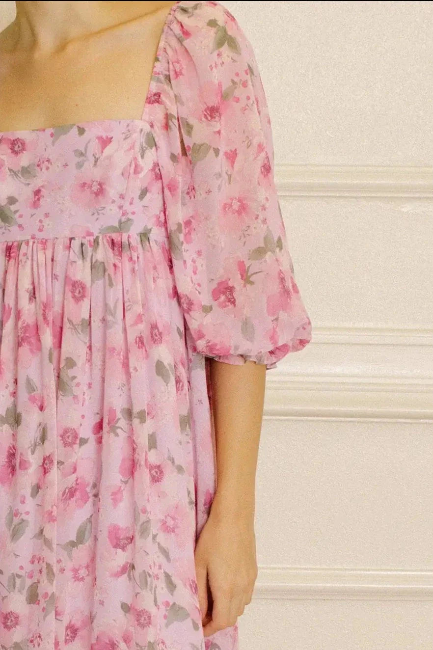 The most romantic magenta pink floral baby doll dress. She has a square neckline, short puffy sleeves, and bust darts. It also has a back zipper and flowy midi bottom. She's bright while still being subdued bringing a balance to your look. She's easy to wear to a wedding or event and throw on with sneakers and a denim jacket on the weekends.