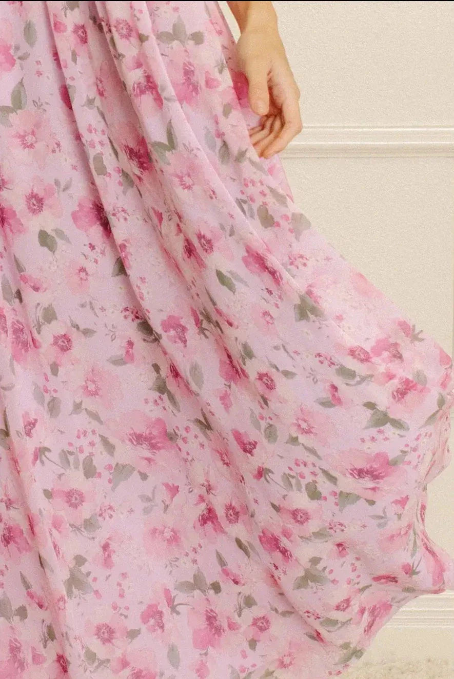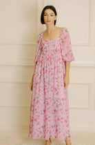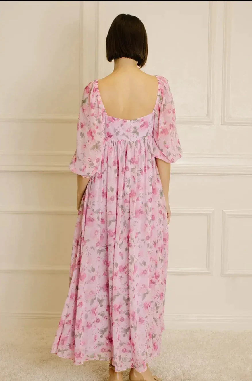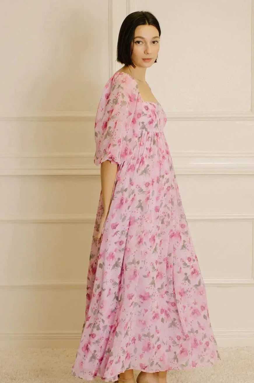 The most romantic magenta pink floral baby doll dress. She has a square neckline, short puffy sleeves, and bust darts. It also has a back zipper and flowy midi bottom. She's bright while still being subdued bringing a balance to your look. She's easy to wear to a wedding or event and throw on with sneakers and a denim jacket on the weekends.