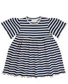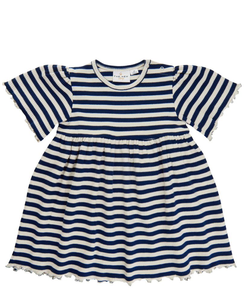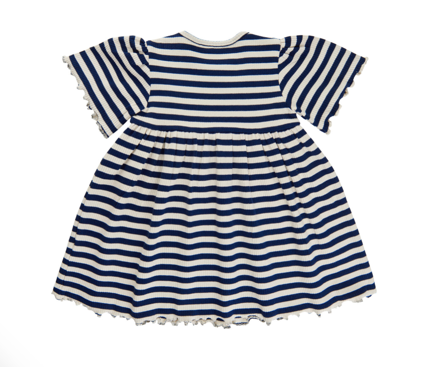 Cool navy and white striped dress with short sleeves. It is a soft organic cotton dress with a stylish rib pattern and lettuce edge details. Perfect for mild to warm weather. Pair with colour tights, shoes and accessories for a happy spring outfit!