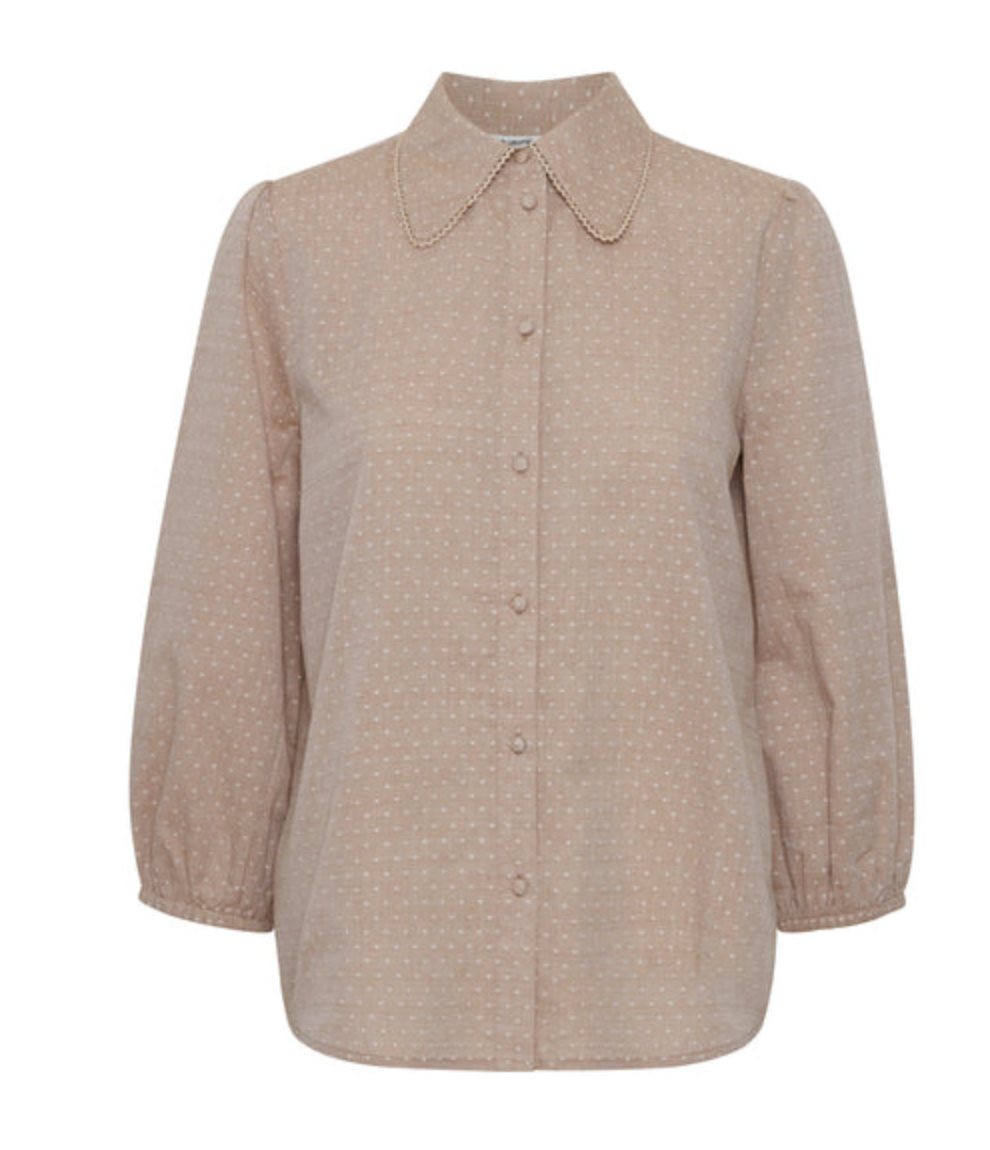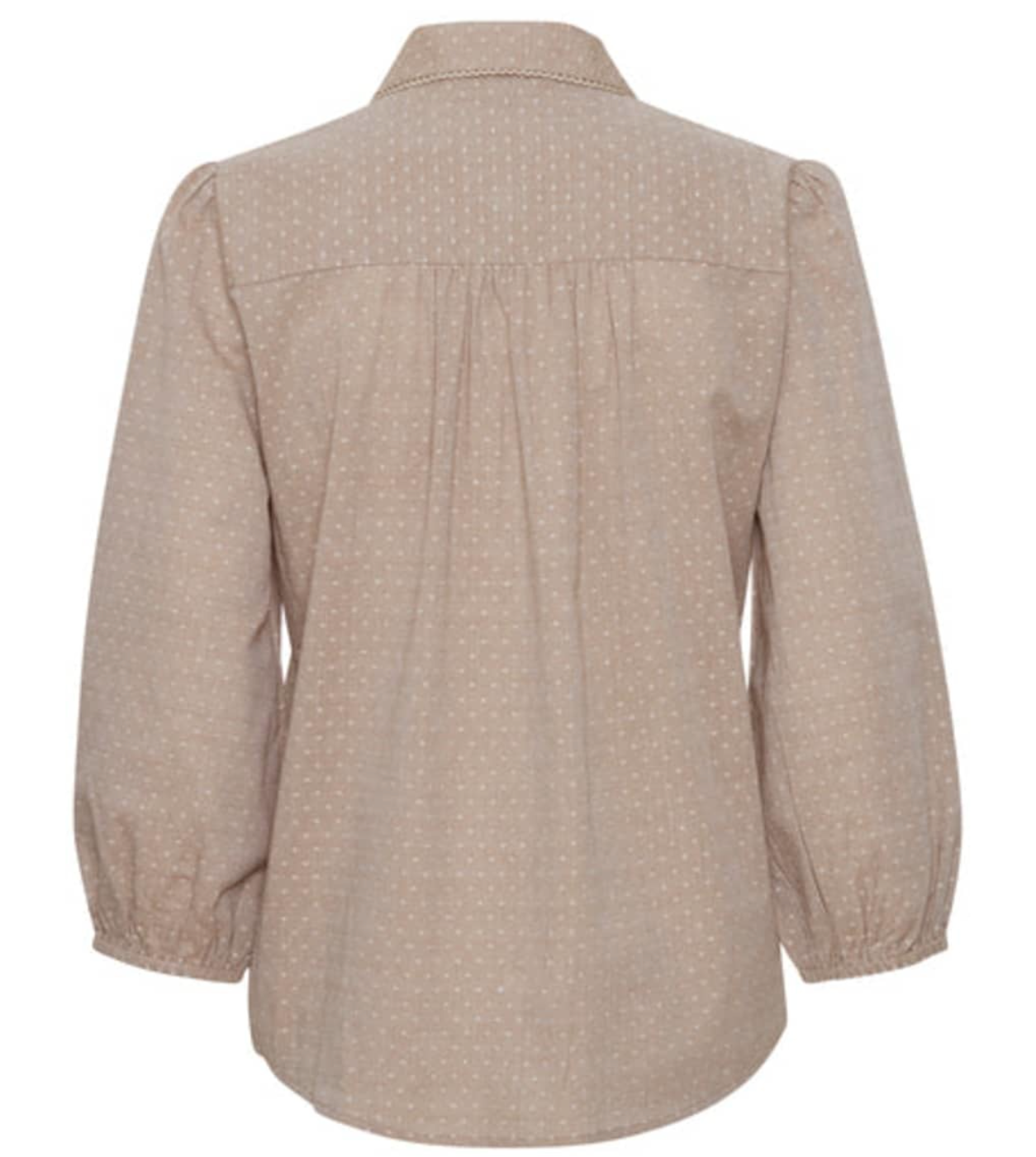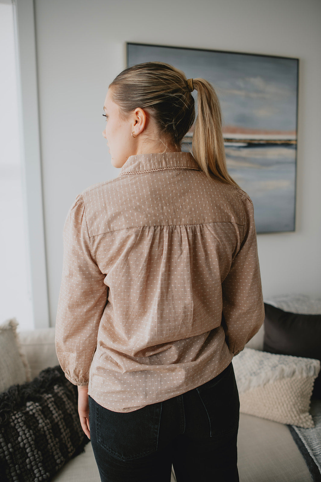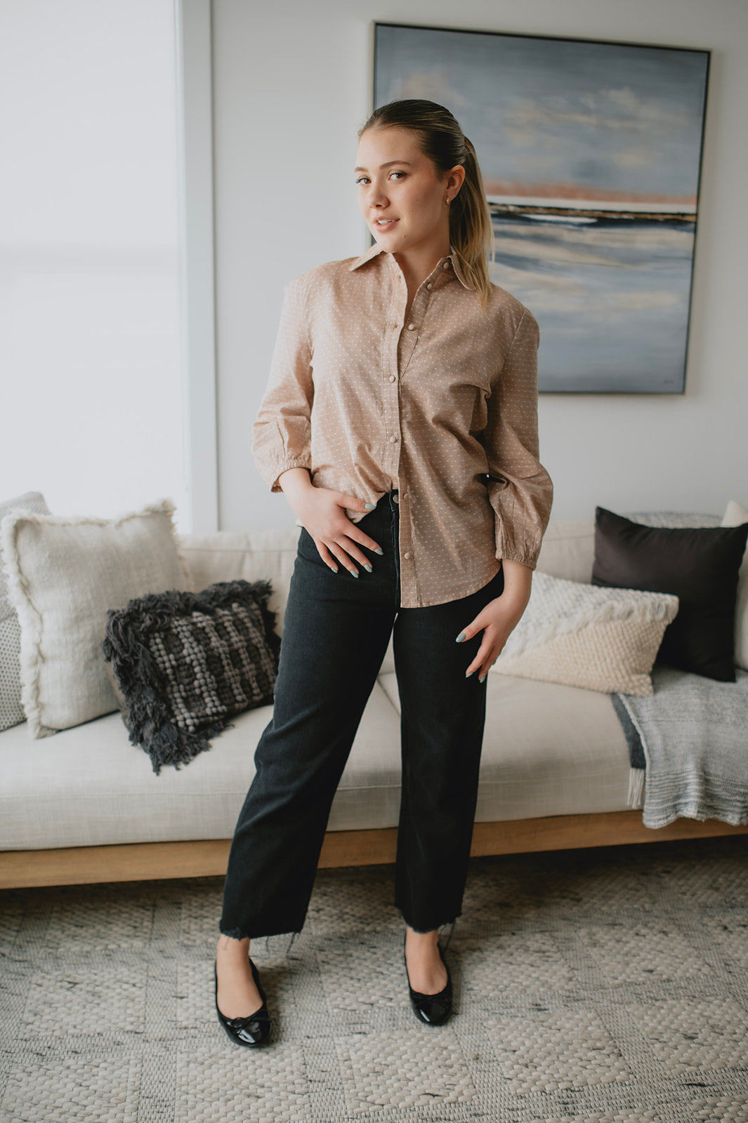 We love this neutral, darling top! From the little spots on the fabric, to the rounded collar, the details on this top are perfect. Easily works for work or play!