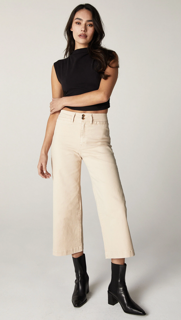 Gemma, our fan favourite high-rise cropped wide leg pant. Hugging at your waist and hips, our comfort stretch twill gives just the right amount of movement. Featuring double sew on buttons, zip fly closure and tonal stitching.