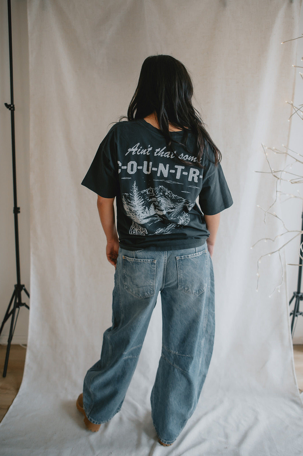 - Features: Button closure, rigid denim fabrication, belt loops at waistband, 4-pocket style, subtle distressing, tapered bottom hem, seam detail throughout