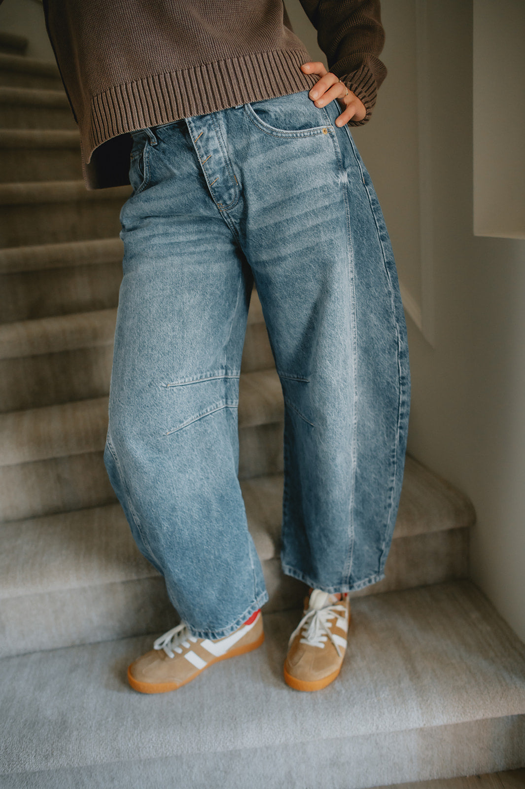 The FREE PEOPLE Good Luck Mid Rise Barrel Jean is the perfect addition to your denim collection. These playful jeans feature a mid-rise fit, subtle distressed detailing, and wide-legs that taper at the ankle. With a button closure, rigid denim fabrication, and belt loops at the waistband, these jeans are both stylish and practical. Plus, the 4-pocket style, subtle distressing, and tapered bottom hem add unique details to this casual and approachable pair.
