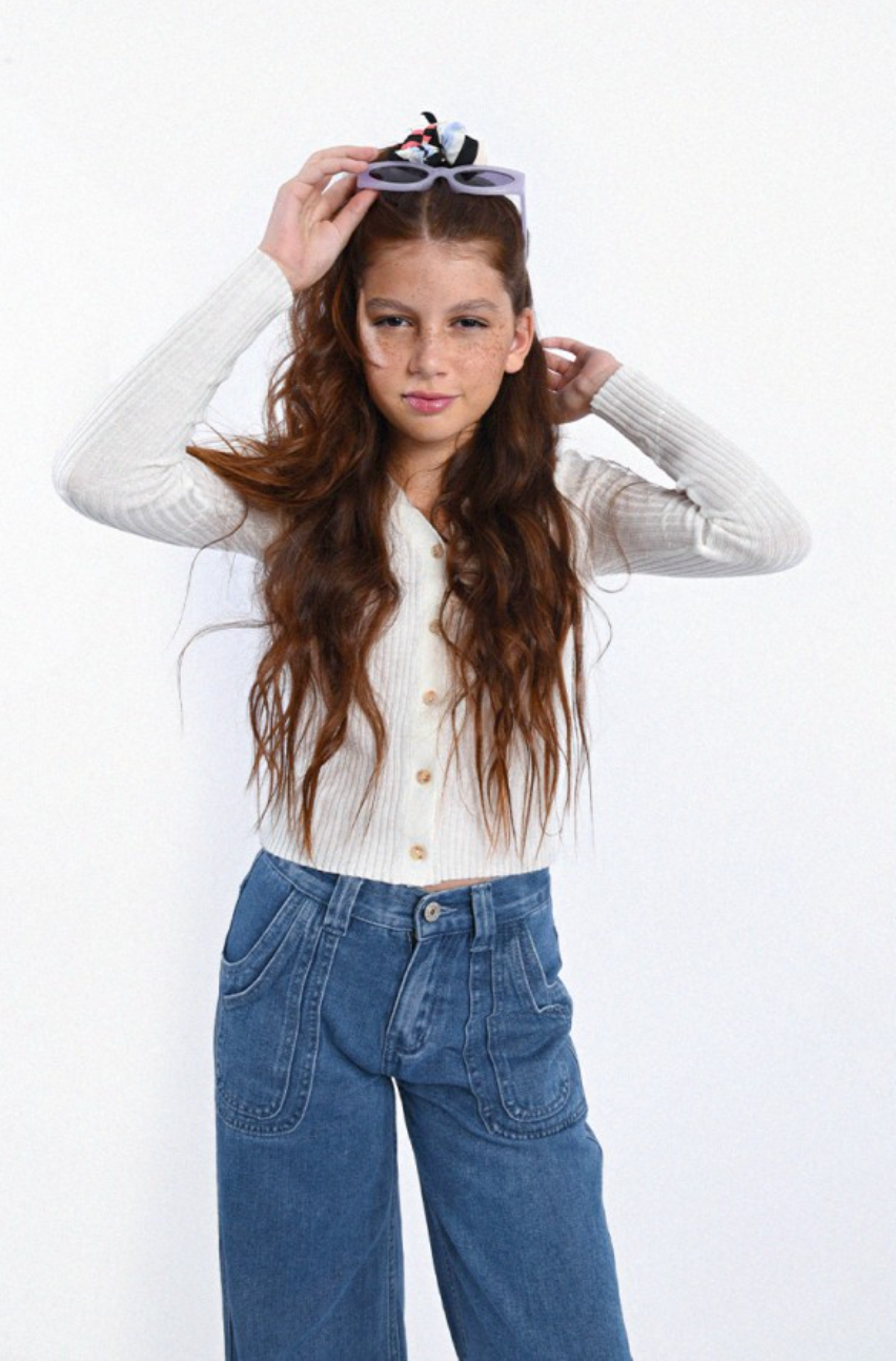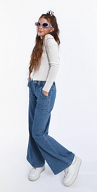 A super rad wide leg denim for your super rad girl. Wide leg, stitched exposed front pockets.
