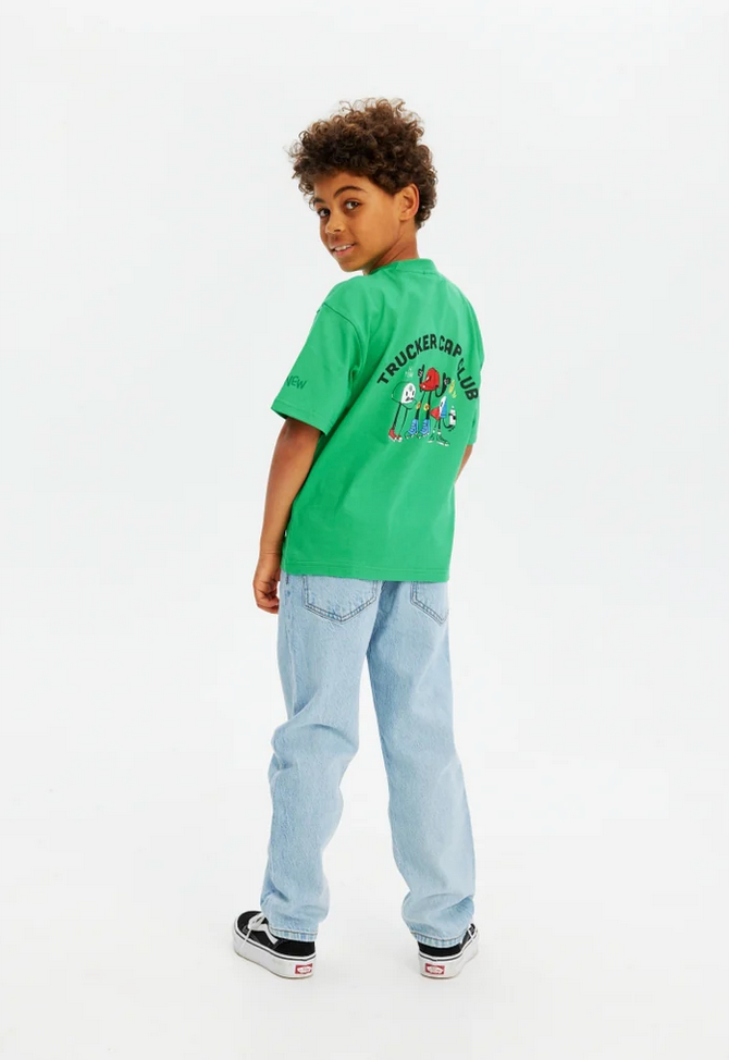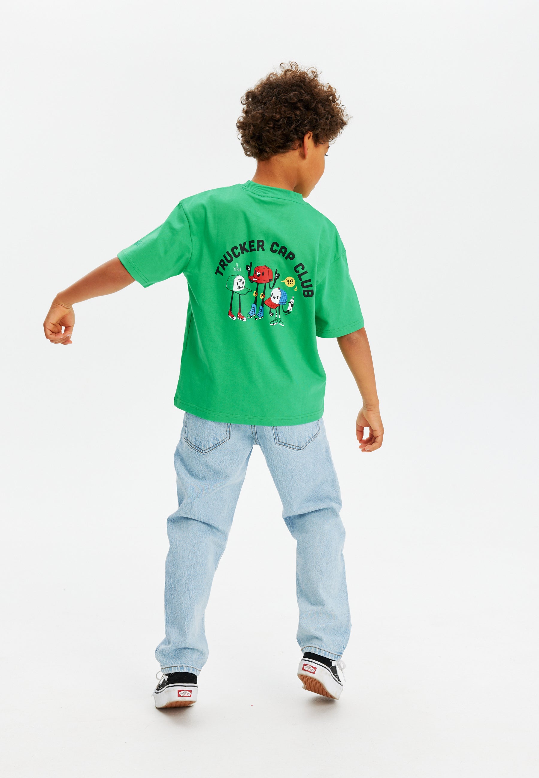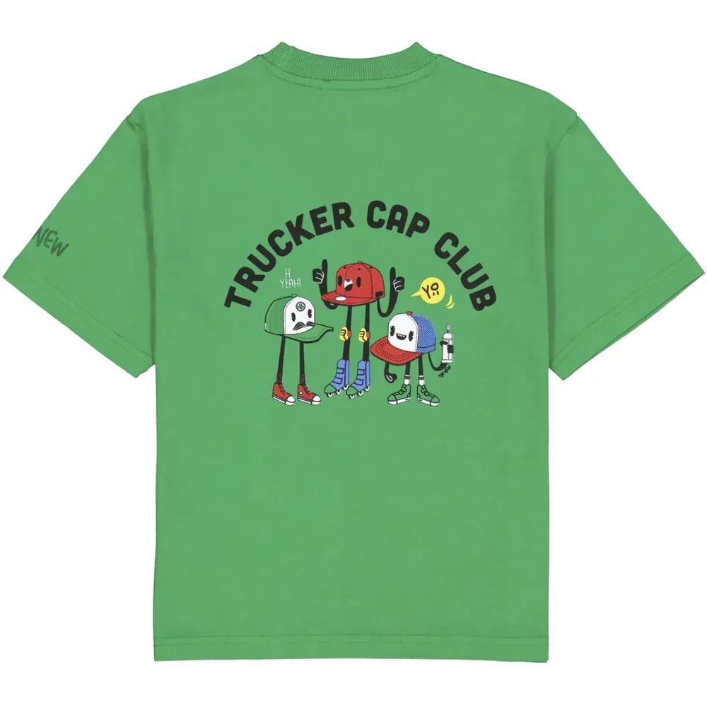 Vibrant green and oversized THE NEW t-shirt featuring a humorous animated print. The chest features a small print of a cap with arms and legs, and the back of the t-shirt, features a larger print of three similar cap characters along with the text "TRUCKER CAP CLUB." It is a comfy and casual t-shirt for boys, as it is crafted from organic cotton, which makes it soft, breathable, and gentle to the skin.