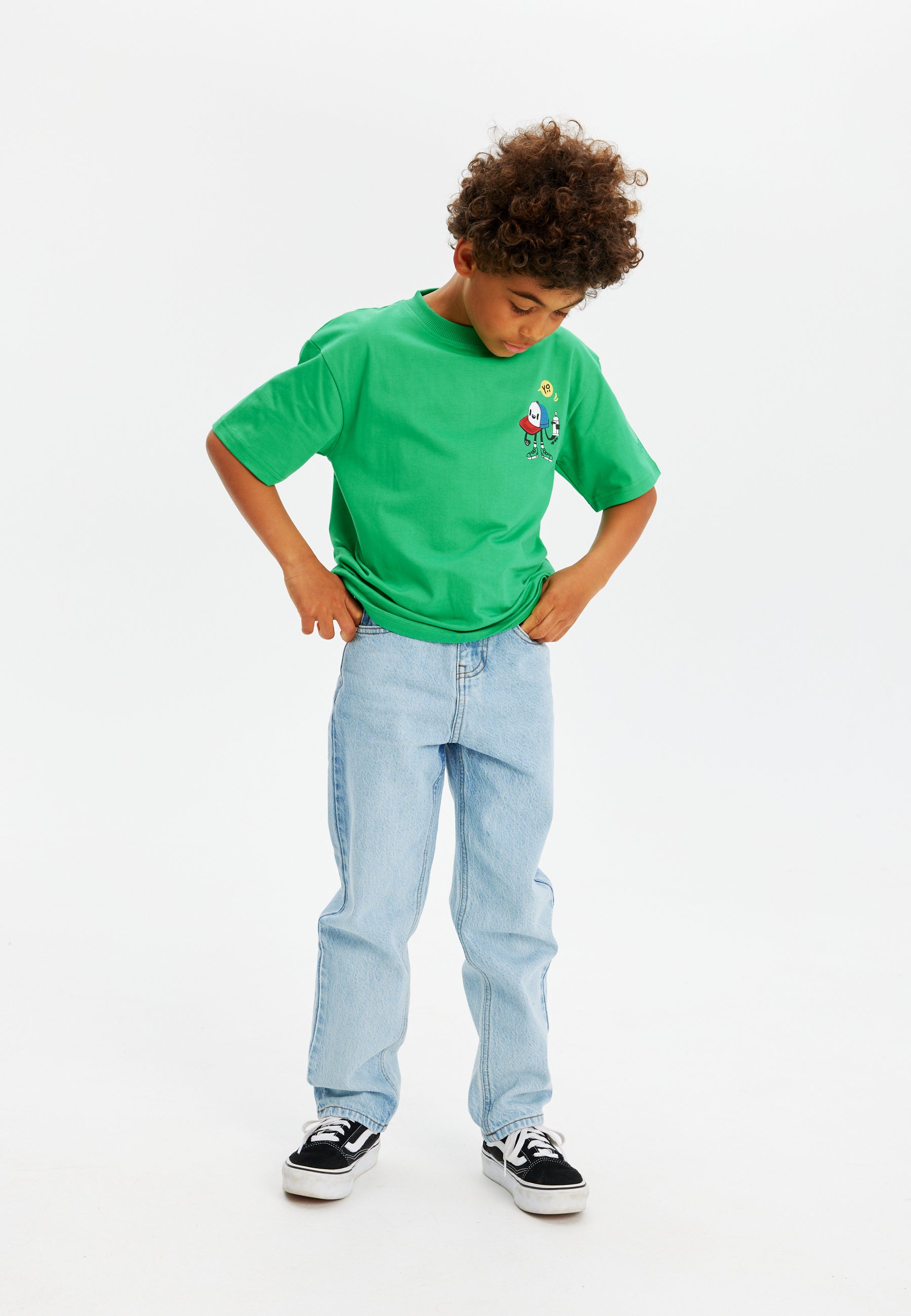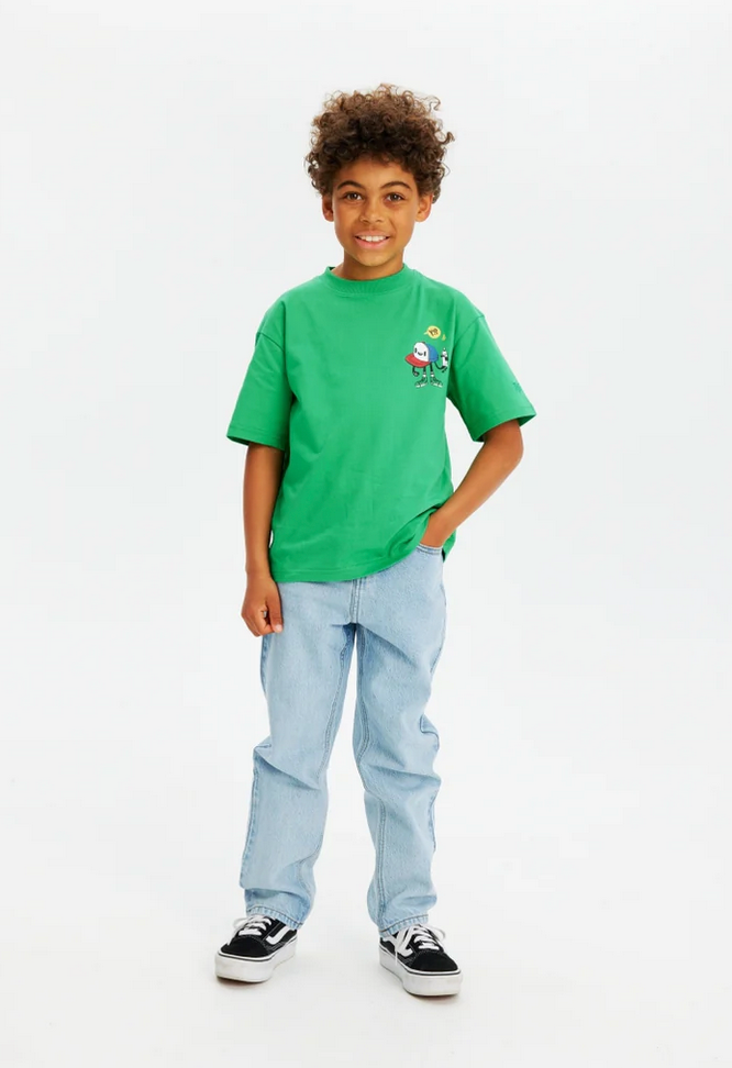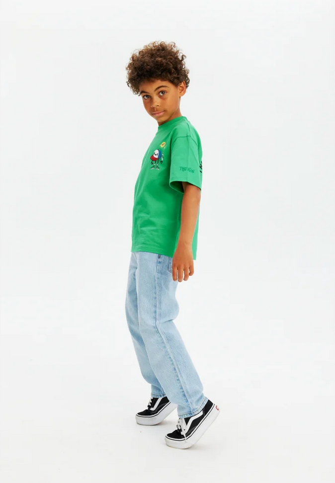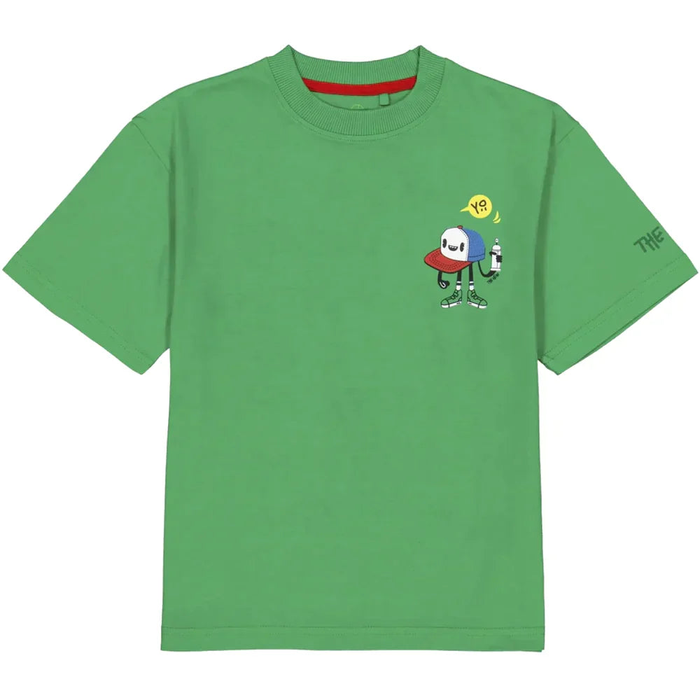 Vibrant green and oversized THE NEW t-shirt featuring a humorous animated print. The chest features a small print of a cap with arms and legs, and the back of the t-shirt, features a larger print of three similar cap characters along with the text "TRUCKER CAP CLUB." It is a comfy and casual t-shirt for boys, as it is crafted from organic cotton, which makes it soft, breathable, and gentle to the skin.