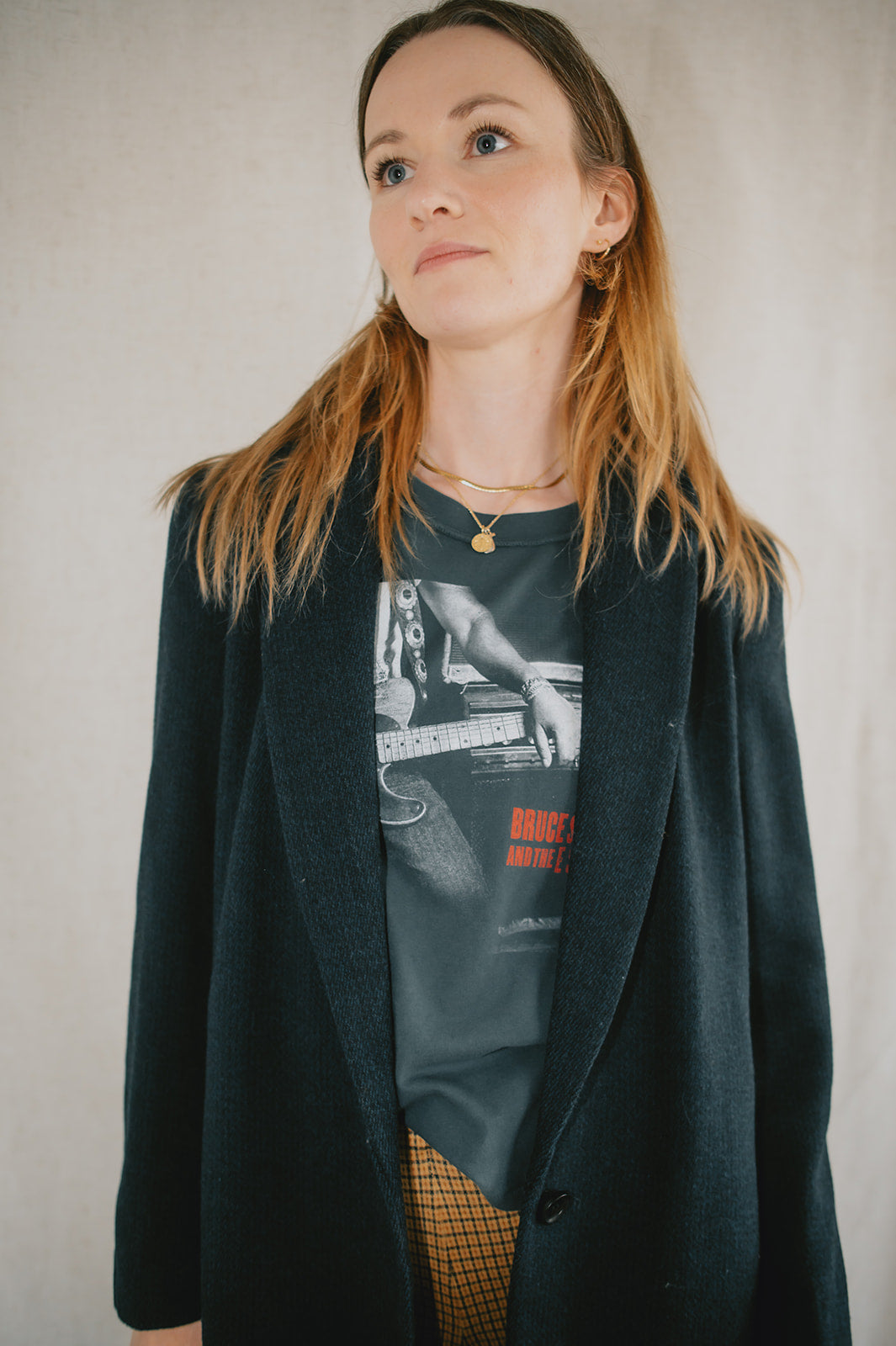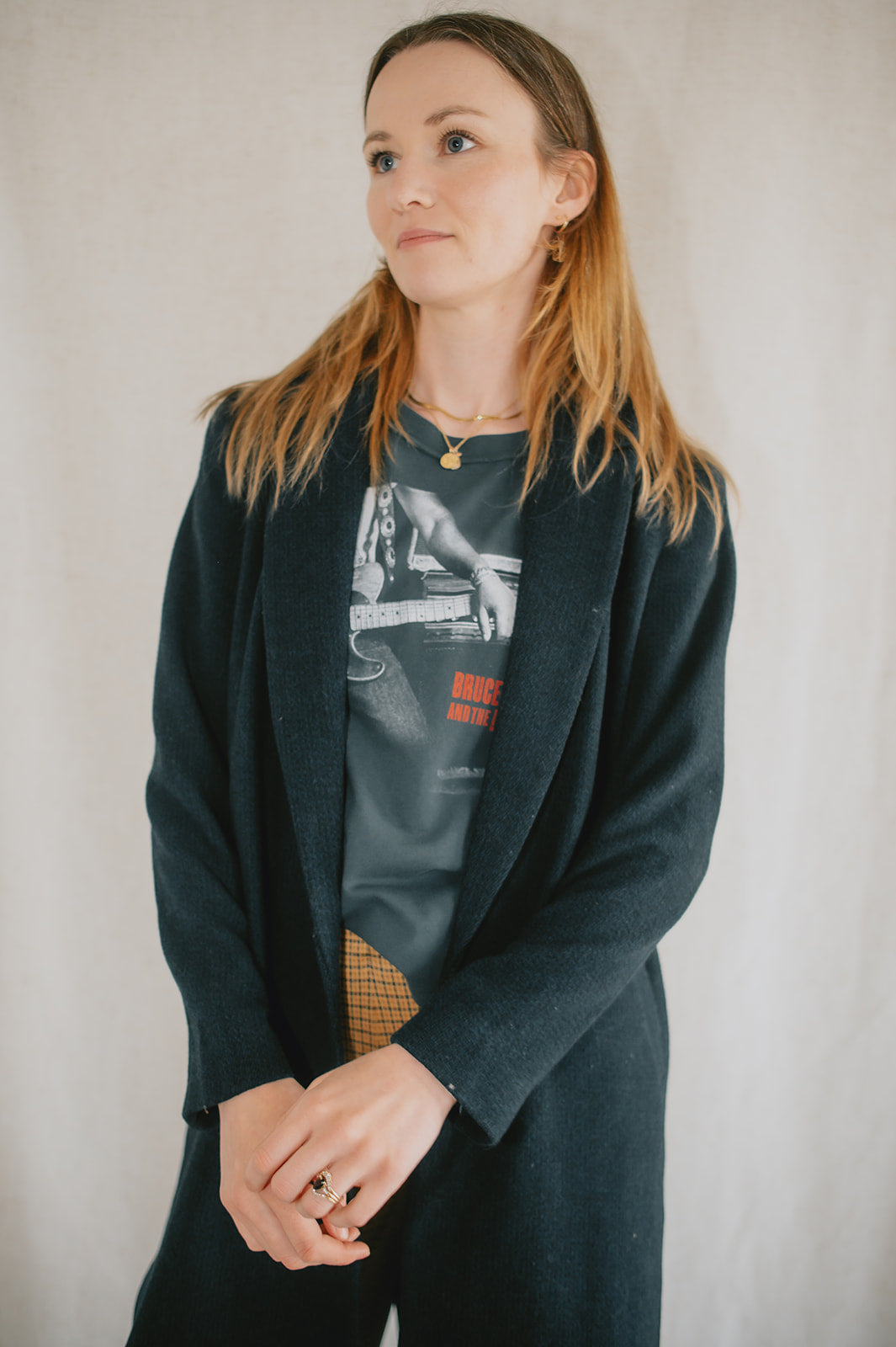 Luxury at it's finest! This beautiful long jacket is the jacket of the season. The long line and one button closure silhouette is so classic and timeless. The cobalt satin on the inside adds that little bit of romance.