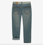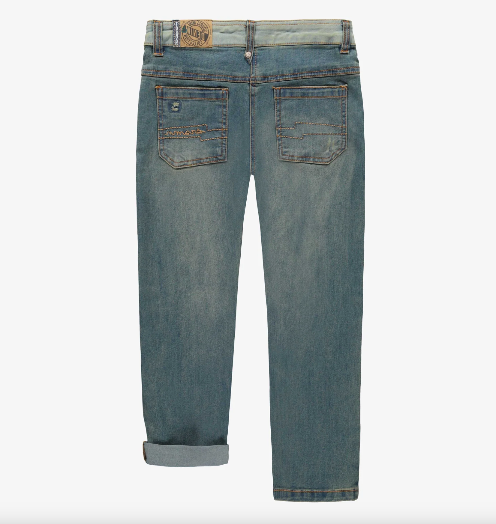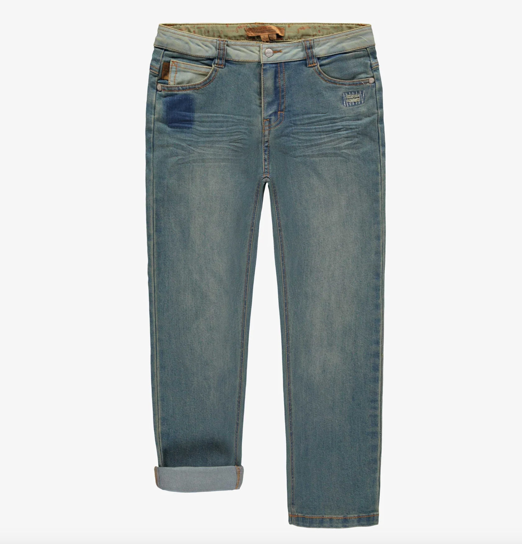 Relaxed fit denim pants with a belt with elastic loops, patches of different color at the knees and with a worn effect.