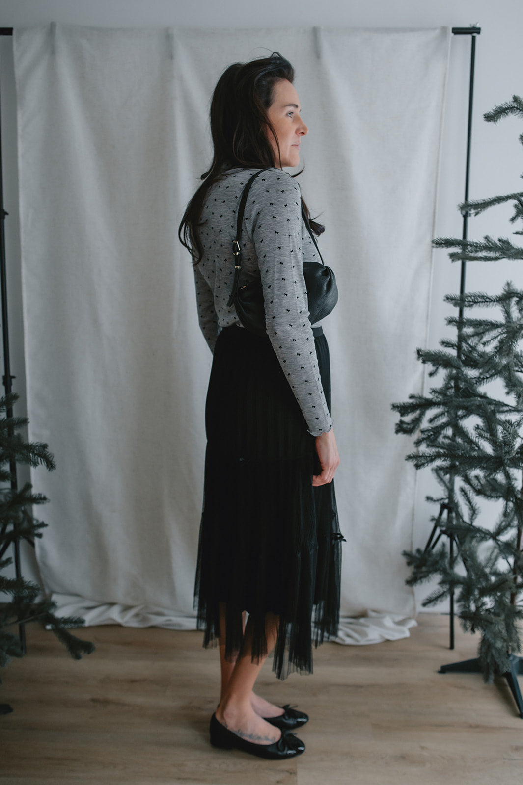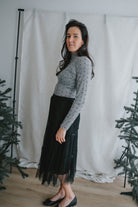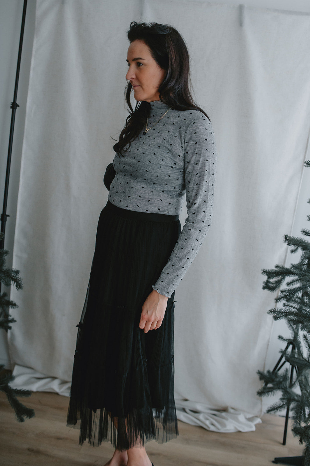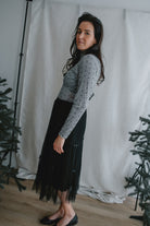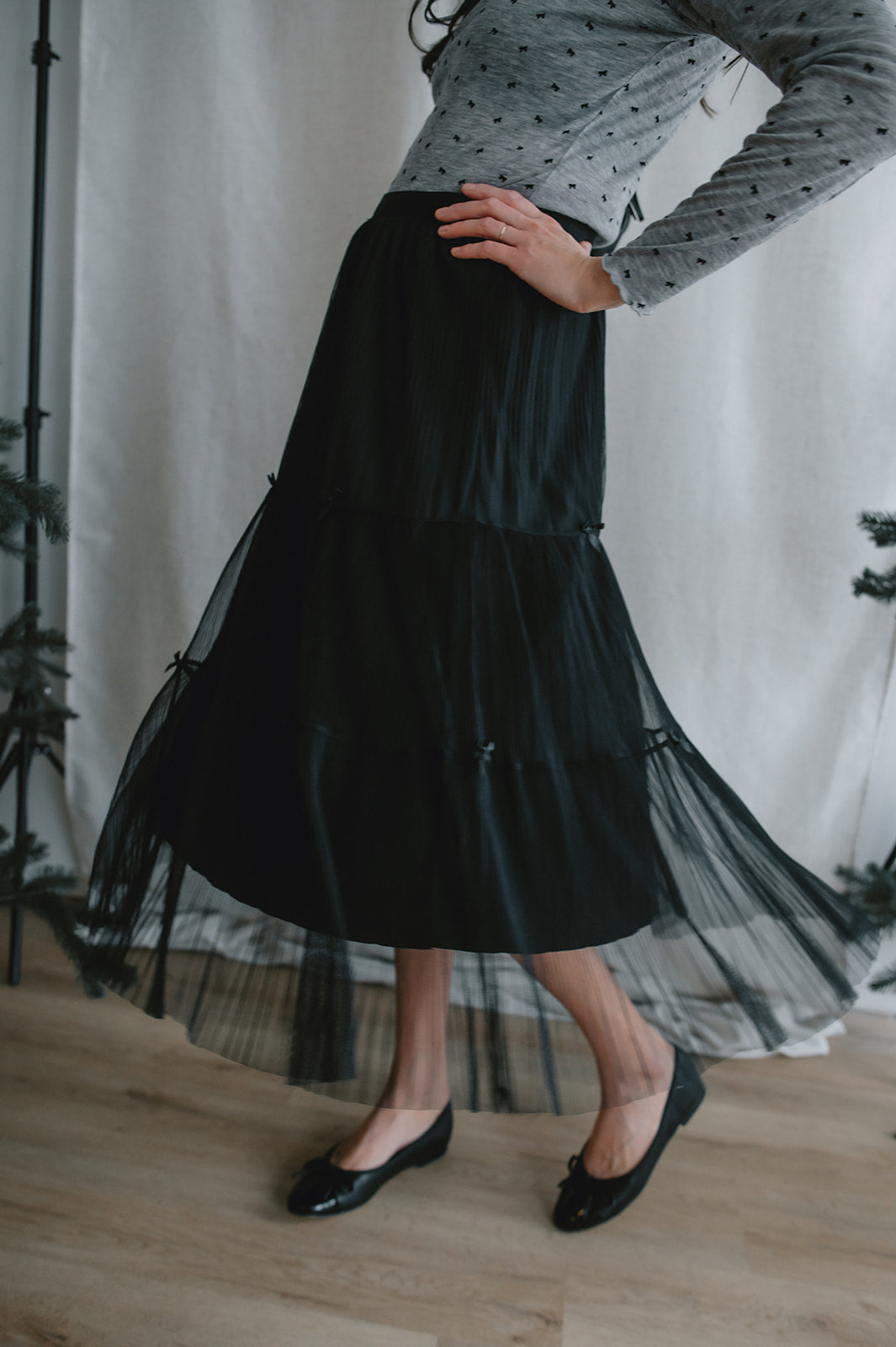 Elevate your occasion wear with this elegant black midi dress crafted in soft, flowing tulle. Designed with a long, semi-sheer tulle skirt and a high waist for a flattering, feminine silhouette, this dress blends romance with modern sophistication. The skirt is fully lined for comfortable coverage, while delicate decorative bow details add a charming, elevated finish.