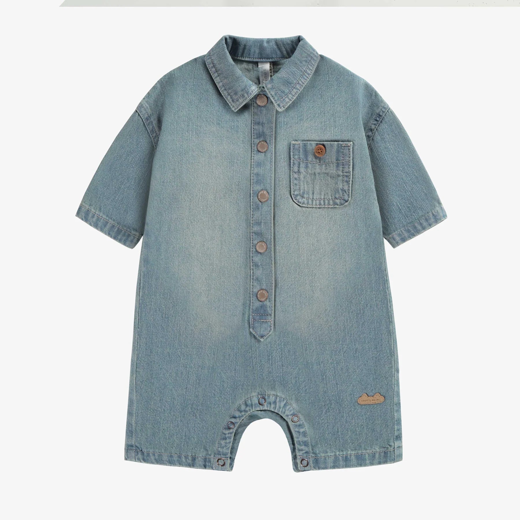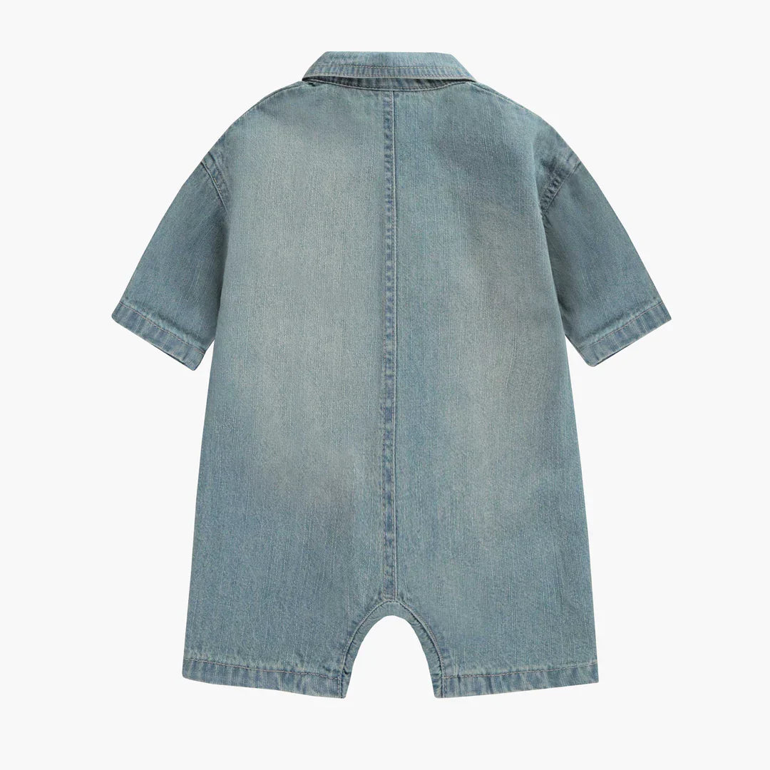 Loose fit one piece in light blue denim with a minimalist look with long sleeves and dropped shoulders. Practical opening of buttons at the front and crotch. Lightweight denim offering comfort and fluidity.