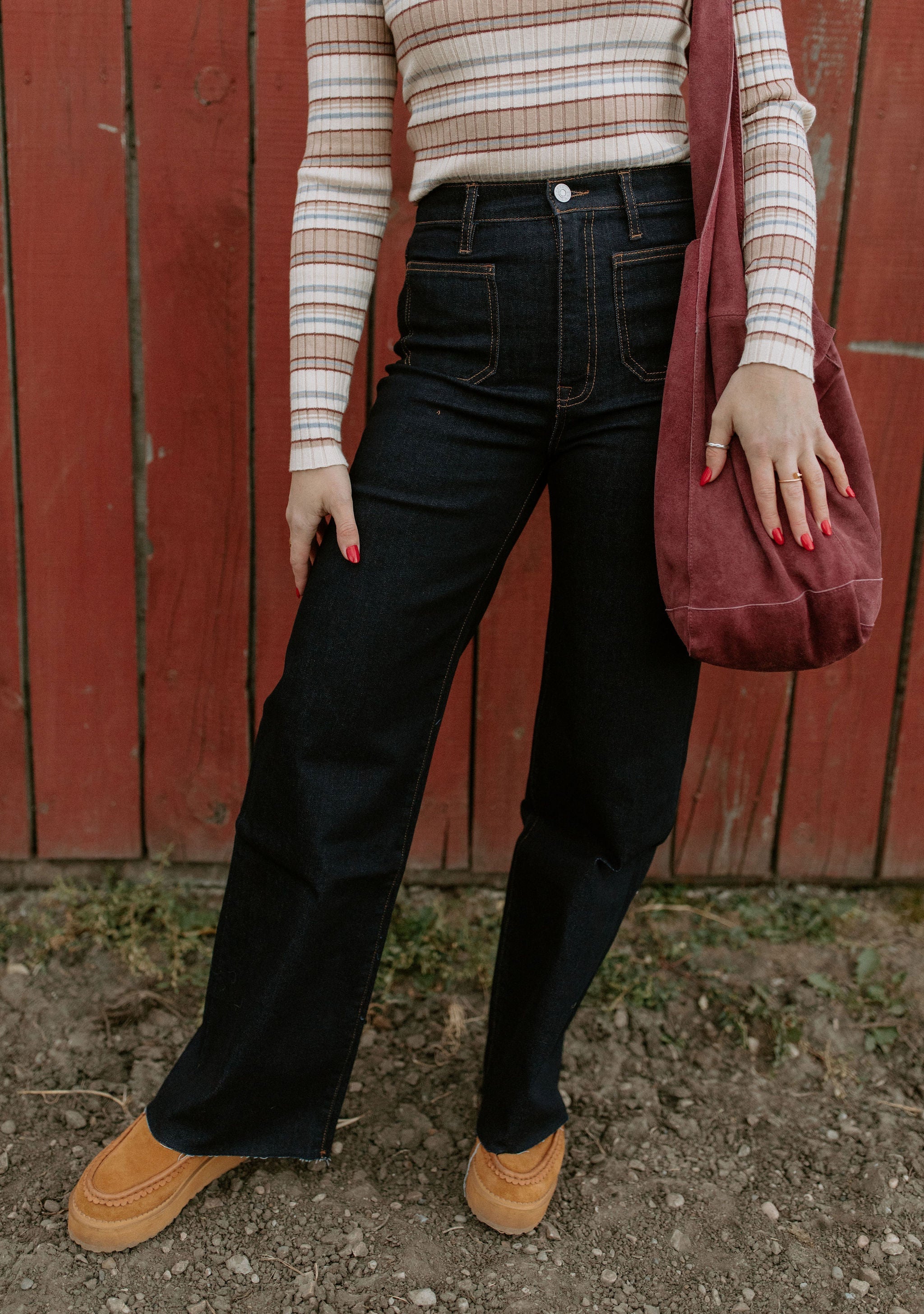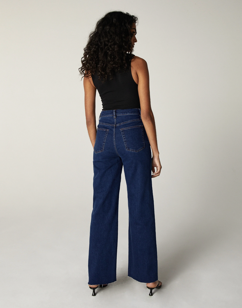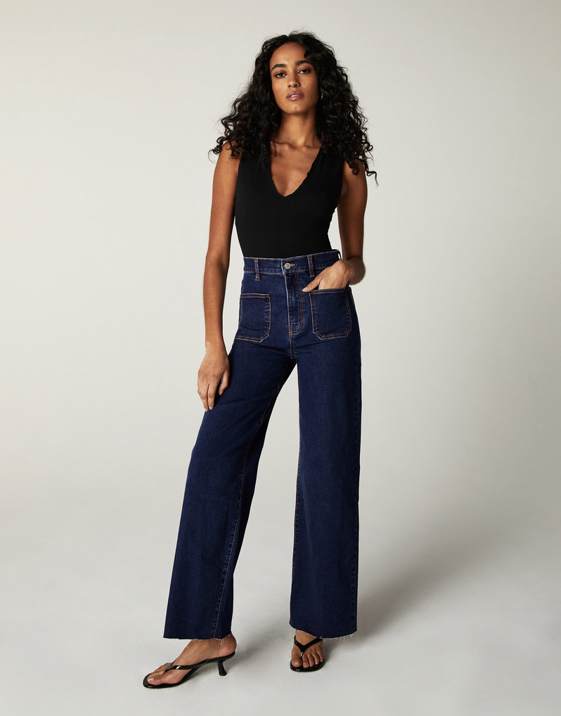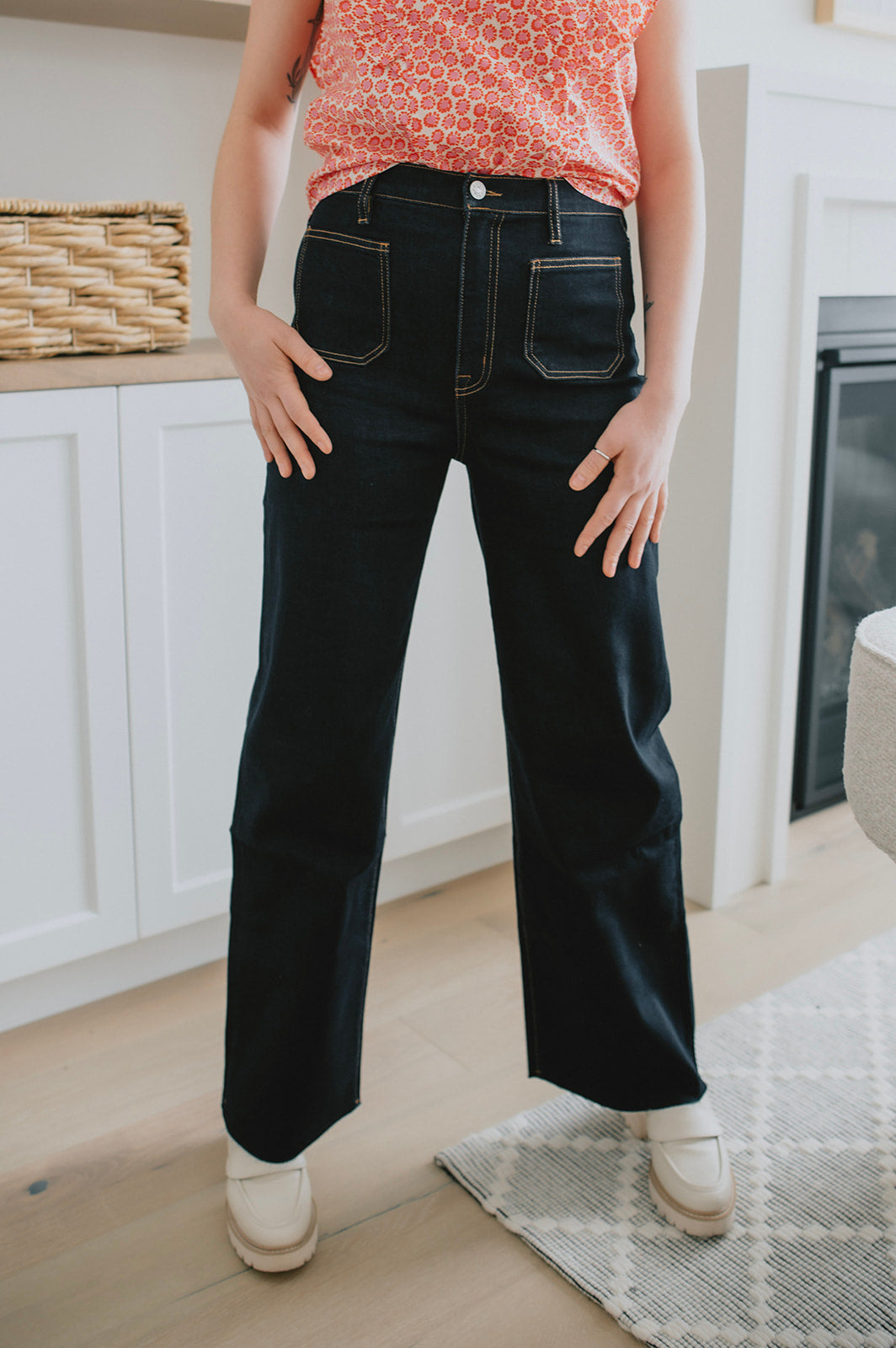Noemi, a fan favourite high-rise wide leg. Now in a longer, full-length inseam. Featuring sailor-pocket styling and antique nickel hardware.