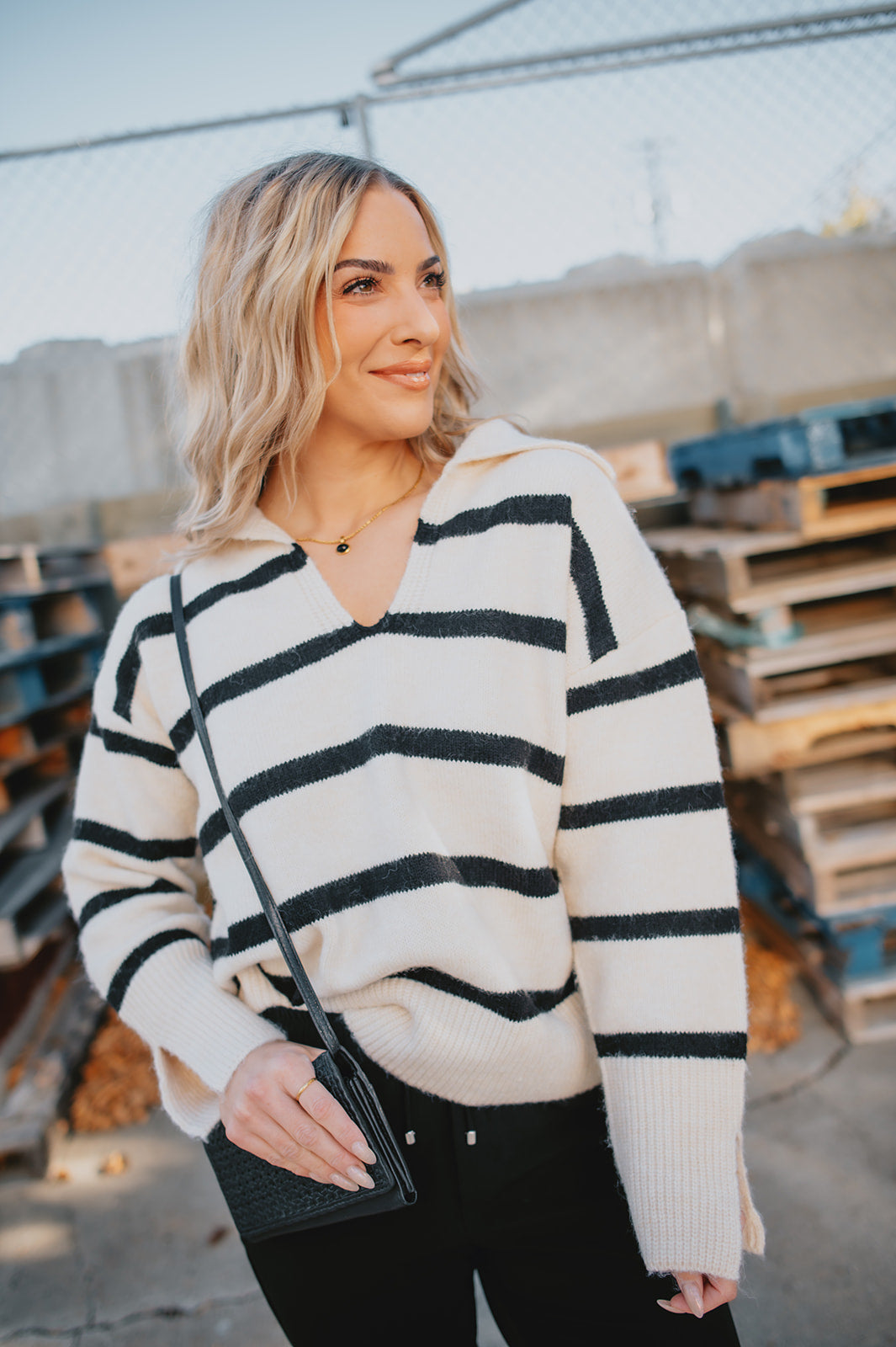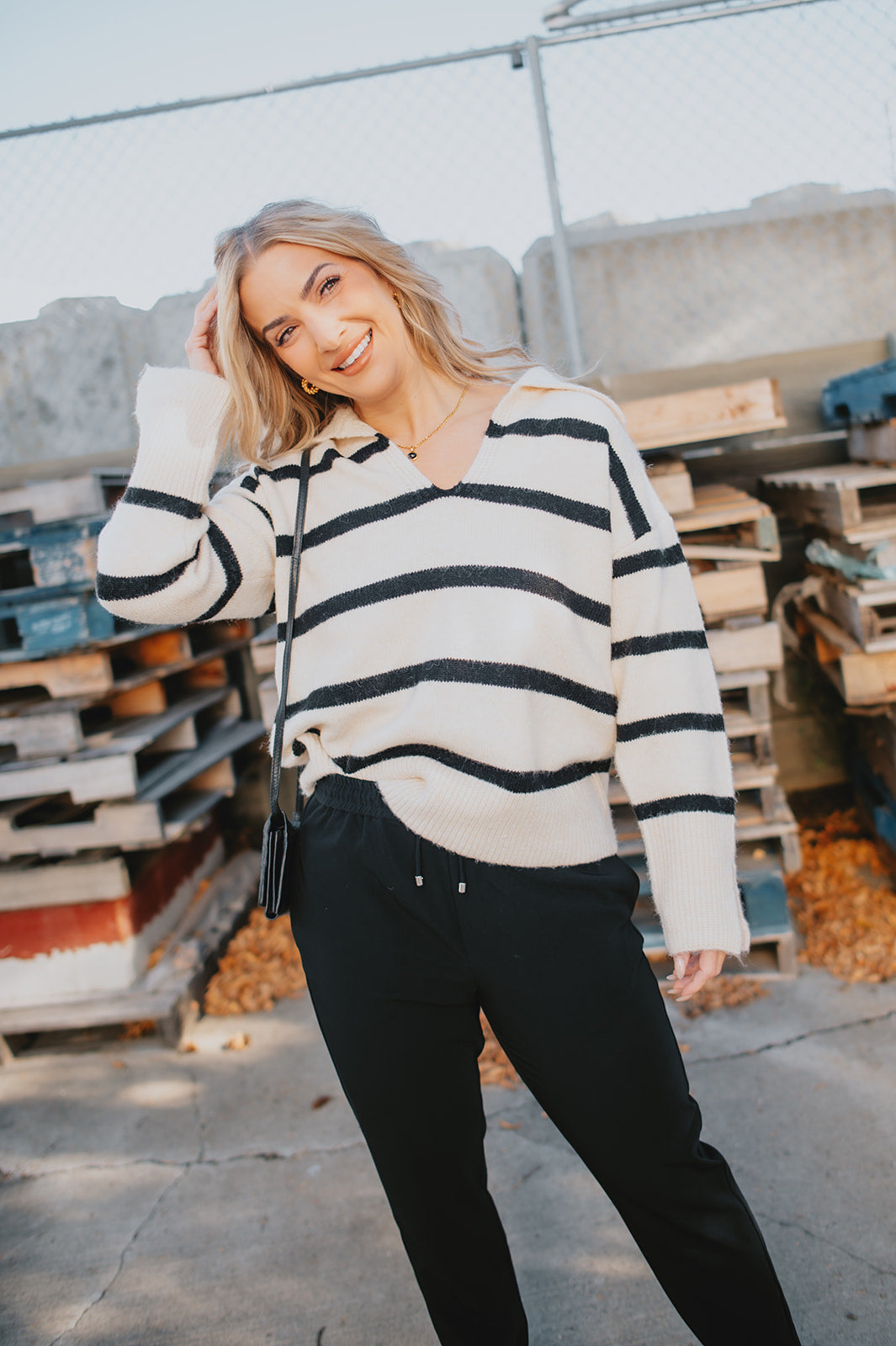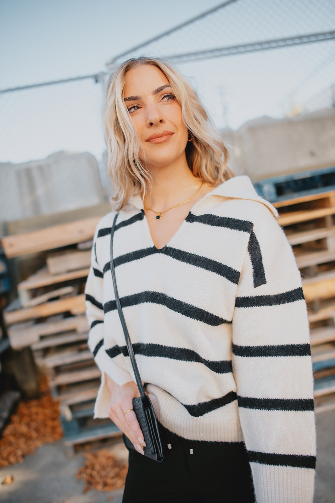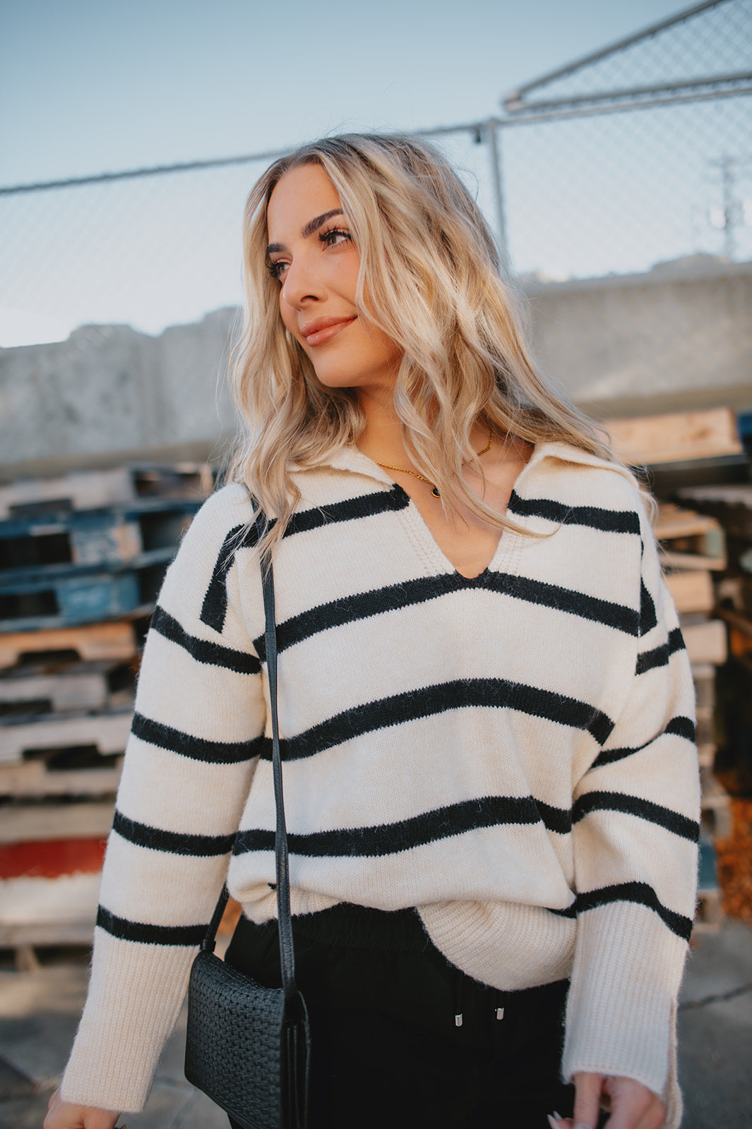 Effortlessly cool with a timeless twist, the Parisian Striped Knit Sweater brings classic style into the now. Designed in a polo-inspired silhouette, it features a sharp shirt collar and a flattering V-neckline that adds a touch of sophistication to it's casual charm.
