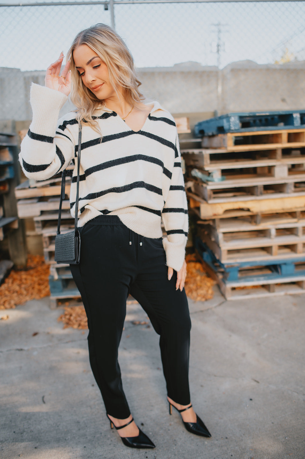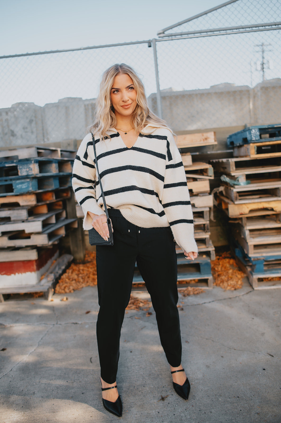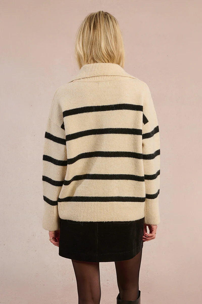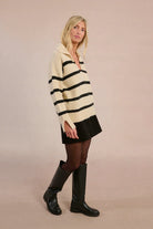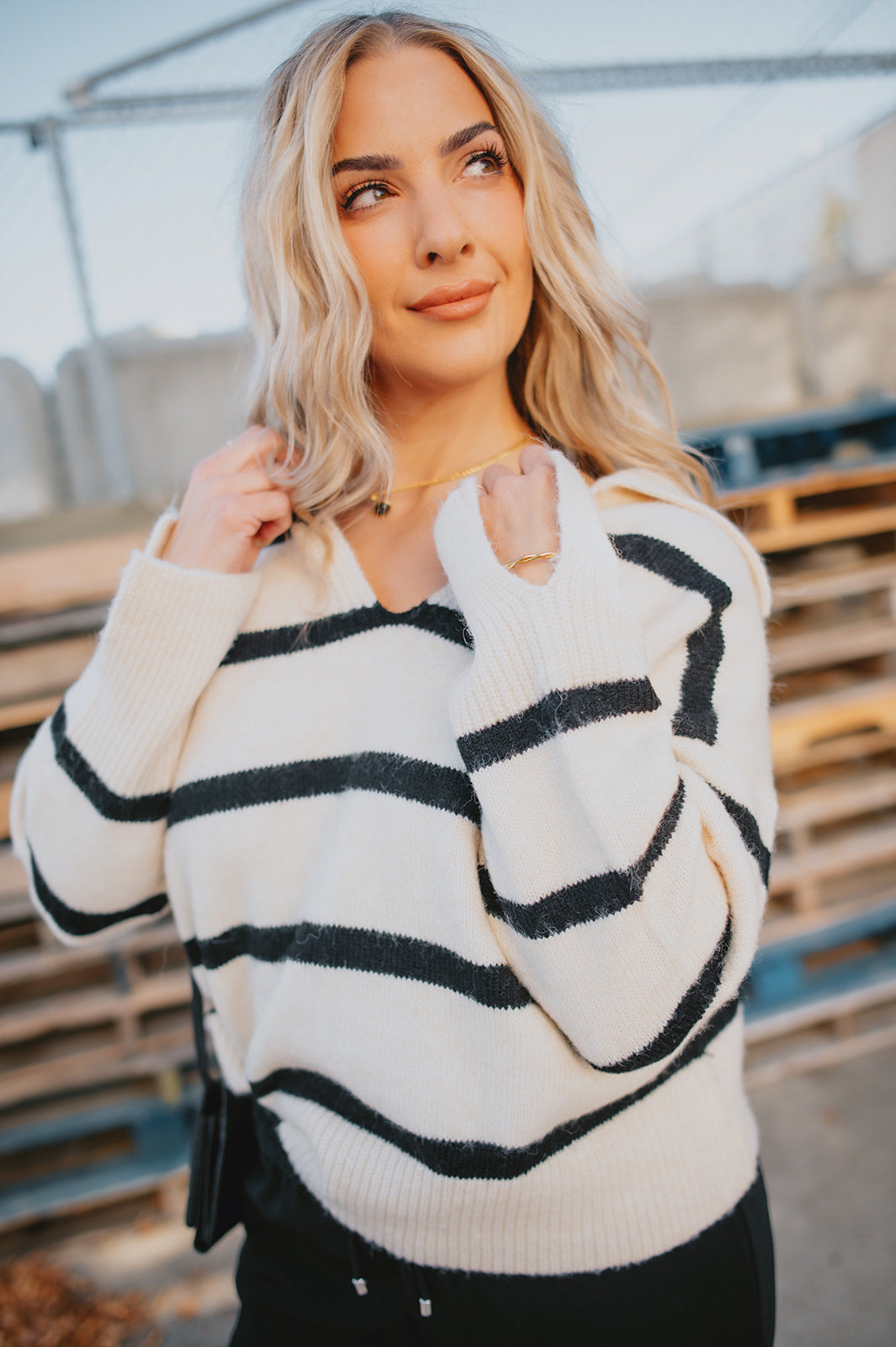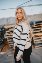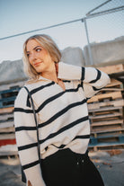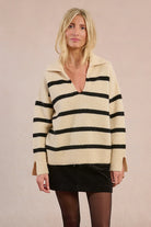 Effortlessly cool with a timeless twist, the Parisian Striped Knit Sweater brings classic style into the now. Designed in a polo-inspired silhouette, it features a sharp shirt collar and a flattering V-neckline that adds a touch of sophistication to it's casual charm.