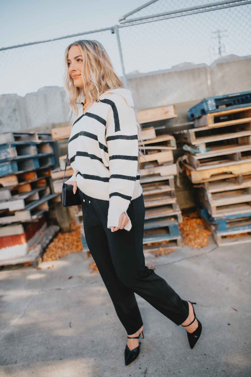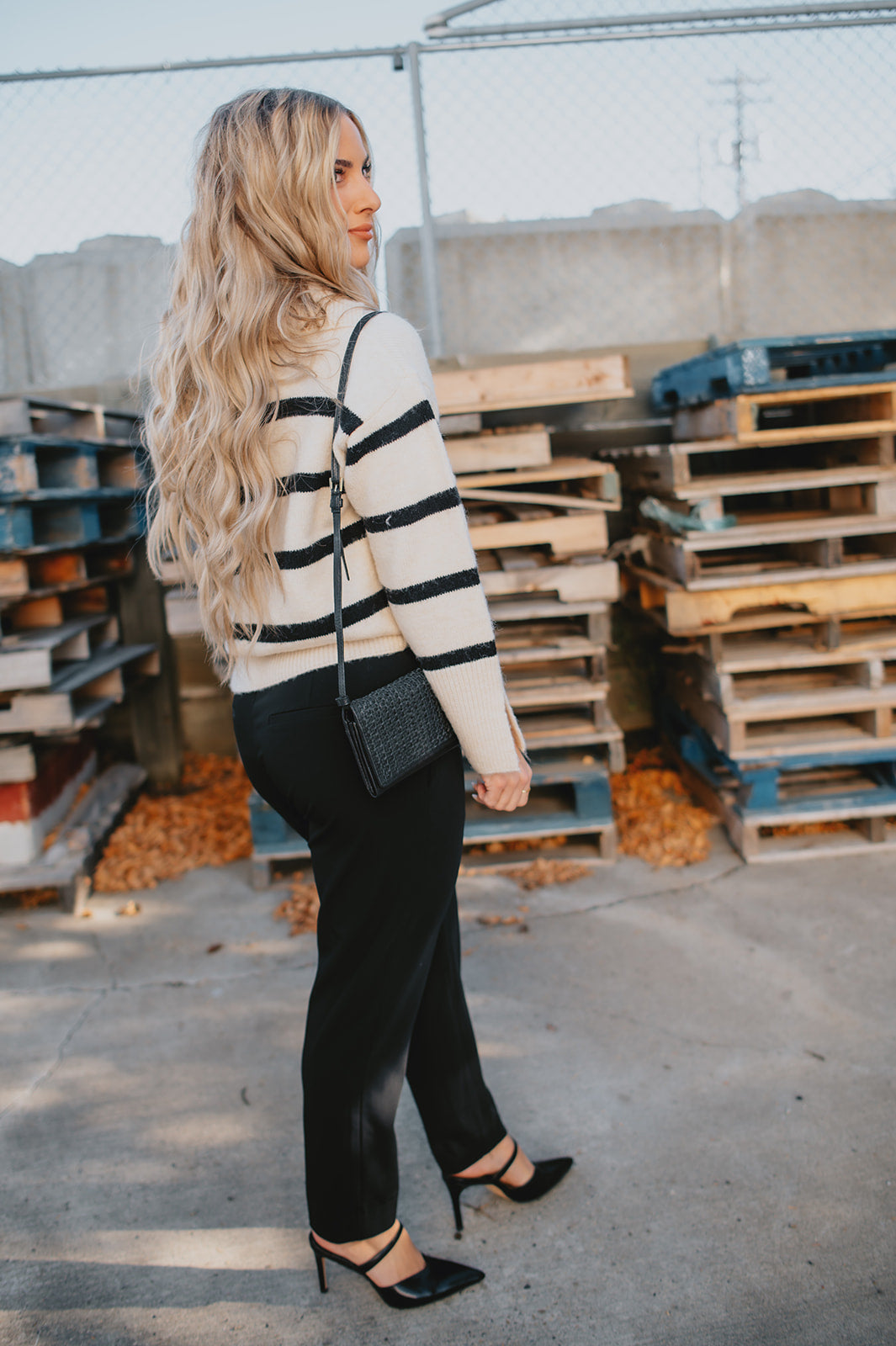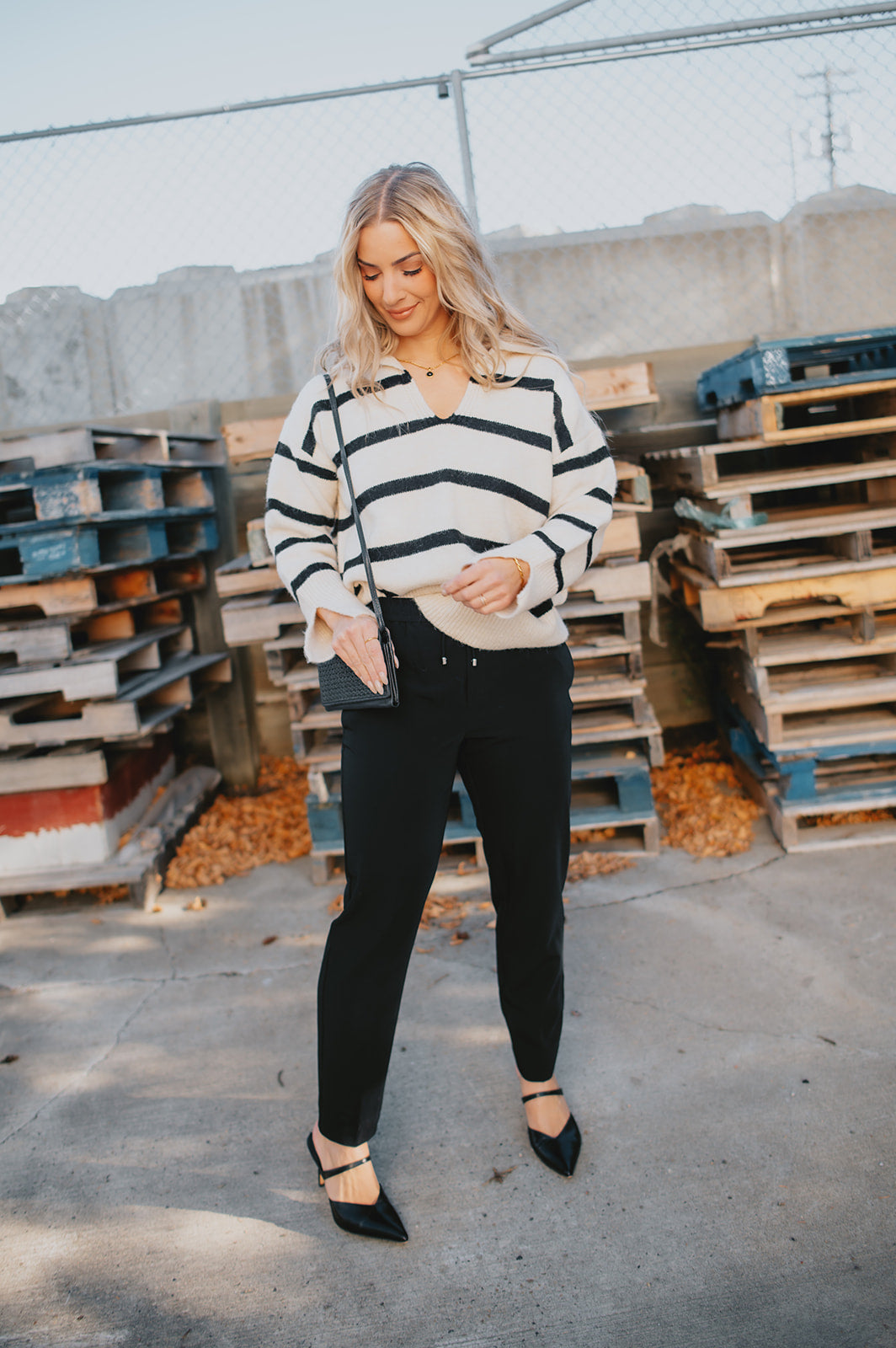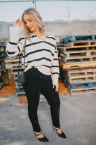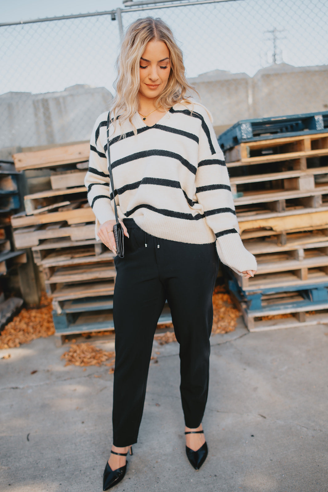 Effortlessly cool with a timeless twist, the Parisian Striped Knit Sweater brings classic style into the now. Designed in a polo-inspired silhouette, it features a sharp shirt collar and a flattering V-neckline that adds a touch of sophistication to it's casual charm.
