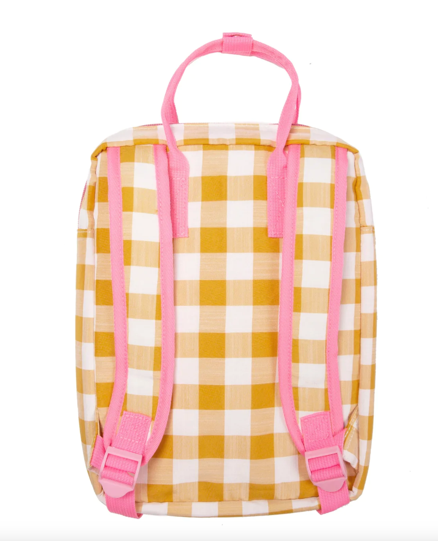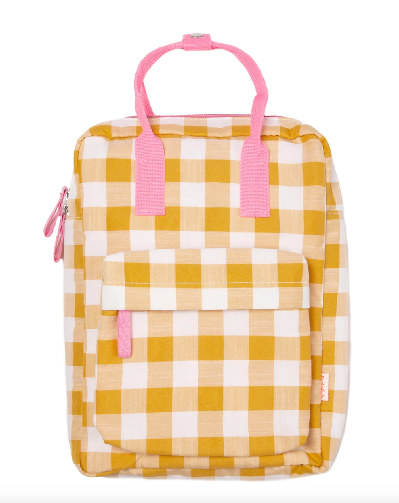 Get out and about in style with our gorgeous check backpack! This backpack has carry handles, a front zip pocket and adjustable straps. Made from our gorgeous yellow woven check fabric, with a zip closure and wipe clean lining.