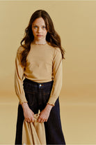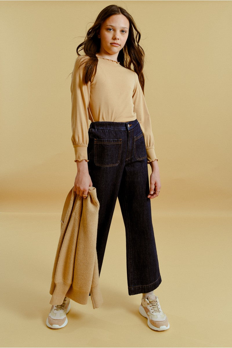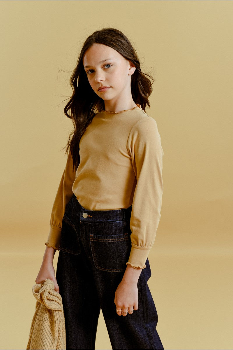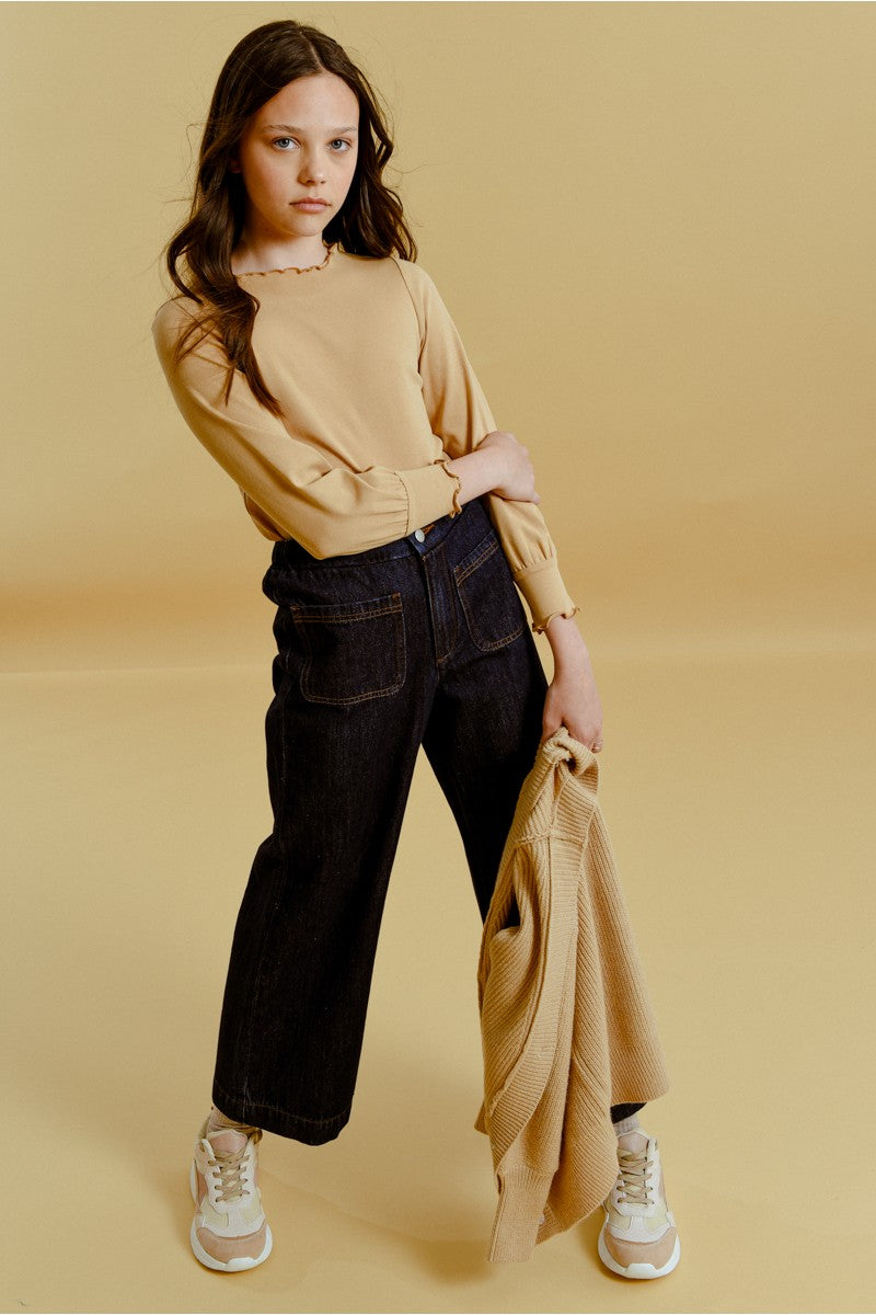 A thin cotton under sweater for your sweet little lady. Crewneck flouncy, long sleeves accompanied with a gorgeous ruffle on wide cuffs.