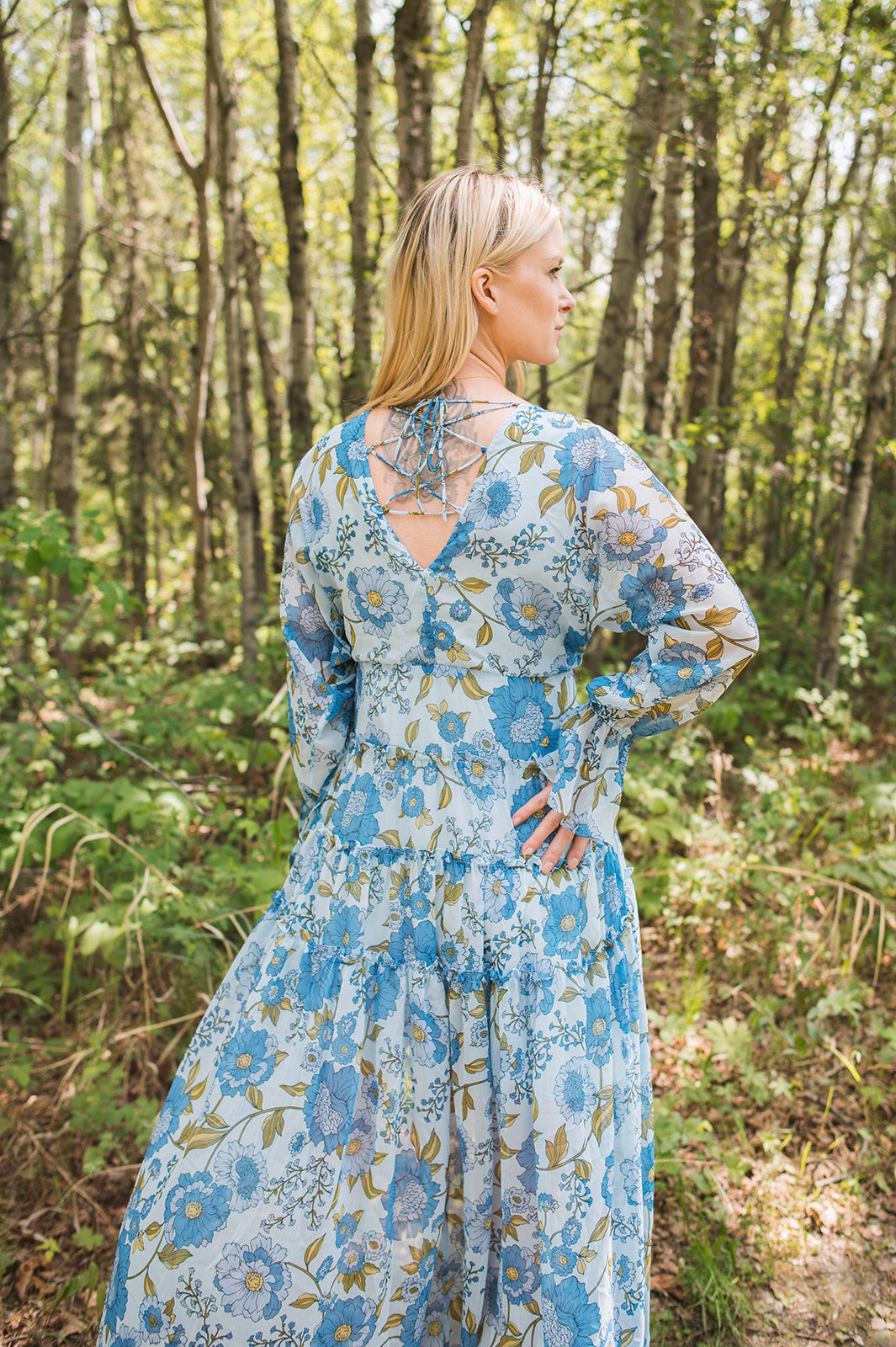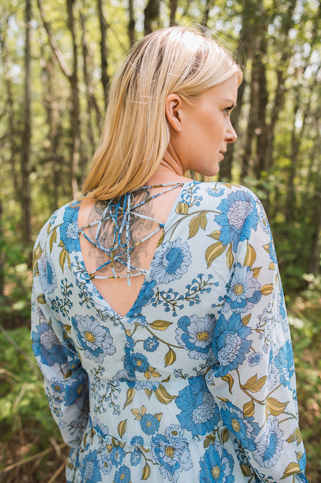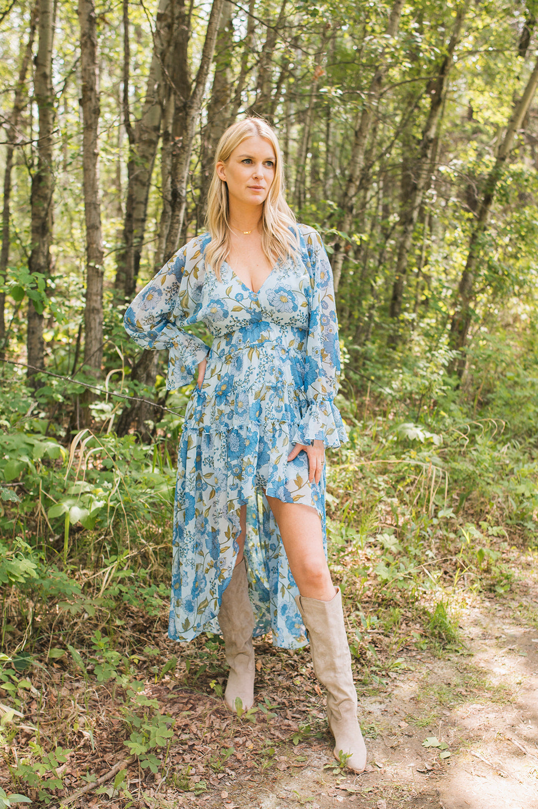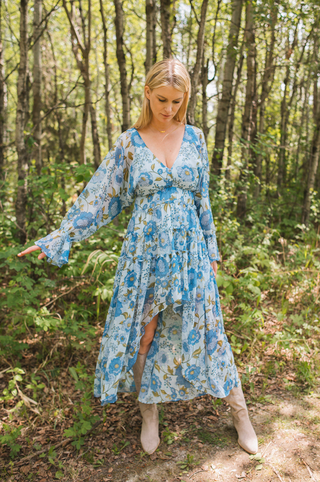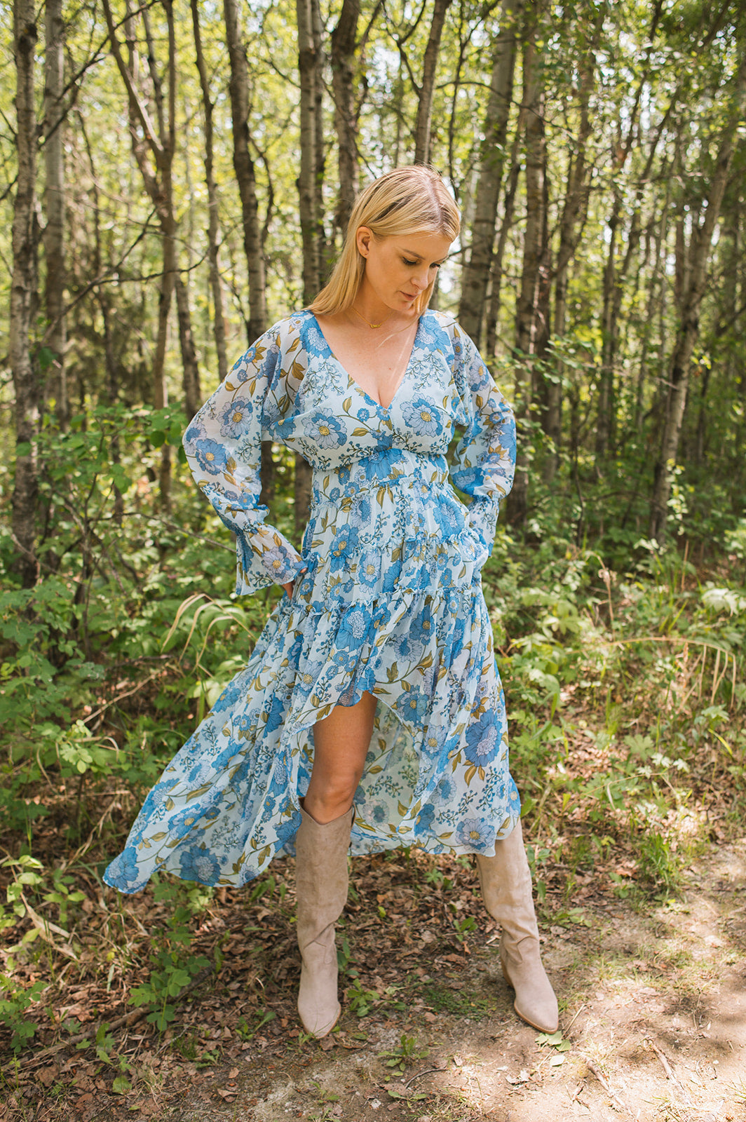 This light weight floral dress is a gorgeous addition to your closet for the warm weather. This dress features a high-low bottom and loose sleeves that cinch in on the wrists along with at the waist. The perfect dress for the warm weather!