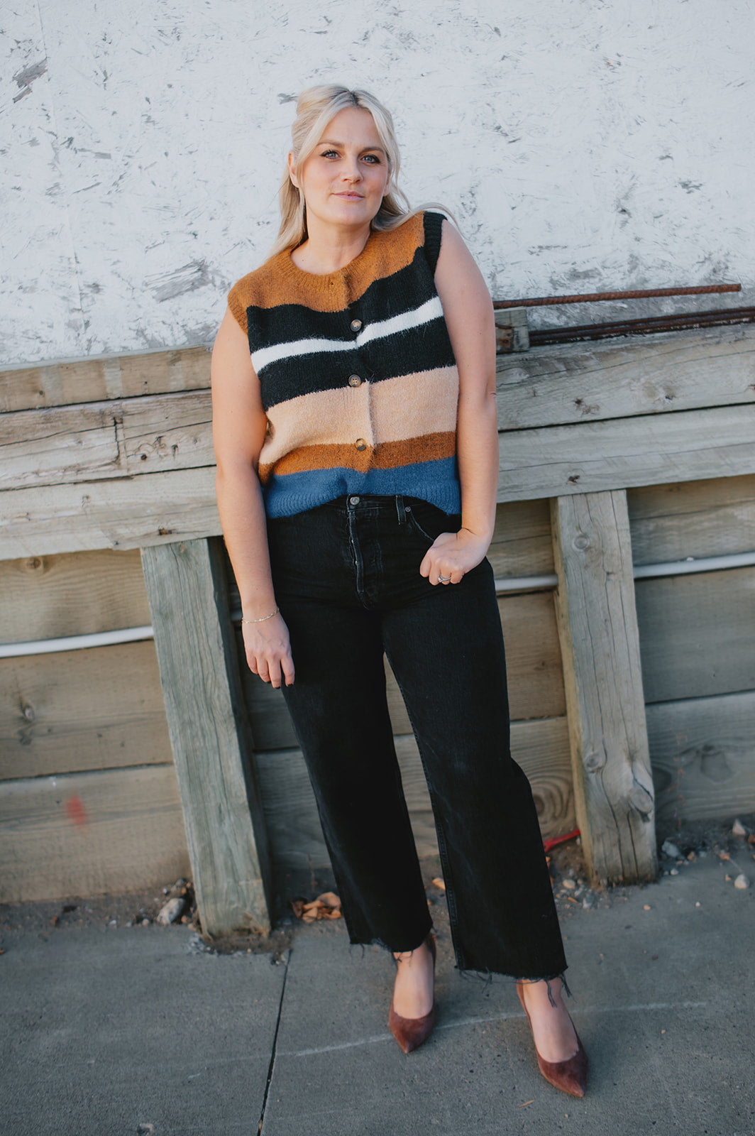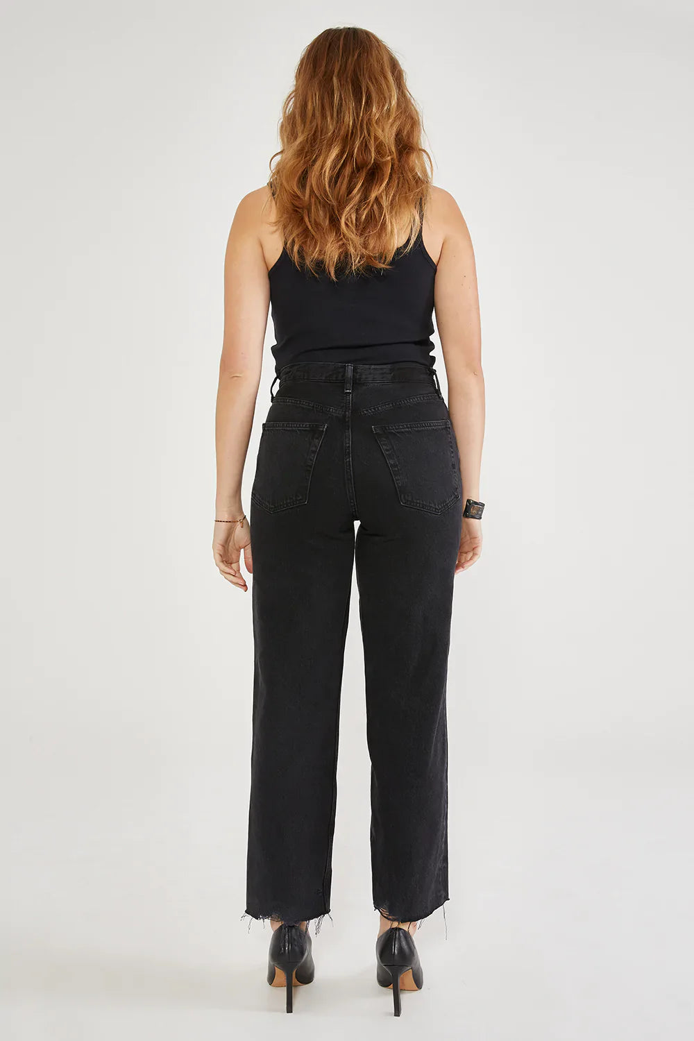 A high-rise straight with authentic vintage styling. Fitted through the hip, easy in the thigh, then straight down to a raw hem just above the ankle.