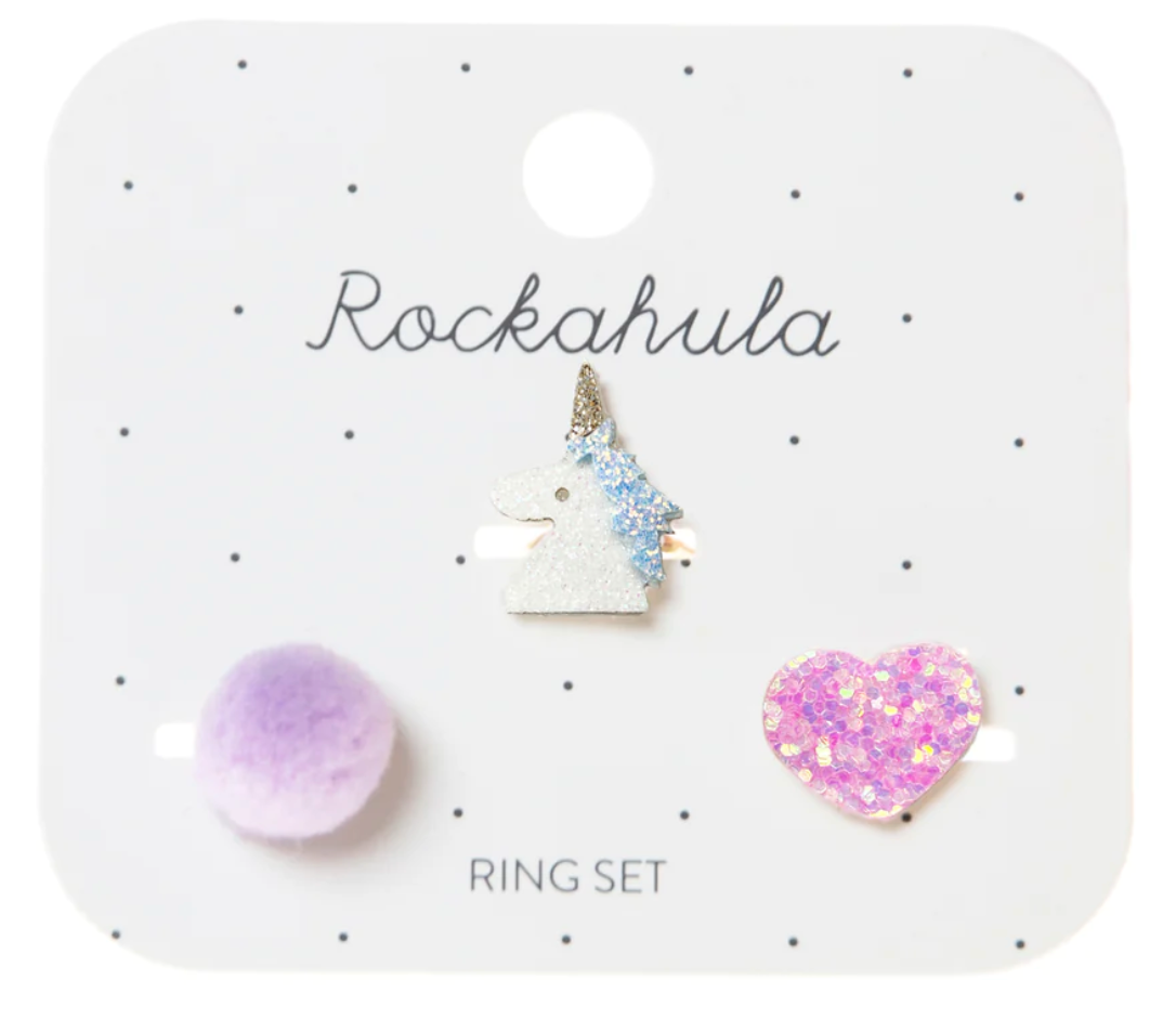 We believe in unicorns! And so can you, with our glittery jewellery sets! A beautiful set of three rings, featuring our glittery unicorn, a pink iridescent heart and a lilac pom pom. Each ring is adjustable for little fingers.