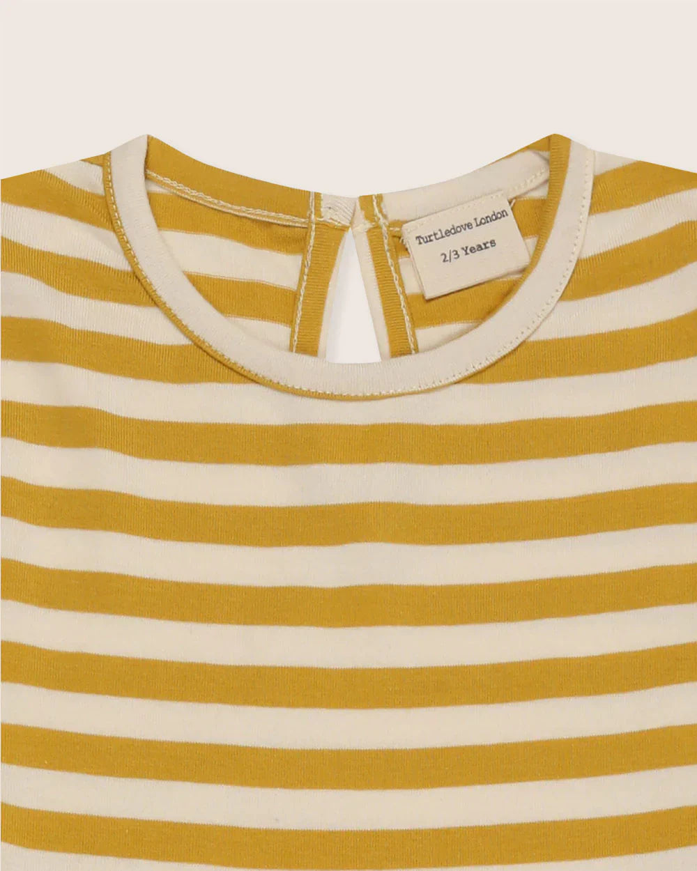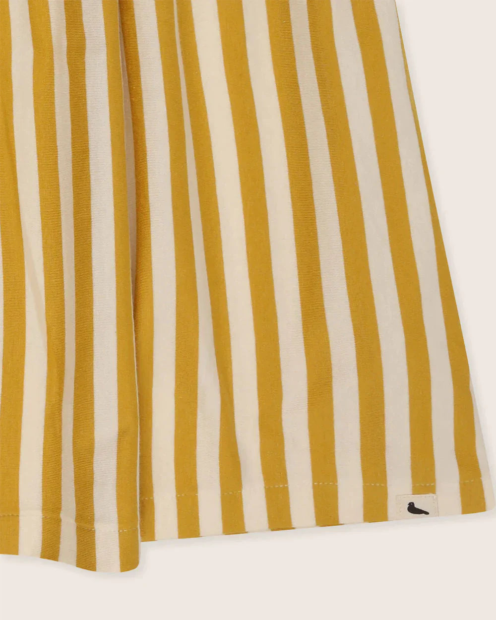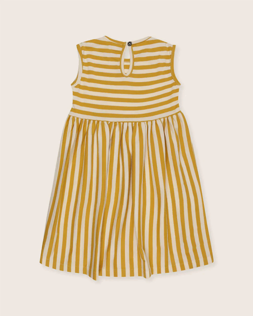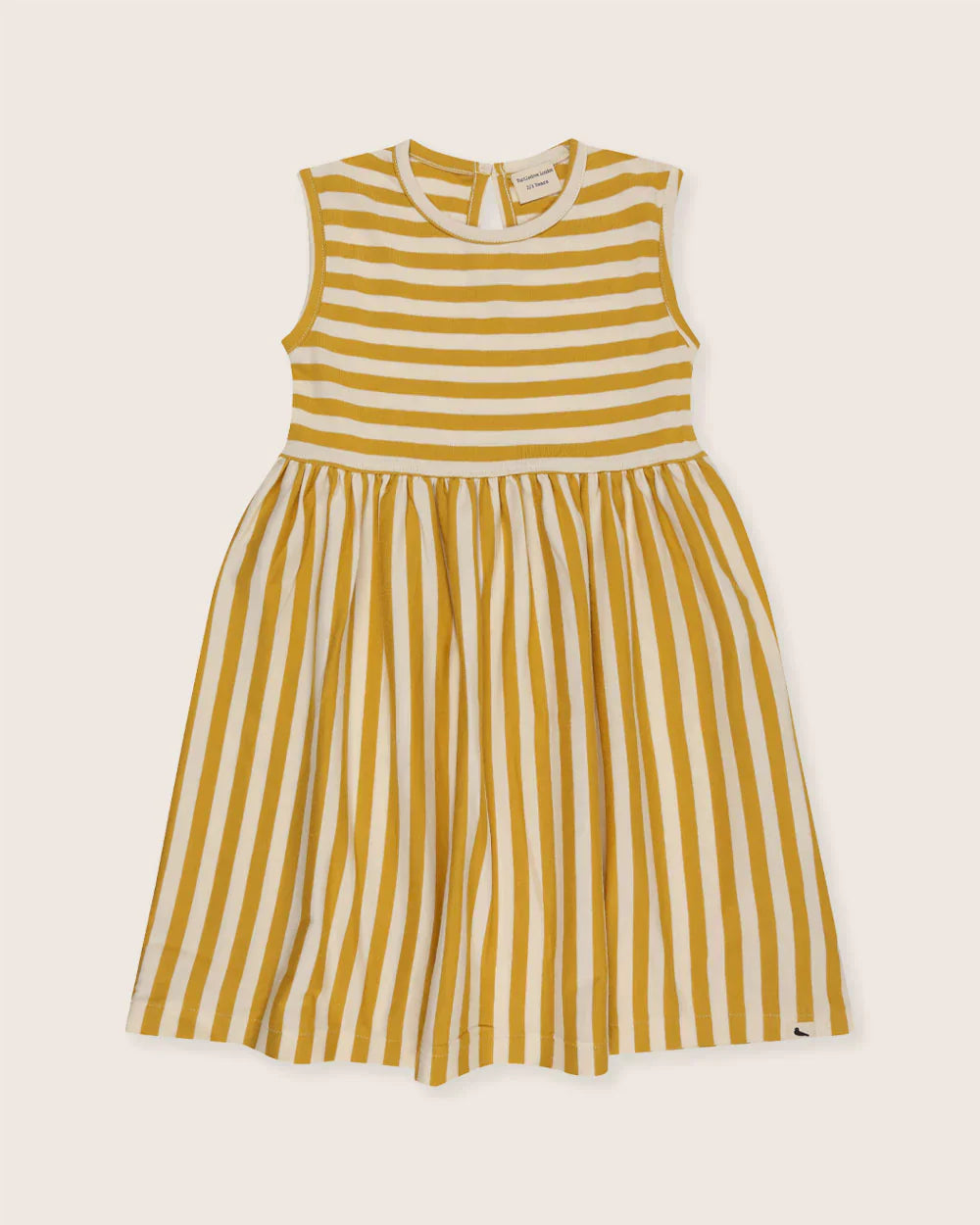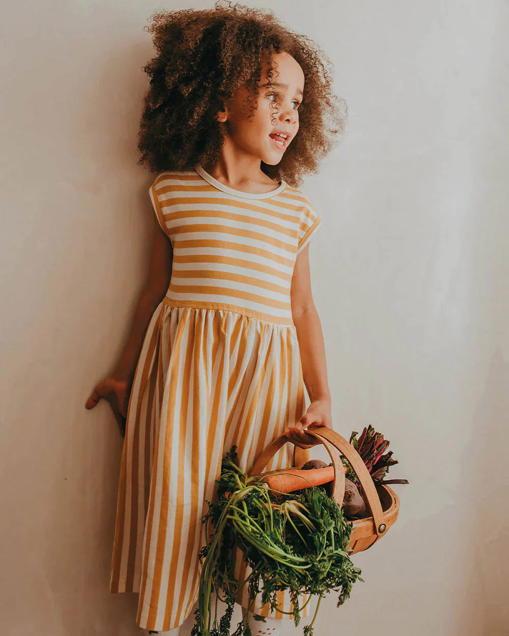 This gorgeous contemporary midi dress is perfect for picnics by the beach, special occasions and everything in between! Designed with longevity & sustainability in mind, this sleeveless kids dress featuring a Wide Stripe Mustard Pattern is great for non-seasonal styling. Soft gathering to the waist adds a pretty finish and silhouette. Wear alone or pop on some socks for a fun yet timeless look.