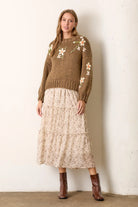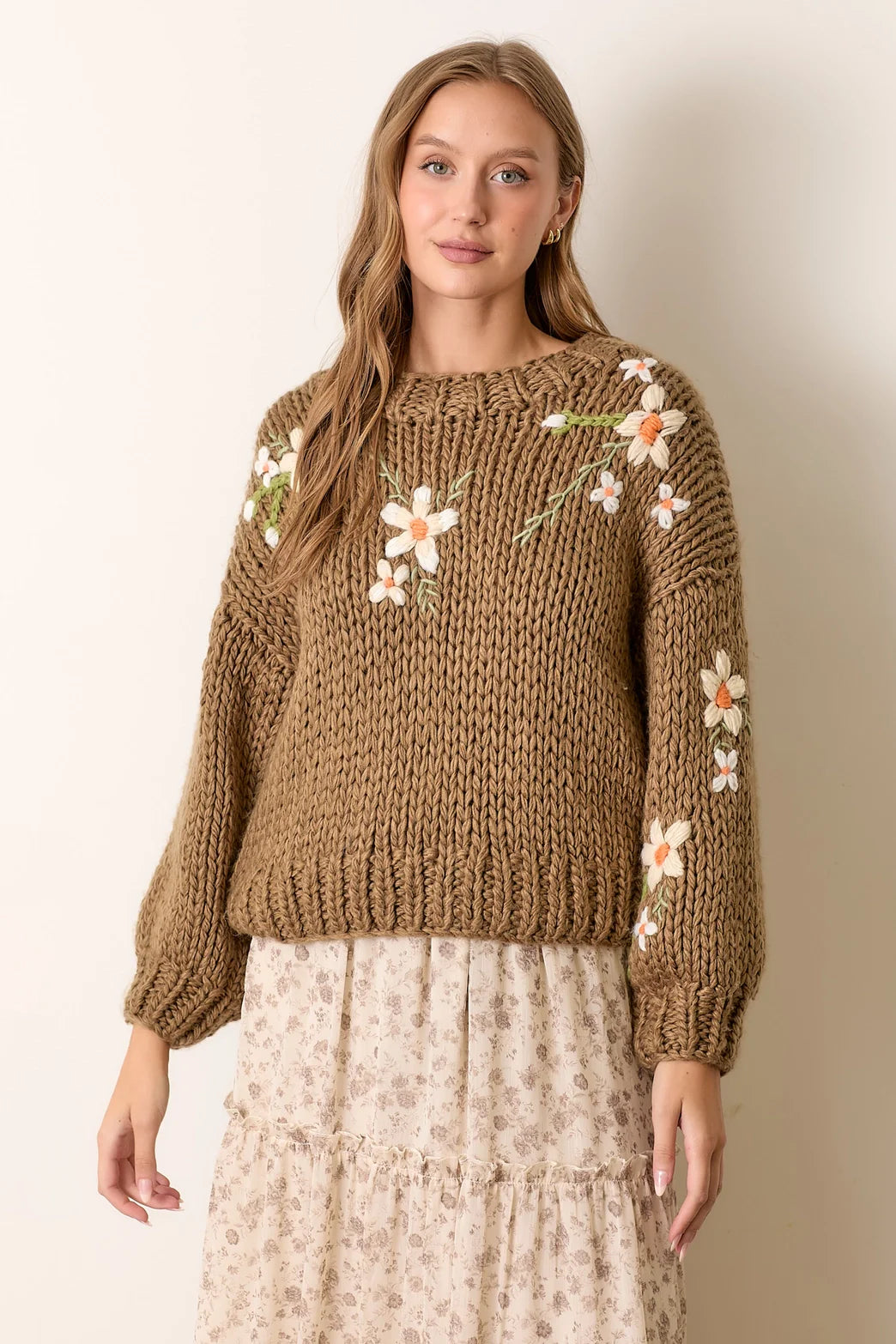 The Wren Embroidered Floral Sweater is a cozy yet elegant piece, featuring delicate white embroidered blooms for a cute and timeless touch. Designed with a wider round neck, dropped shoulders, and slight balloon sleeves, it offers a relaxed fit for effortless style. Crafted from a soft acrylic knit, this sweater is as comfortable as it is stylish, perfect for everyday wear!